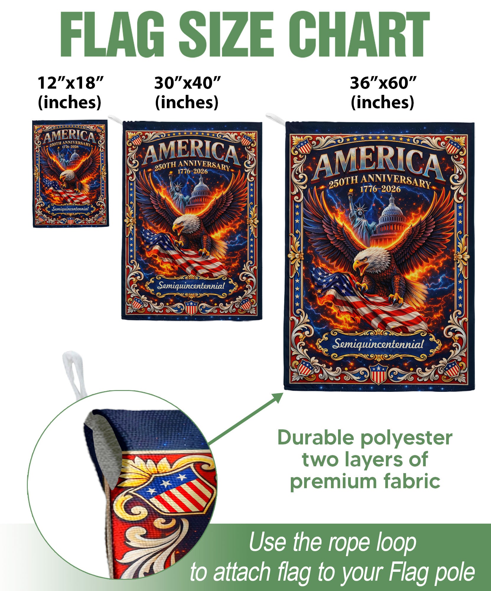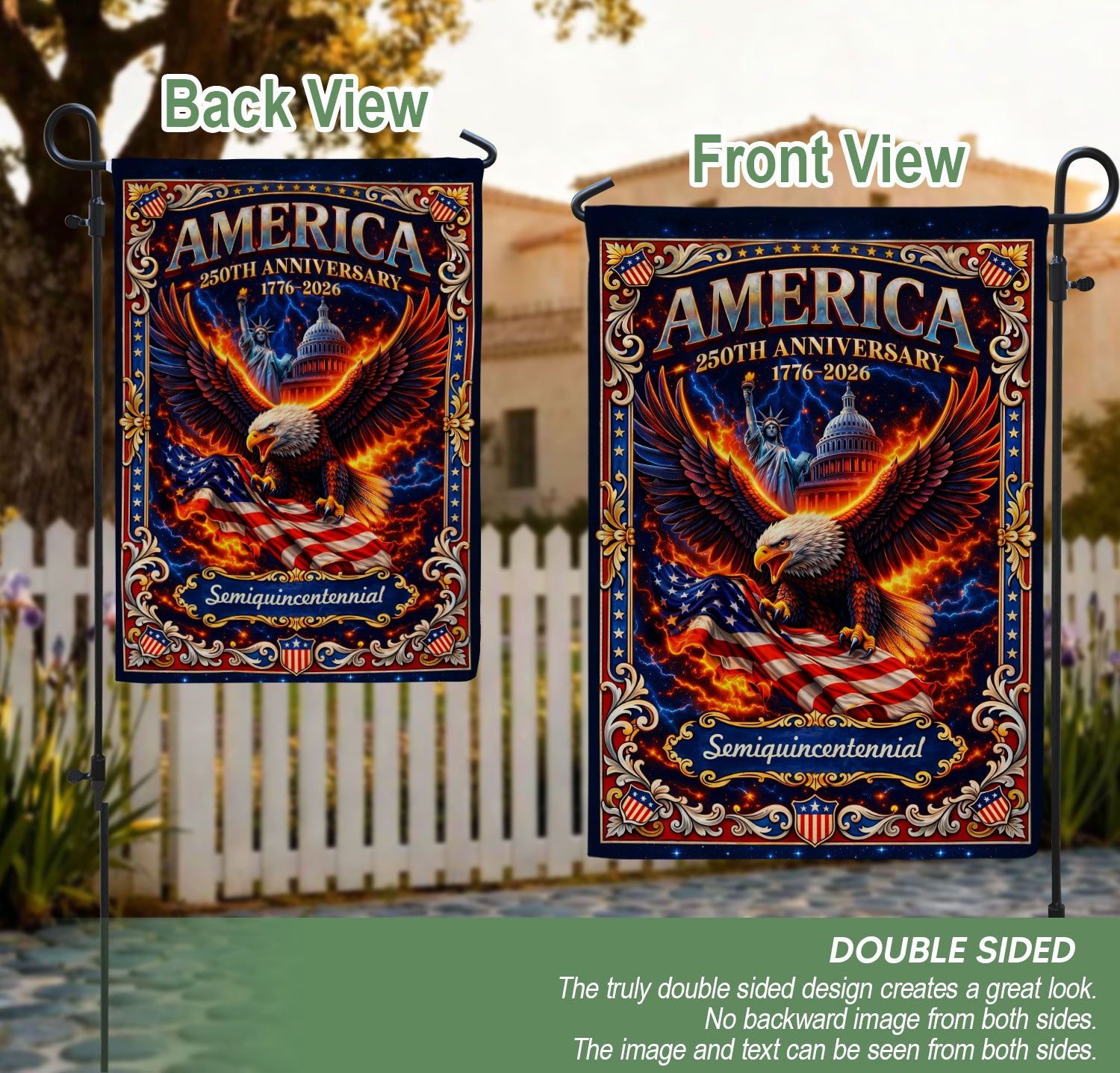 Celebrate America’s 250th anniversary from 1776 to 2026 with this striking double-sided house flag. Featuring a majestic bald eagle soaring above the iconic United States Capitol and the Statue of Liberty, this banner embodies national pride, unity, freedom, and strength. Perfect for displaying on porches, gardens, or flagpoles to honor the nation’s enduring legacy. Crafted for durability and vivid colors that withstand outdoor conditions, it’s an ideal patriotic decoration for holidays, Independence Day, or everyday display. Double-sided printing ensures clear visibility from both sides.