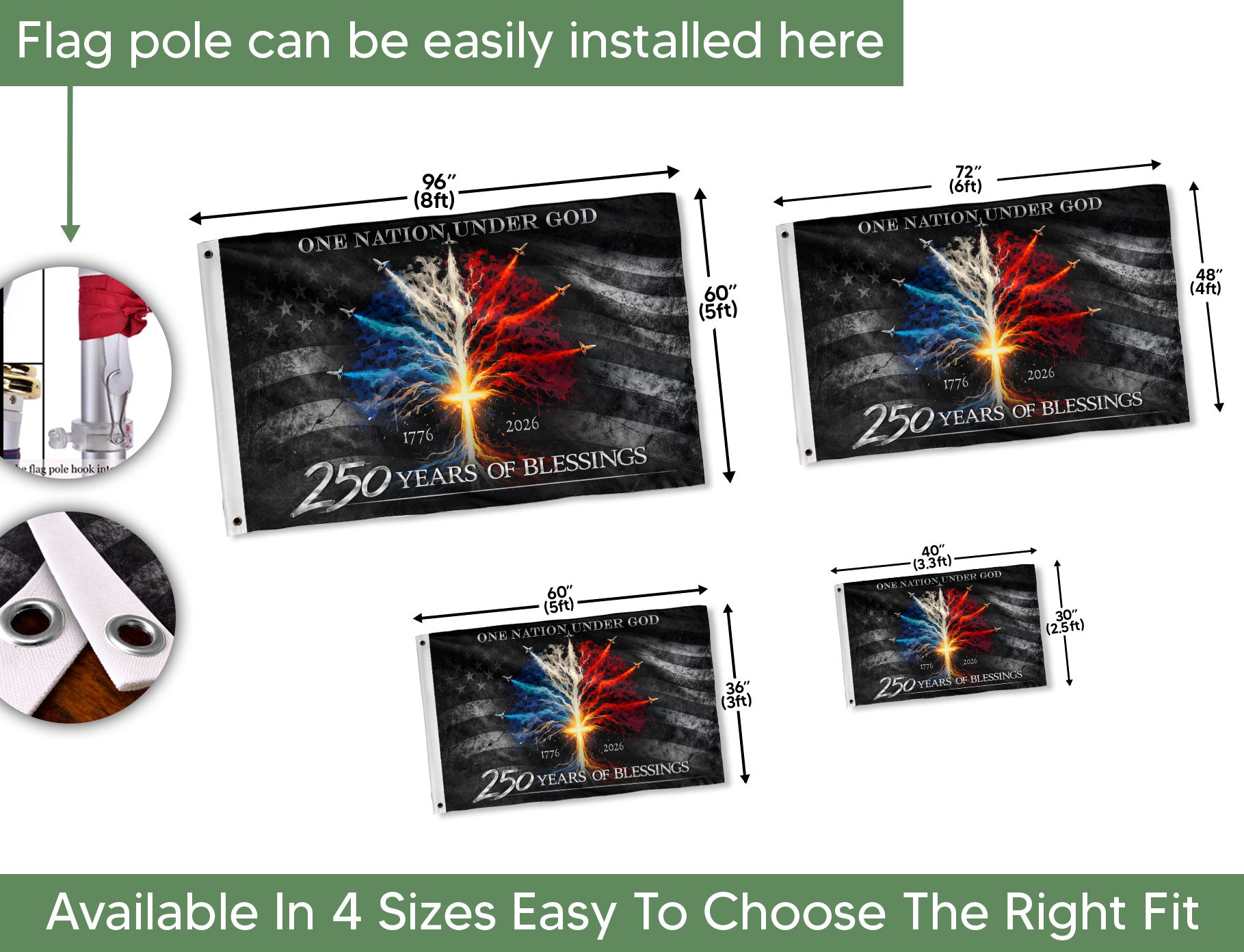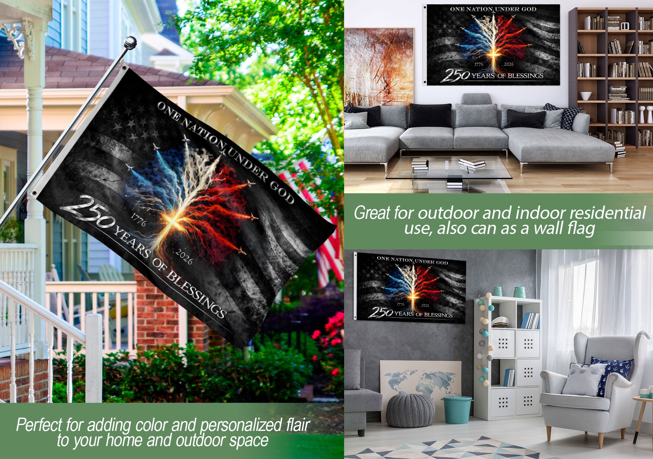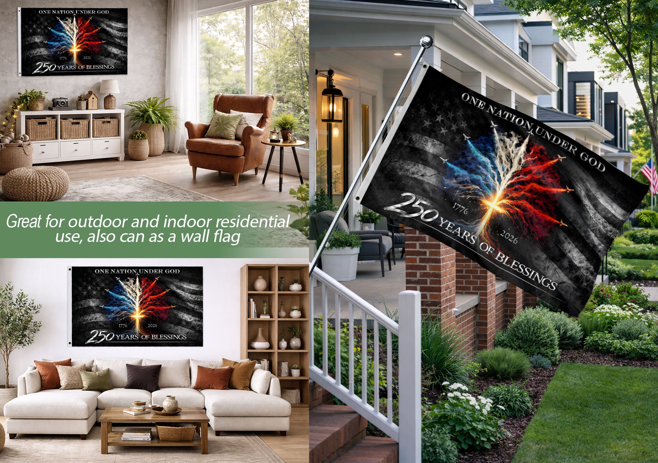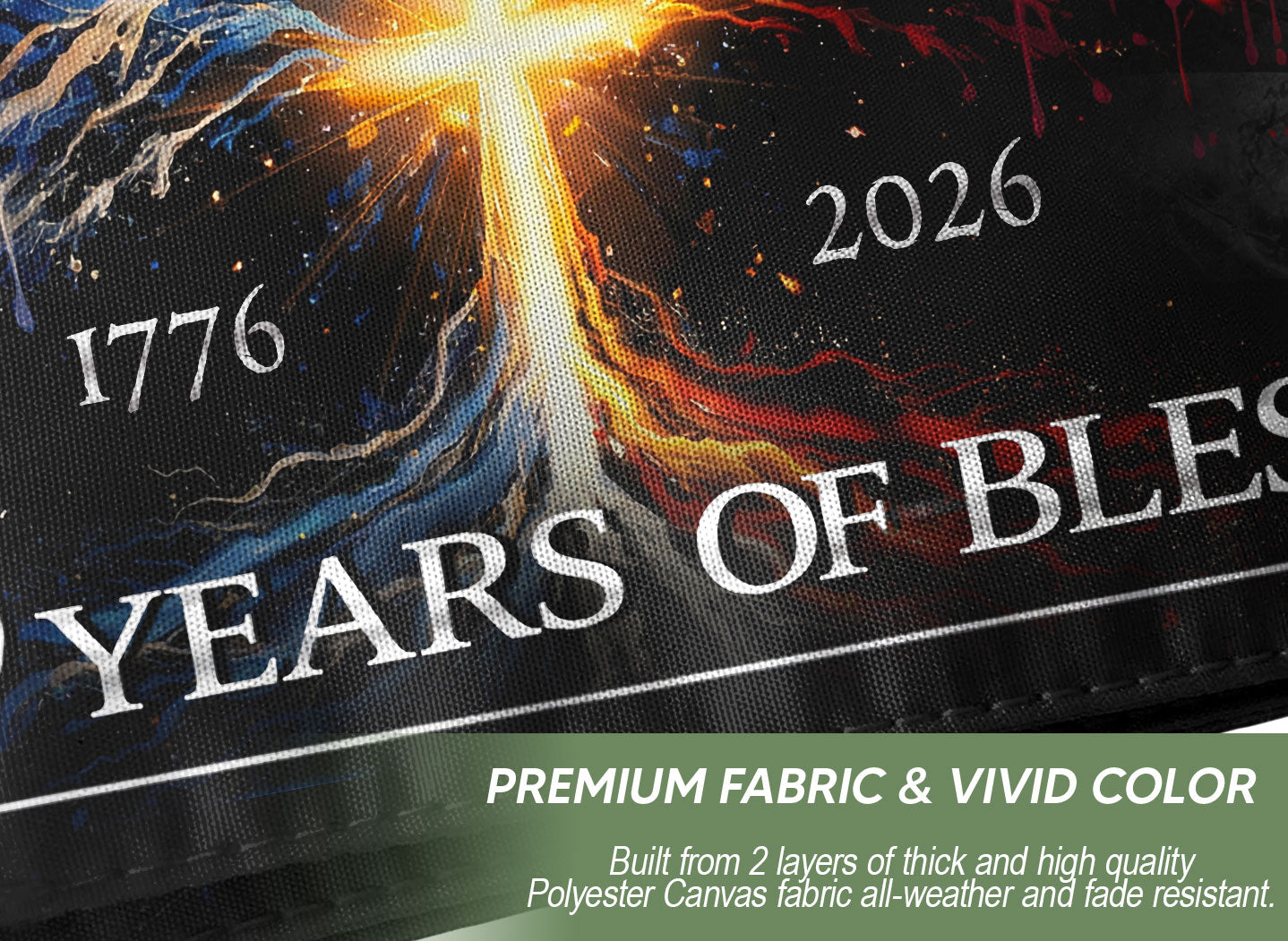 Celebrate America’s 250th anniversary from 1776 to 2026 with this striking double-sided Christian flag banner. Featuring a powerful cross tree design and dynamic jet fighters, it blends faith, patriotism, and national heritage. Perfect for indoor or outdoor display on homes, gardens, porches, or events honoring the USA’s journey. Durable construction ensures vibrant colors and long-lasting performance in various weather conditions. Ideal for showcasing unity, freedom, courage, and Christian values. Hang it proudly to tribute enduring American spirit and semiquincentennial milestone.