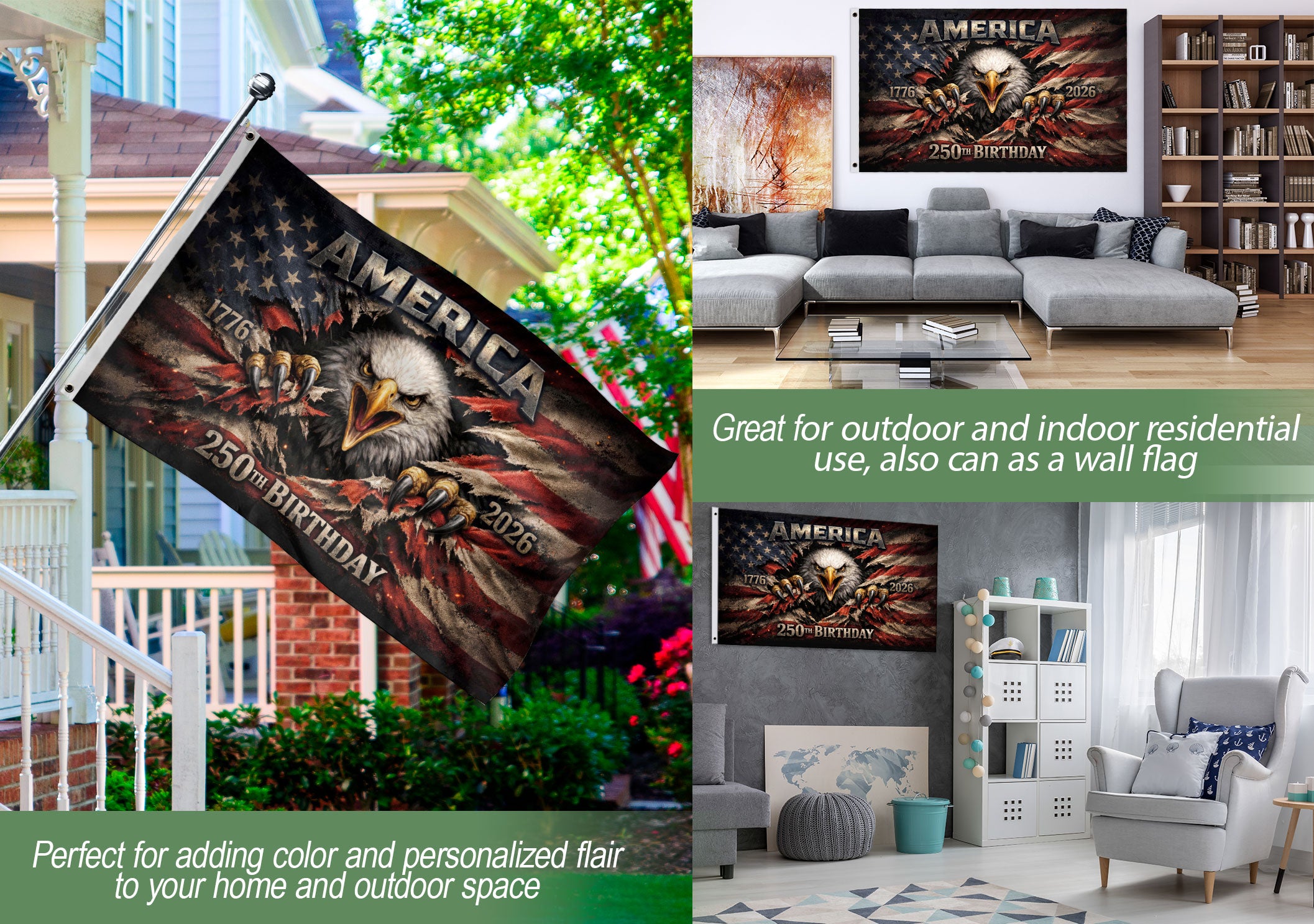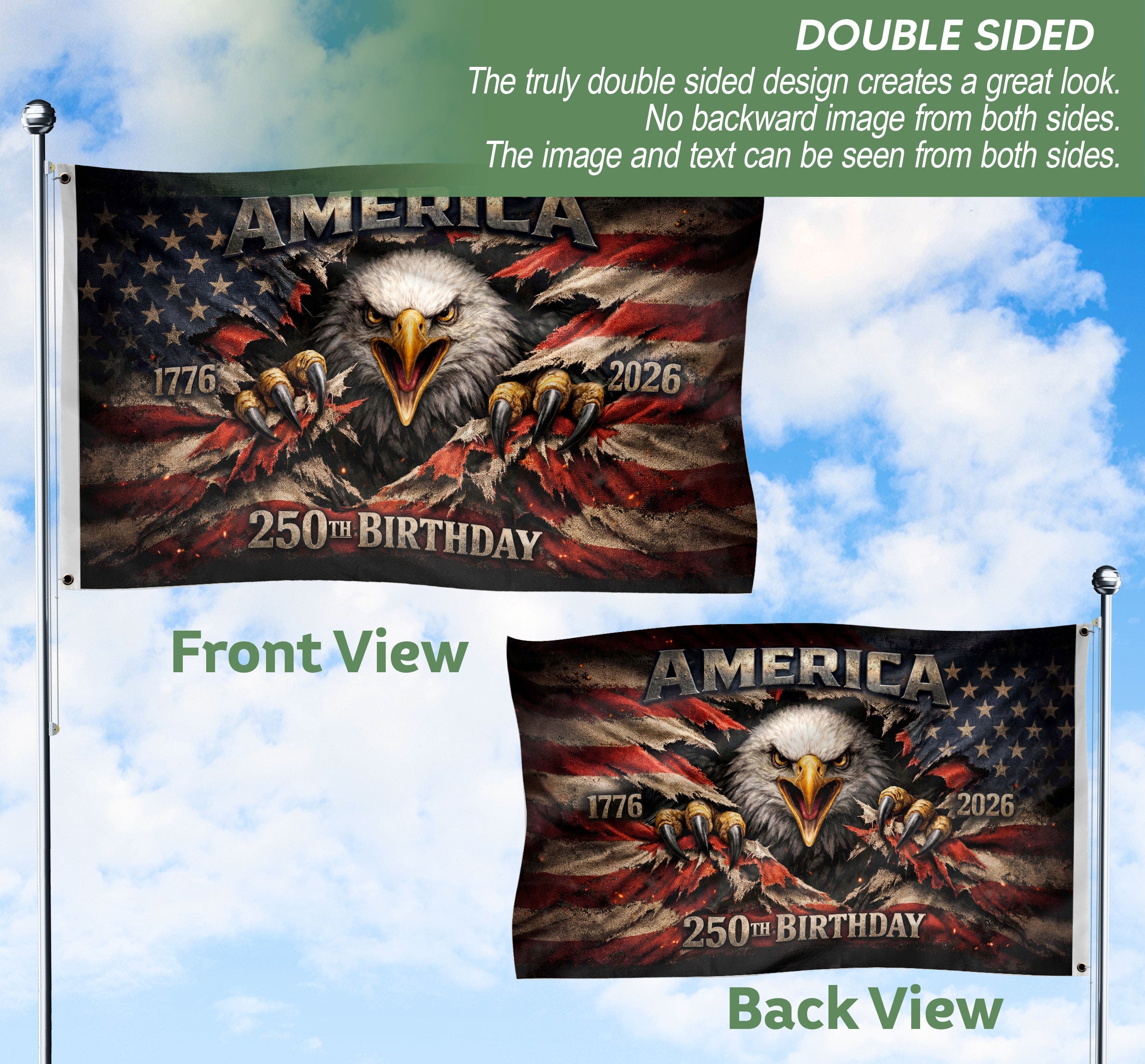 Celebrate America’s 250th anniversary from 1776 to 2026 with this patriotic double-sided house flag. Featuring a majestic eagle emblem on both sides, it proudly displays national pride and honors two and a half centuries of American history. Perfect for porches, gardens, or home displays during Independence Day, Memorial Day, or everyday patriotism. Durable construction ensures vibrant colors and clear graphics withstand outdoor conditions. Easy to hang with standard house flag hardware. Ideal for history enthusiasts, veterans, and proud Americans marking this historic milestone.