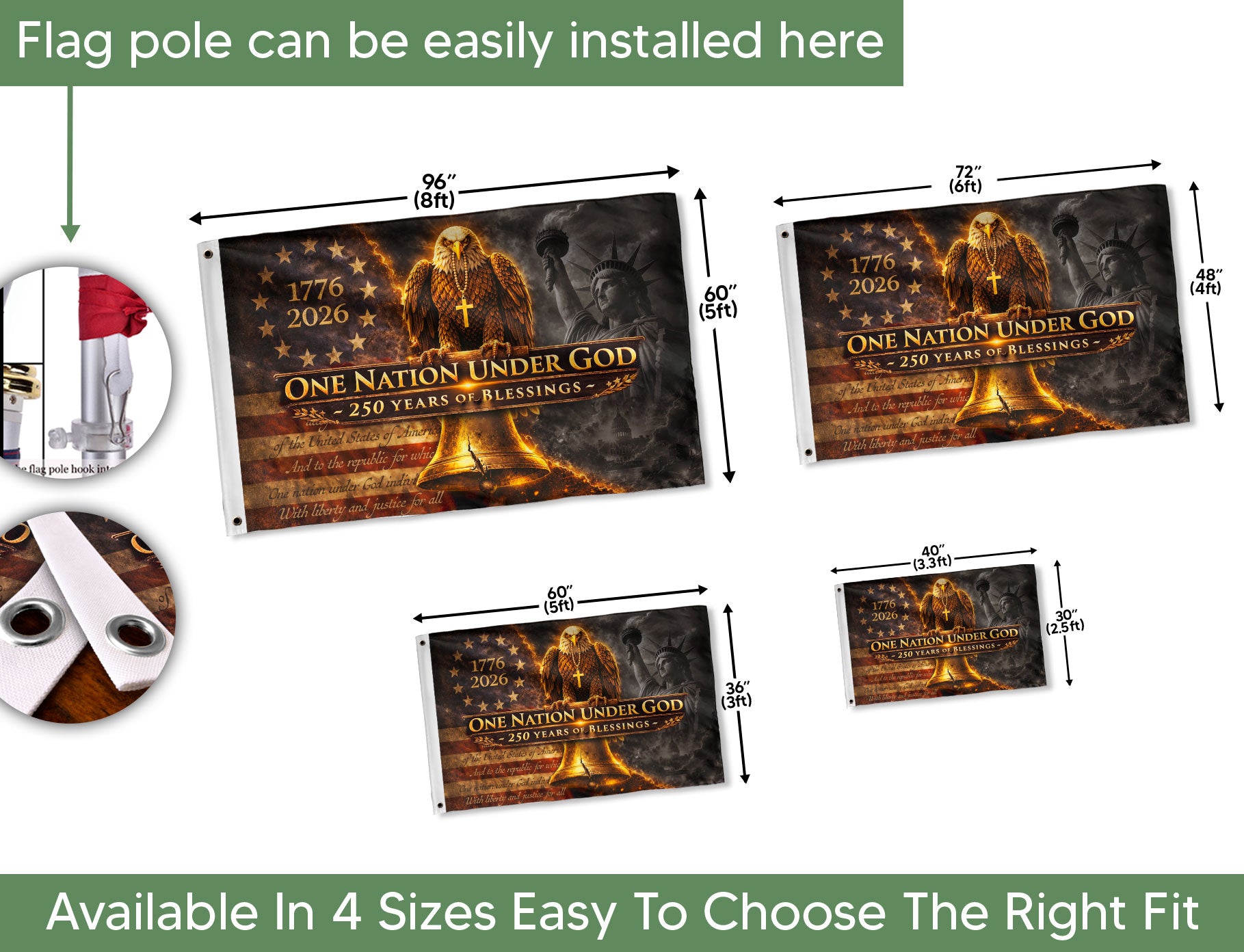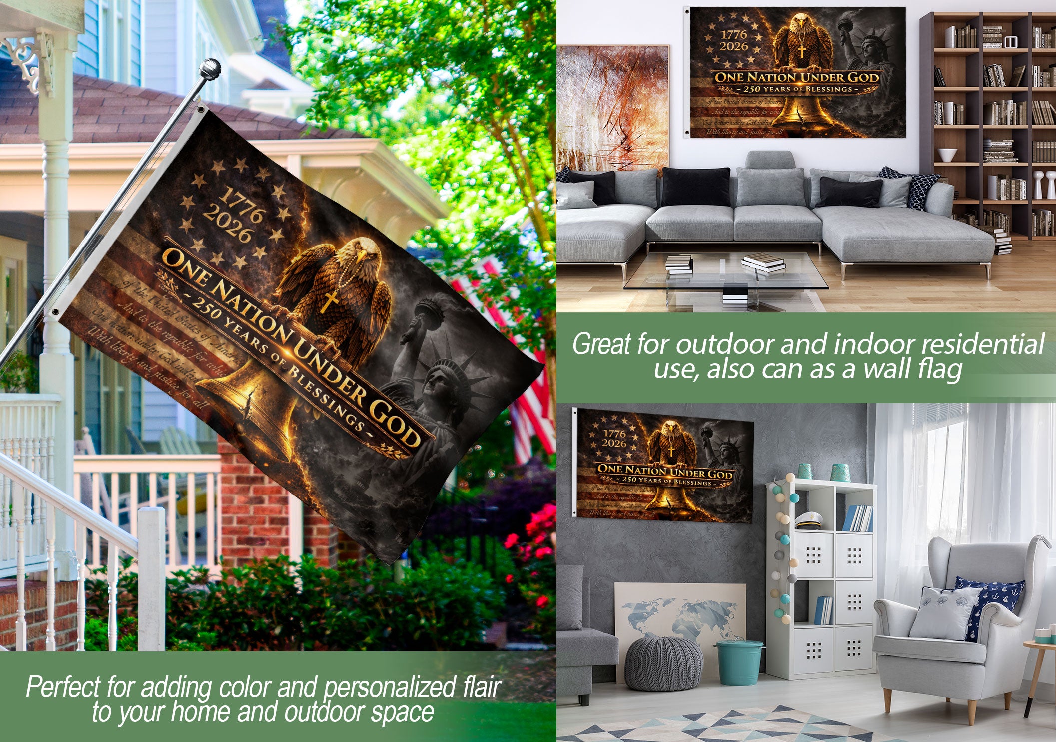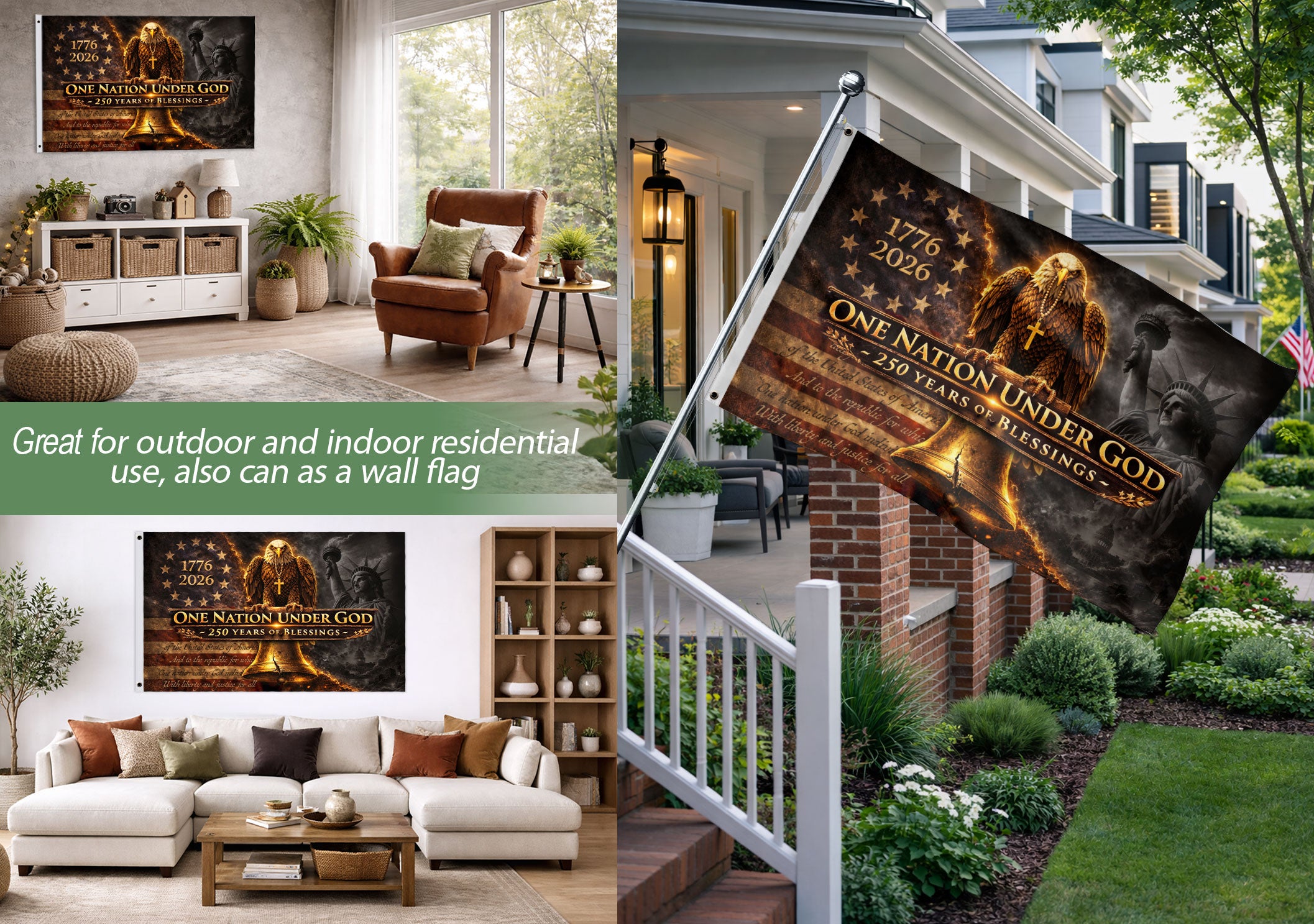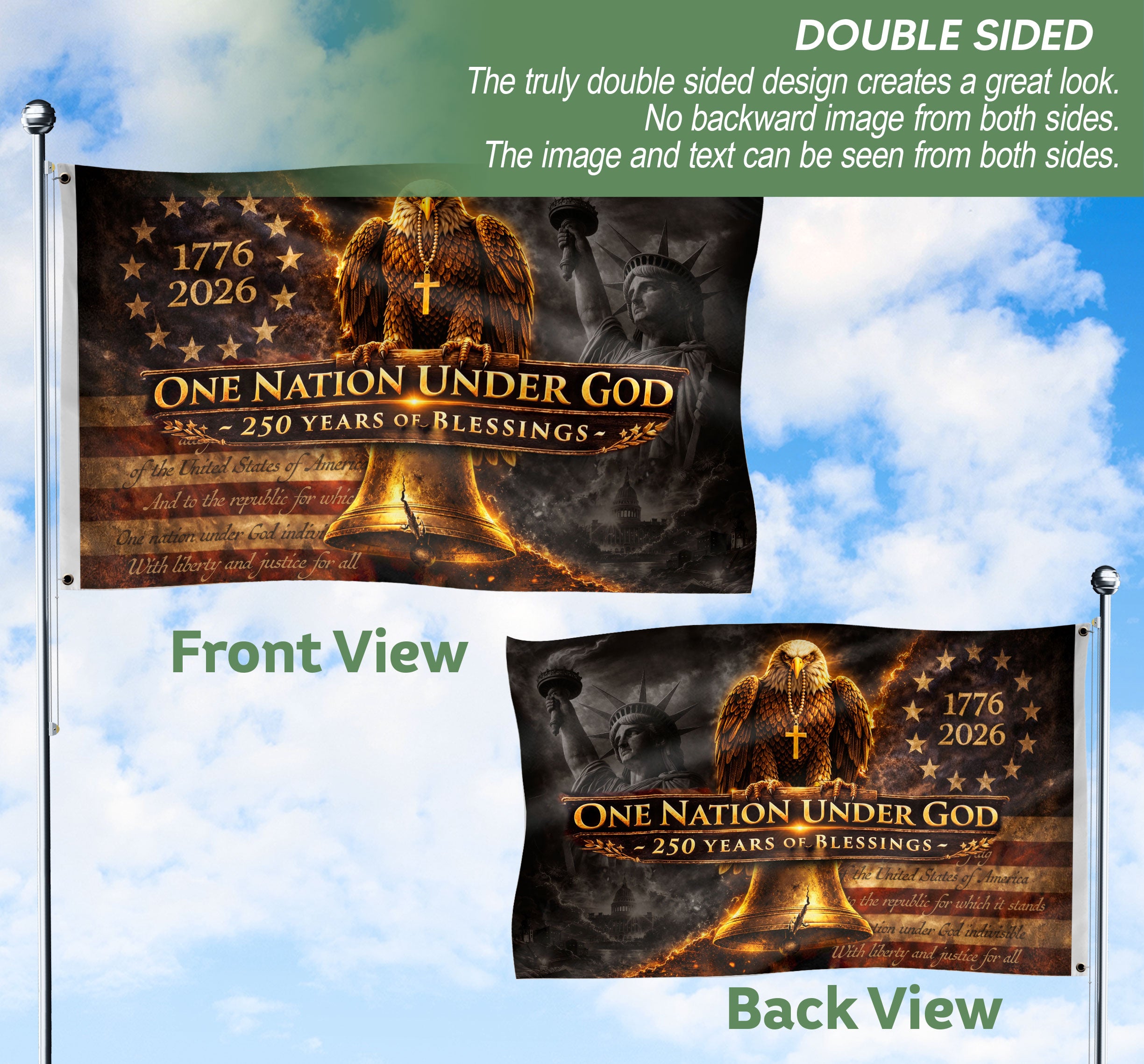 Celebrate 250 years of American heritage with this double-sided patriotic house flag commemorating 1776-2026. Featuring a powerful Christian message of blessings, a majestic eagle symbolizing freedom, and the iconic Liberty Bell representing enduring liberty and faith. Crafted for outdoor display, this durable house flag proudly showcases national pride and spiritual conviction on both sides. Perfect for porches, gardens, or flagpoles to honor the nation’s bicentennial-plus journey of faith and freedom. High-quality polyester material ensures vibrant colors and weather resistance for long-lasting use.