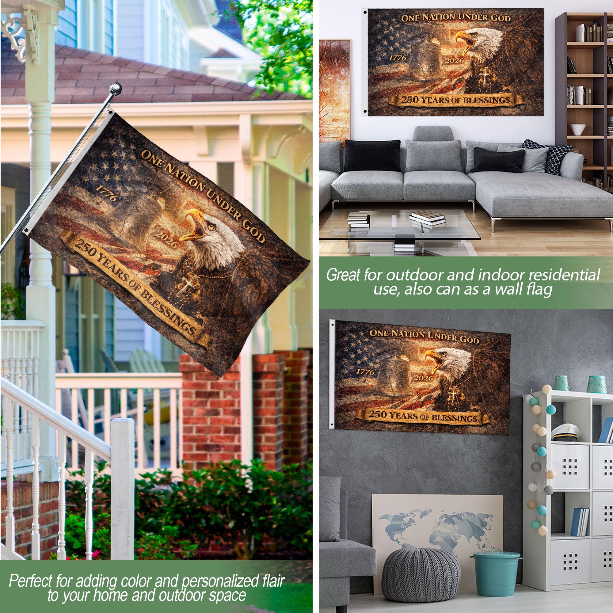 Celebrate 250 years of American independence with this double-sided banner featuring the USA flag, patriotic eagle, and Liberty Bell. Spanning from 1776 to 2026, it honors national pride, strength, and tradition. Perfect for patriotic home decor, Fourth of July events, parades, or outdoor displays. Durable construction ensures visibility from both sides, making it ideal for porches, garages, fences, or parties. High-quality print captures vibrant colors and intricate details of the iconic symbols. Easy to hang with reinforced grommets. A meaningful way to commemorate the semiquincentennial milestone.