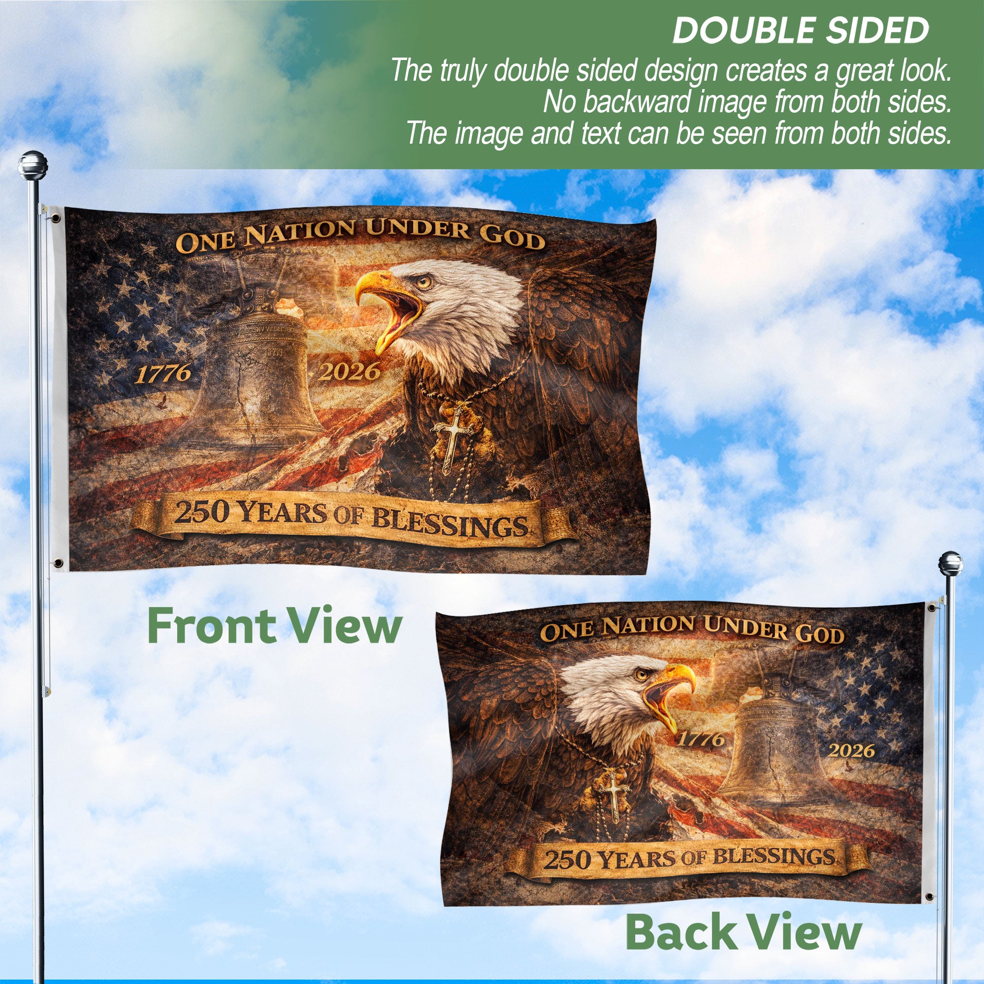 250 Years of Blessings USA Flag Double-Sided Banner with Patriotic Eagle and Liberty Bell 1776-2026