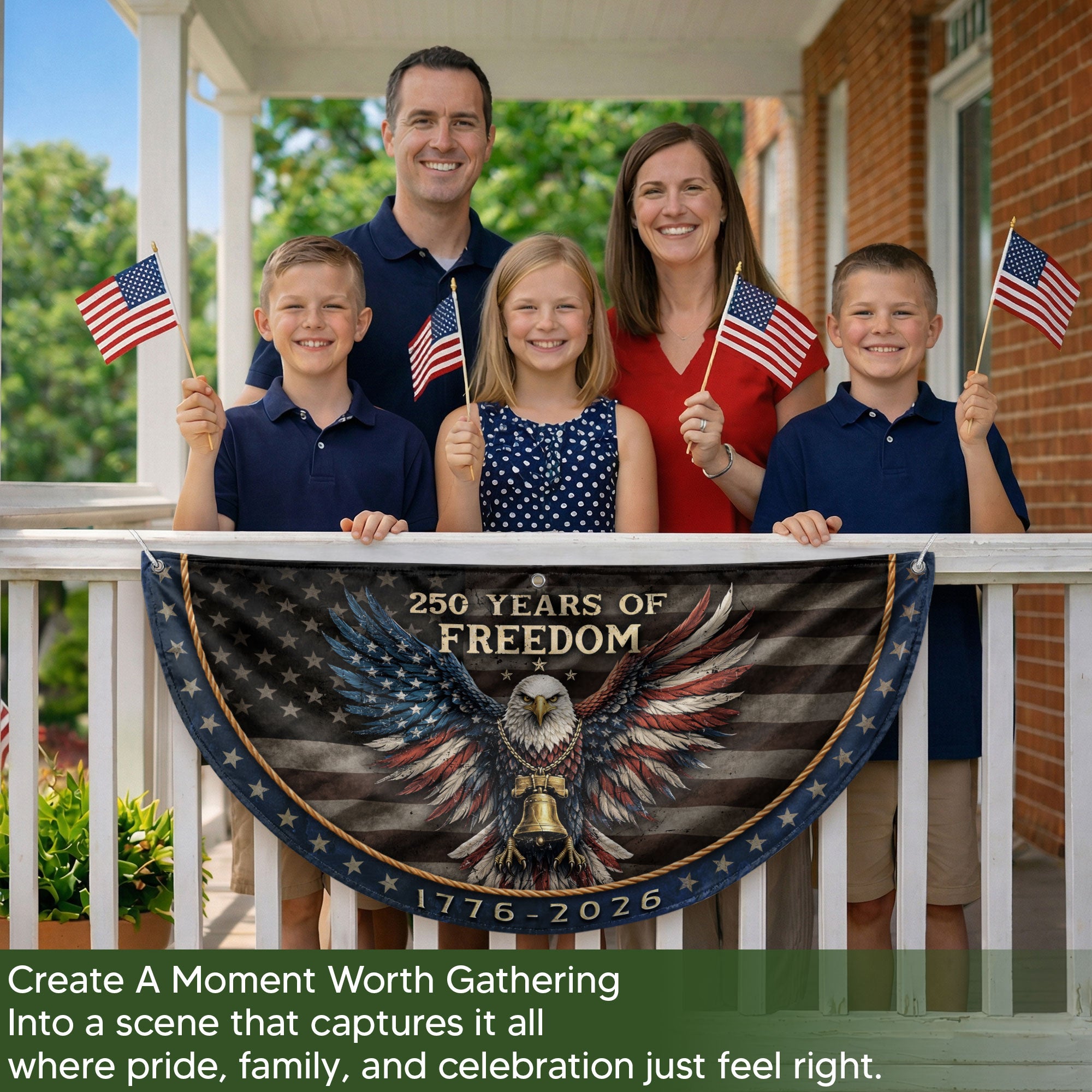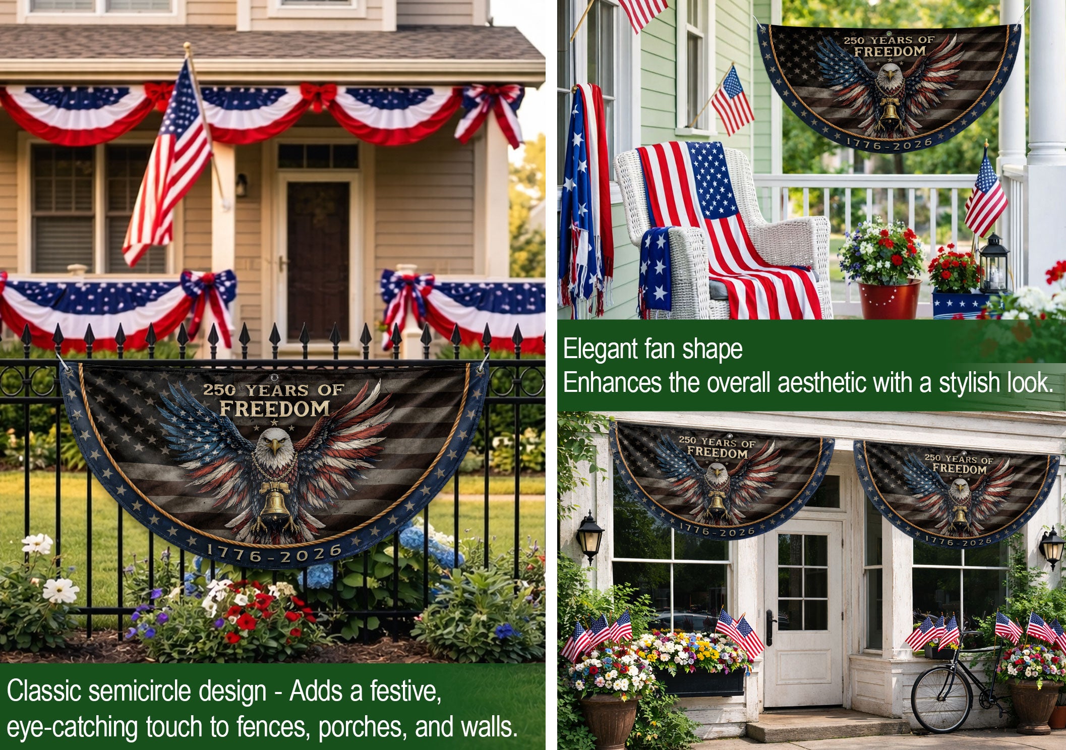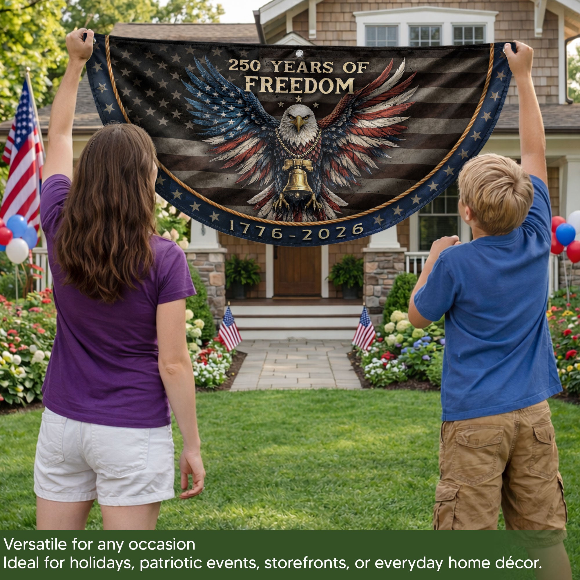 Celebrate America’s 250th anniversary of independence from 1776 to 2026 with this striking fence flag. Featuring a bold patriotic eagle, iconic Liberty Bell, and vintage American design elements, this banner captures the spirit of freedom and national pride. Crafted from durable, weather-resistant polyester fabric, it withstands outdoor conditions including wind, rain, and sun exposure. Perfect for displaying on fences, porches, decks, mailboxes, or as yard décor during Independence Day celebrations, historical commemorations, or everyday patriotic displays. Easy to hang with reinforced grommets and sleeves. Measures standard fence flag size for versatile placement. Proudly made to honor the semiquincentennial milestone.