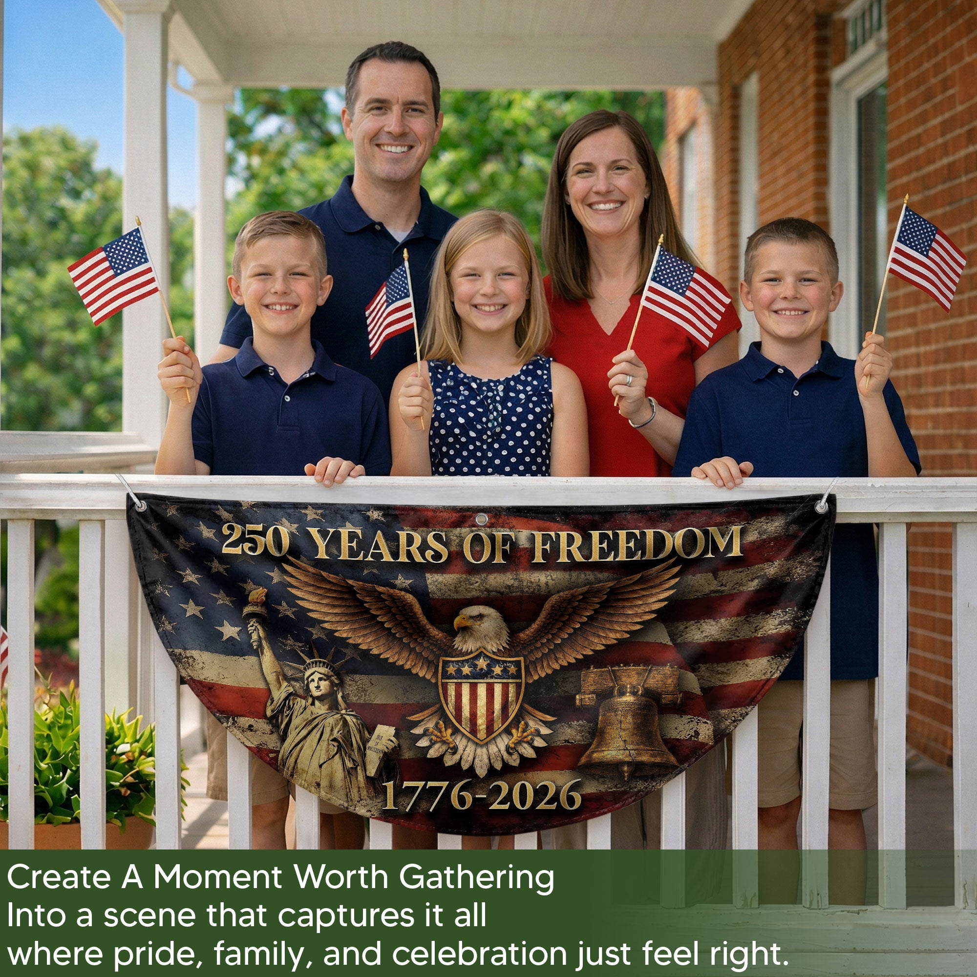 Celebrate America’s 250th anniversary with this durable fence flag featuring a vintage We The People design, majestic eagle, Liberty Bell, and 1776-2026 commemorative details. Crafted from high-quality, weather-resistant polyester fabric, this patriotic banner withstands outdoor elements for long-lasting display. Perfect for fences, gardens, porches, patios, or holiday decorations. Measures standard fence flag size for easy installation with grommets or clips. Ideal for Independence Day, Memorial Day, Fourth of July, or everyday patriotic pride. Bring timeless American spirit and historical significance to your home or yard decor.