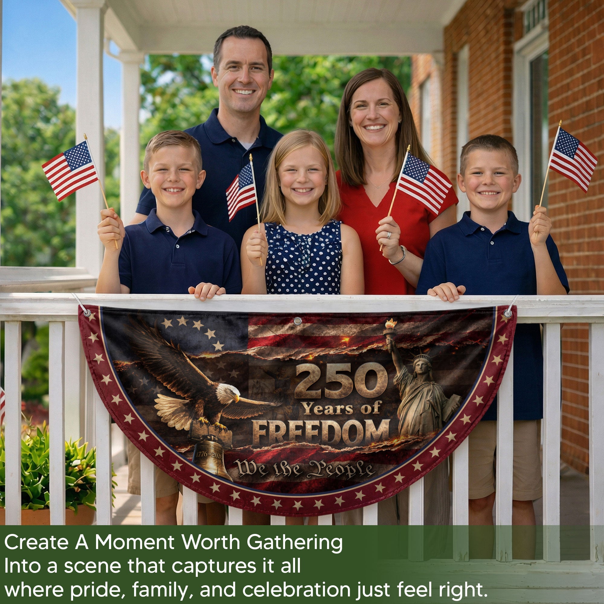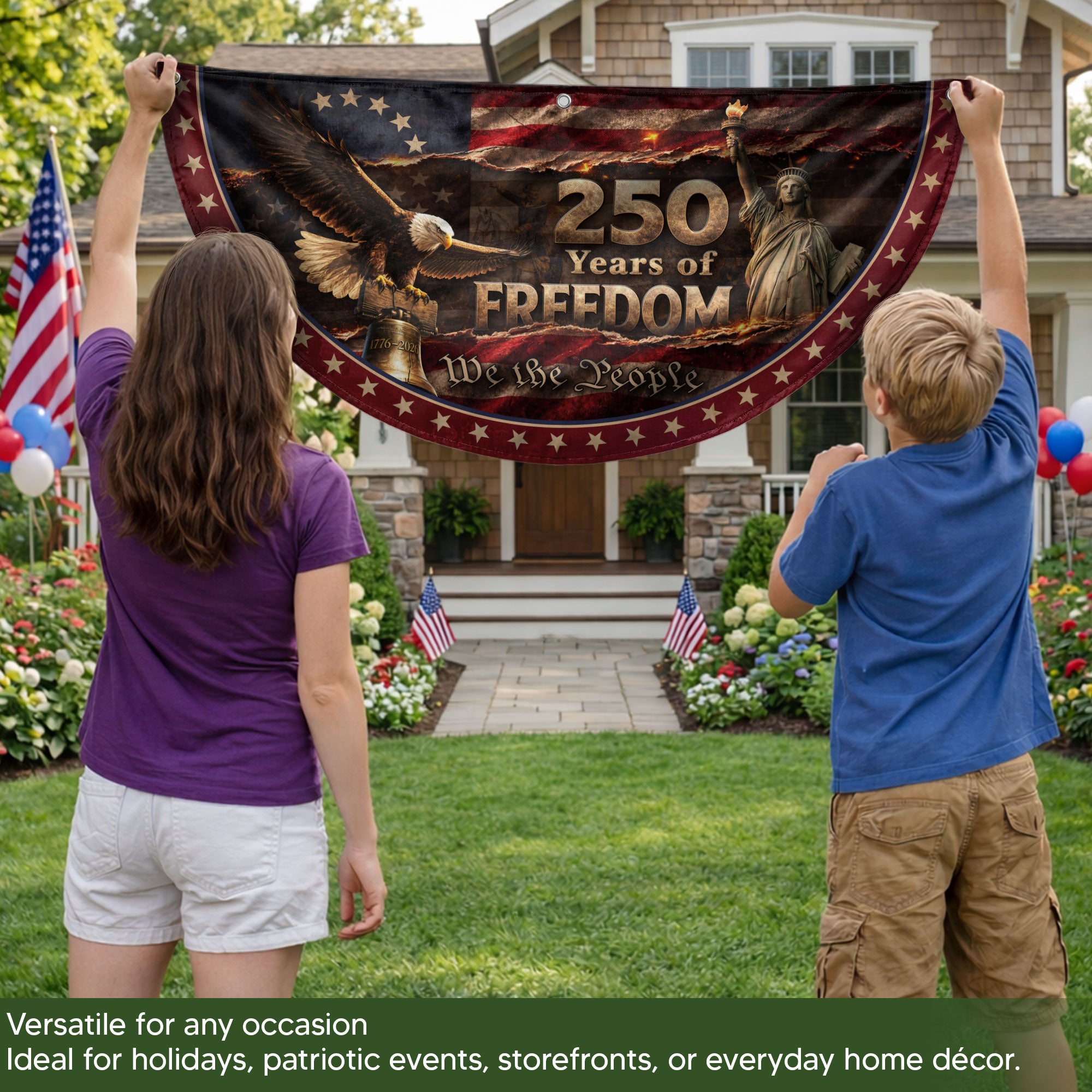 Celebrate 250 years of American freedom with this premium fence flag. Featuring the iconic Statue of Liberty, a majestic bald eagle, and the historic Liberty Bell against a vintage flag backdrop, this flag proudly displays ‘We The People.’ Crafted for durability, it’s designed for outdoor display on fences, porches, or gardens. Made from high-quality, weather-resistant polyester fabric with double-sided printing for vibrant colors that withstand wind, rain, and sun. Perfect for patriots showing national pride during the 250th anniversary, Independence Day, or everyday display. Easy to attach with included hardware. Symbolizes liberty, unity, and American heritage.