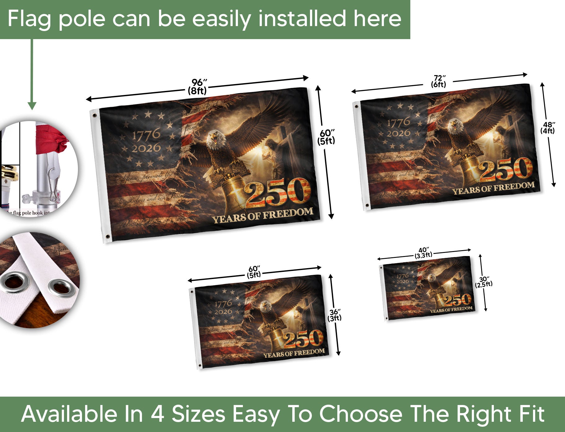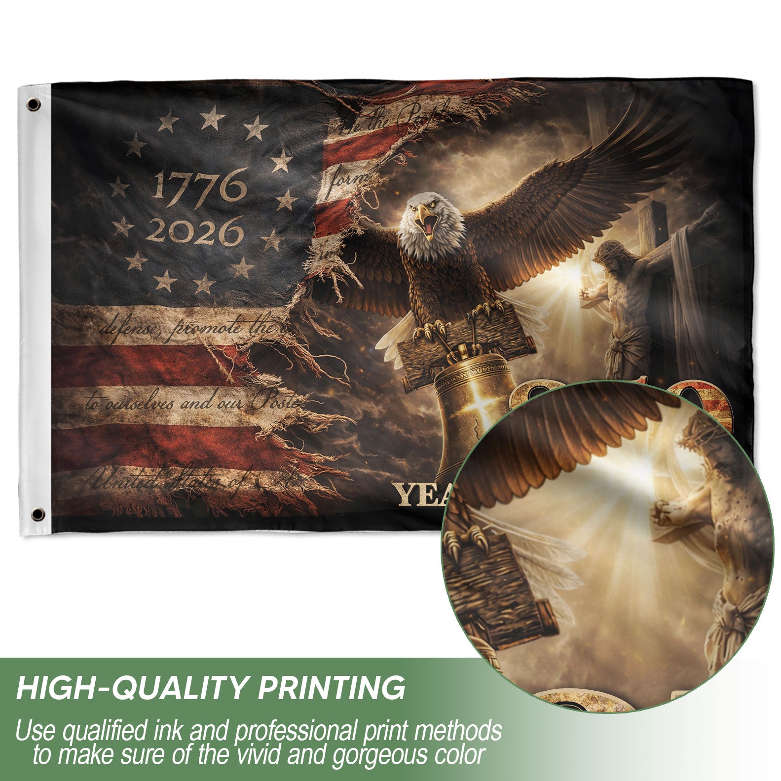 Celebrate 250 years of American freedom with this striking house flag featuring a majestic bald eagle perched on the Liberty Bell. Set against a weathered stars-and-stripes American flag backdrop and a poignant faith-inspired image, this patriotic decor honors the journey from 1776 to 2026. Perfect for displaying national pride on your porch, home, or garden. Crafted for durability and vibrant colors that withstand outdoor conditions, it’s an iconic symbol of heritage, liberty, and Christian values. Ideal for Independence Day, anniversaries, or everyday patriotism.