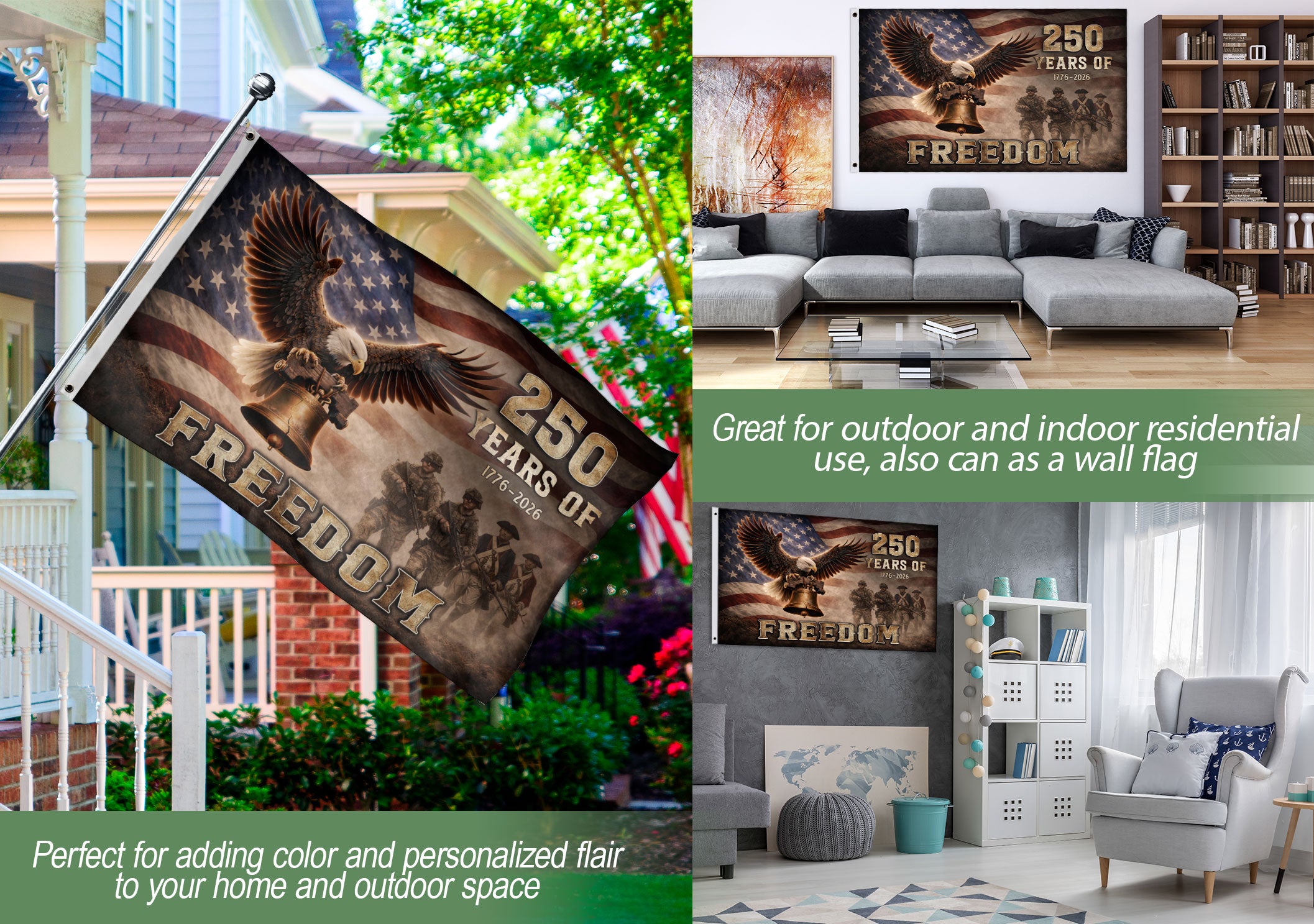Celebrate 250 years of American independence with this commemorative USA flag featuring a striking design from 1776 to 2026. The backdrop showcases the iconic American flag, crowned by a majestic bald eagle soaring above the historic Liberty Bell. This powerful artwork incorporates timeless elements symbolizing strength, courage, liberty, and the enduring spirit of the United States. Perfect as a decorative flag for patios, gardens, homes, porches, or special anniversary displays. Crafted for outdoor durability, it honors the semiquincentennial milestone with patriotic pride. Ideal for history enthusiasts, veterans, and anyone proud of America’s journey.