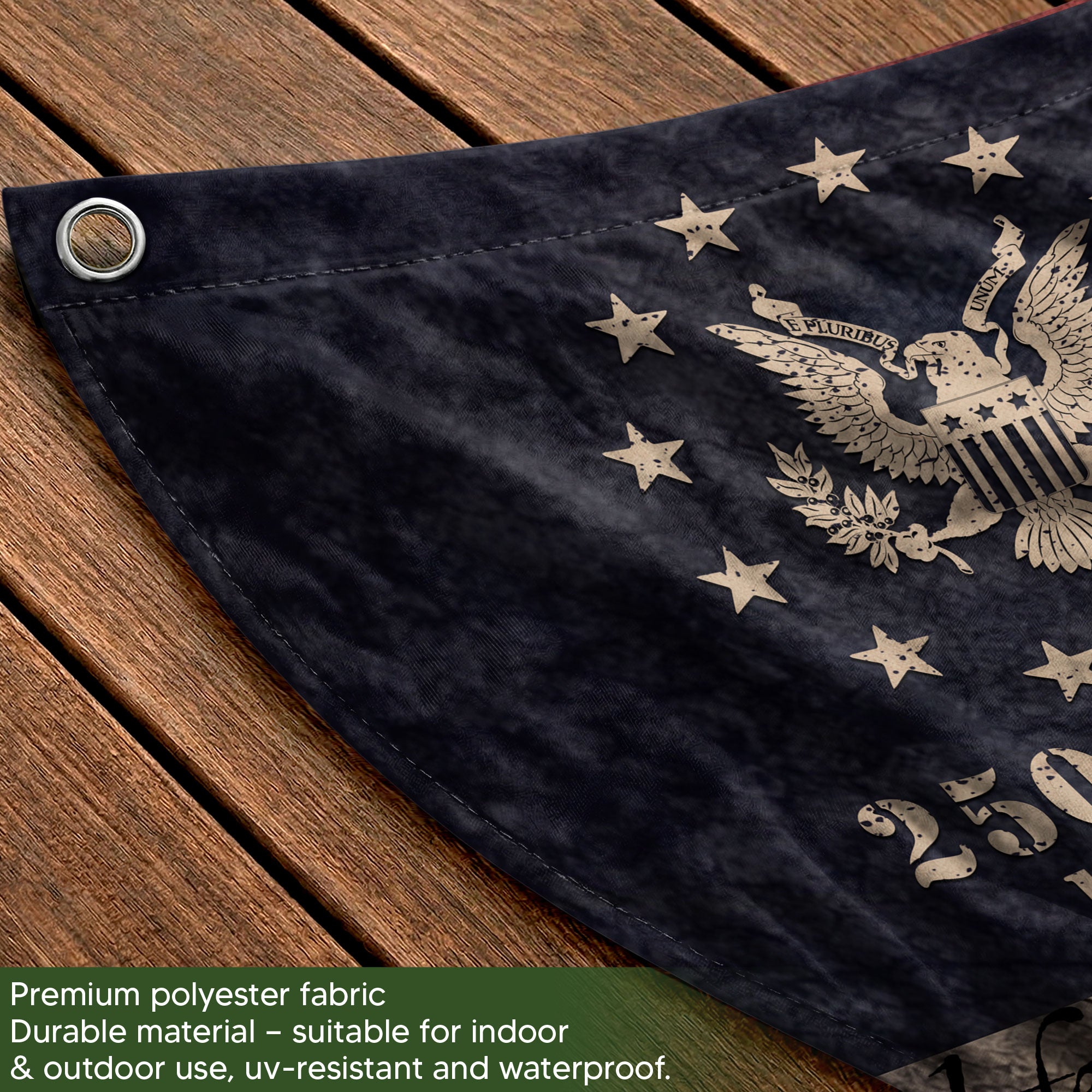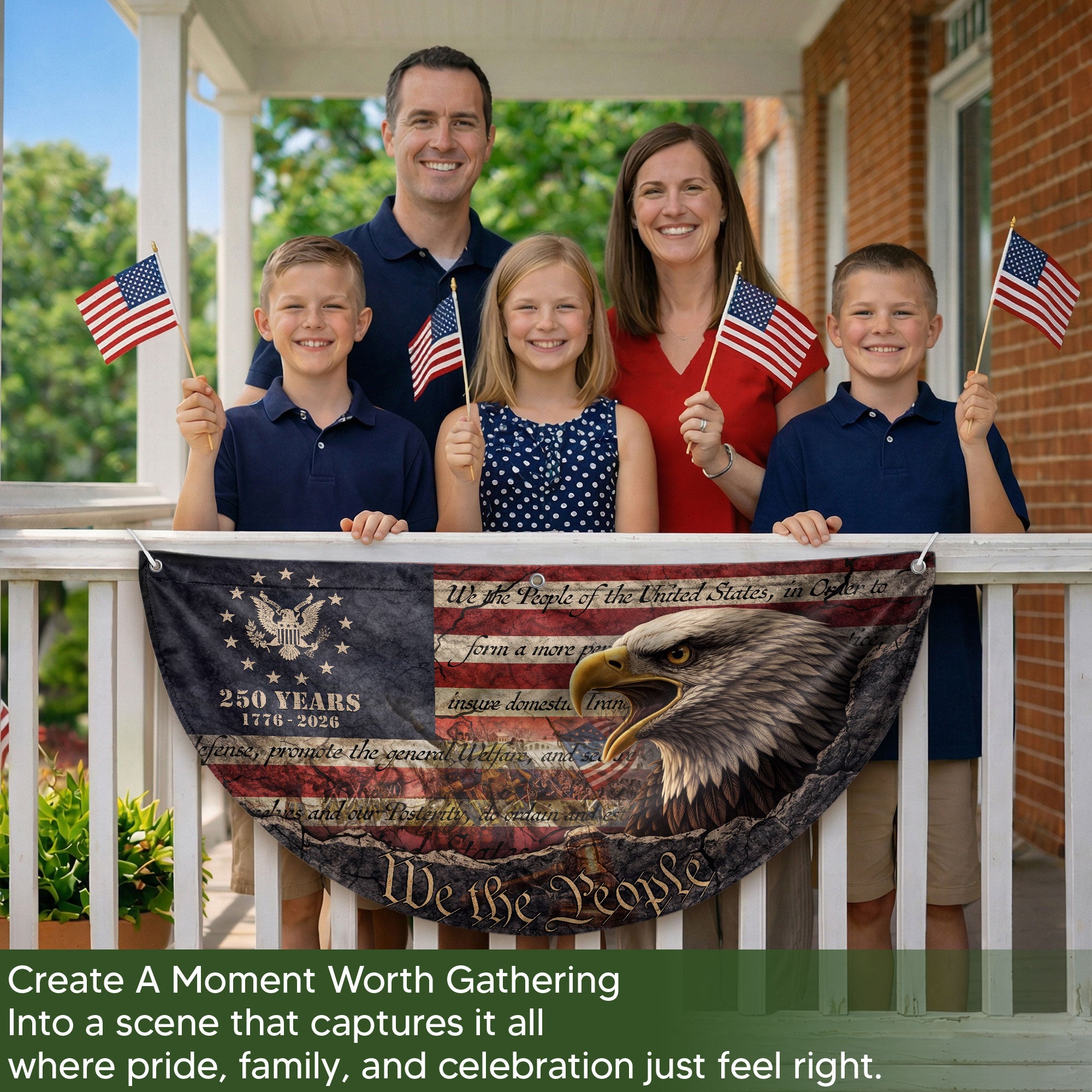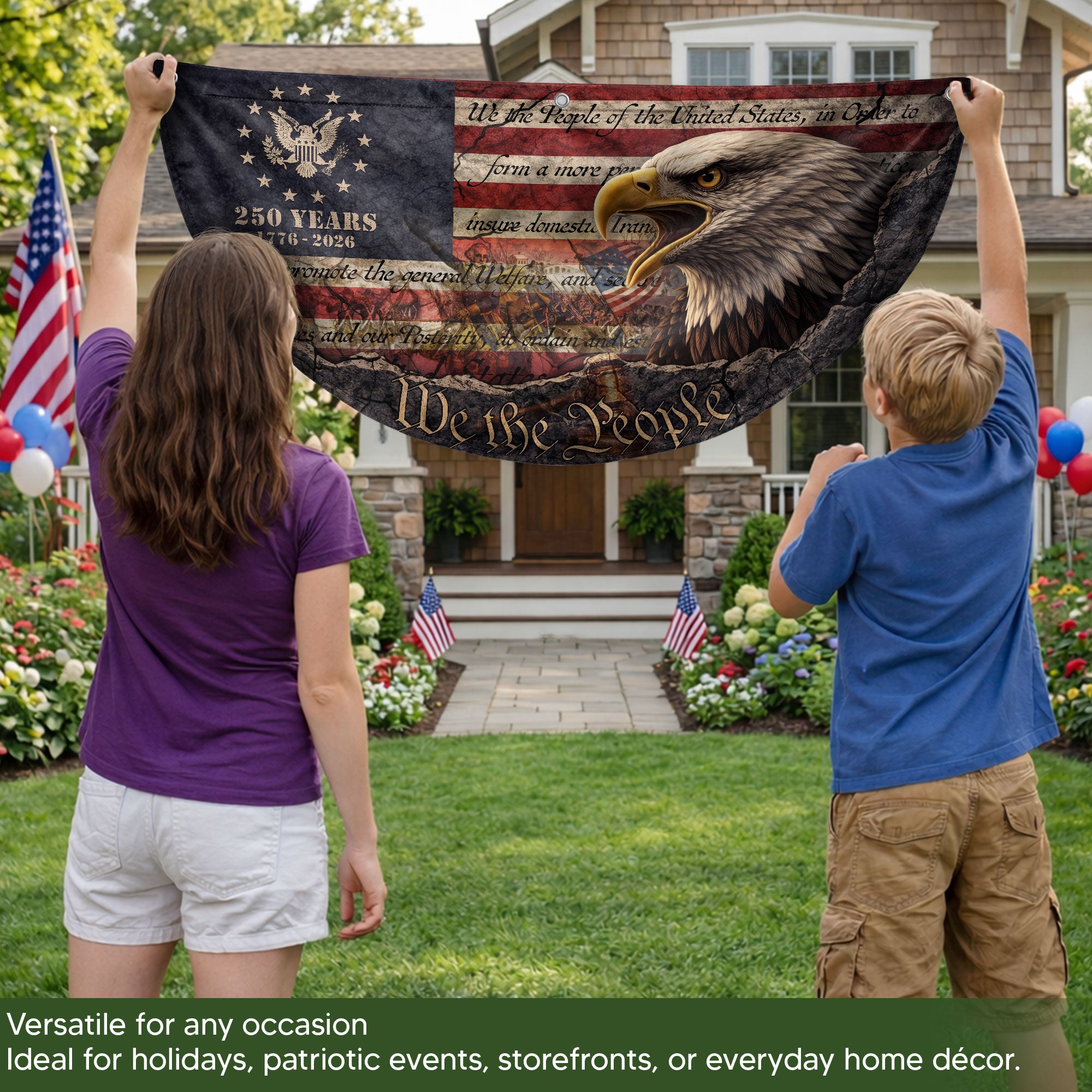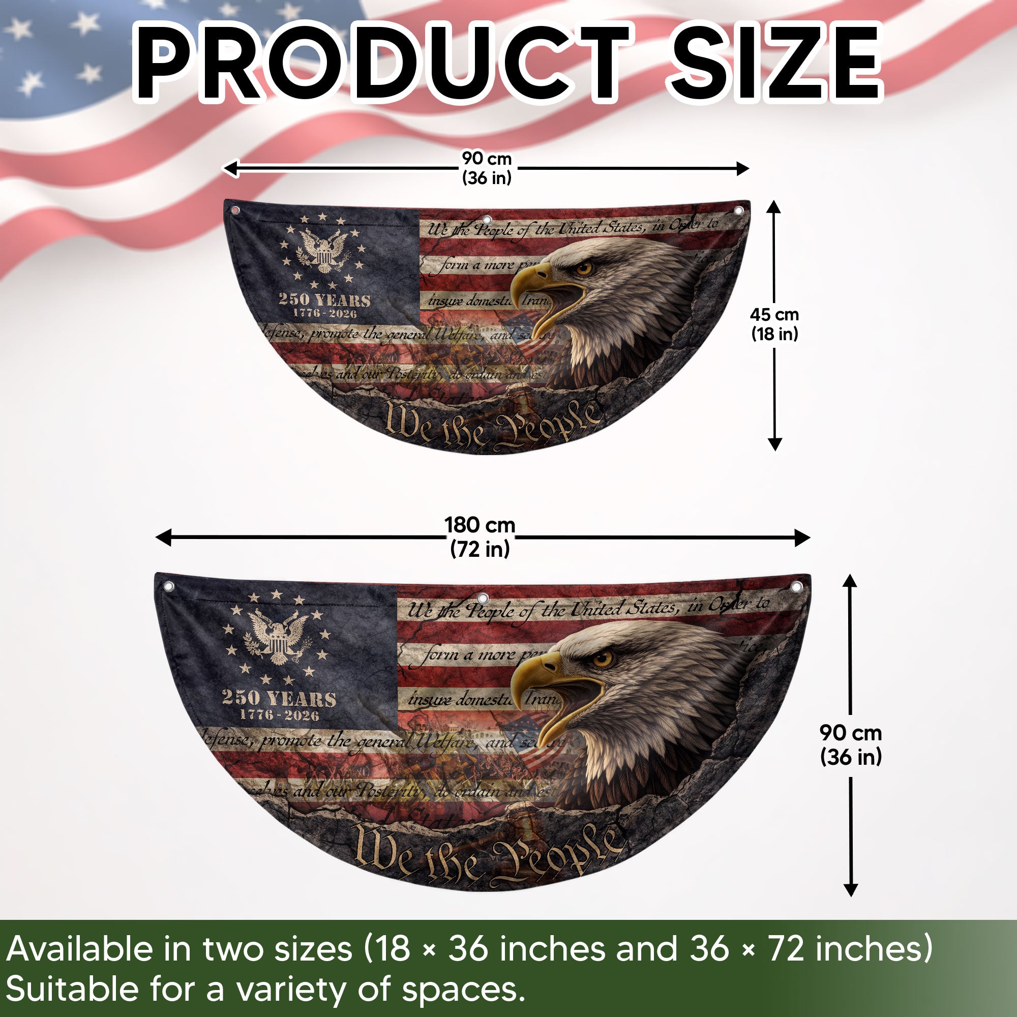 Celebrate America’s 250th anniversary with this striking Fence Flag featuring a powerful eagle and vintage-inspired artwork. Spanning from 1776 to 2026, this patriotic banner captures the spirit of American independence and pride. Crafted from fade-resistant, durable polyester material, it’s designed for long-term outdoor display on fences, porches, or gardens. Perfect for Fourth of July events, historical commemorations, parades, or everyday patriotic decor. Easy to attach with reinforced grommets and double-stitched edges for wind resistance. Measures standard fence flag size for versatile use. Show your American heritage with this high-quality 250 year anniversary flag.