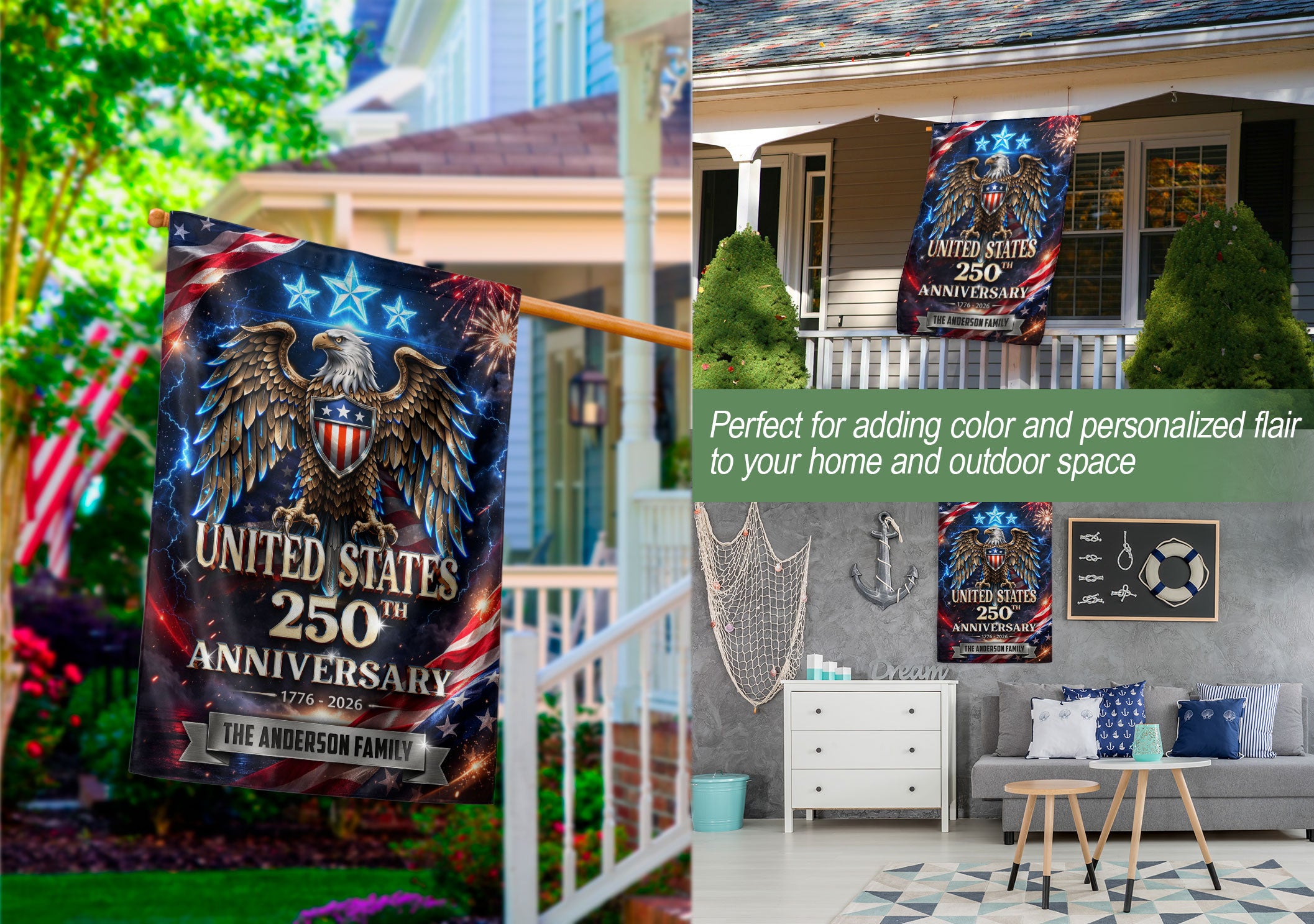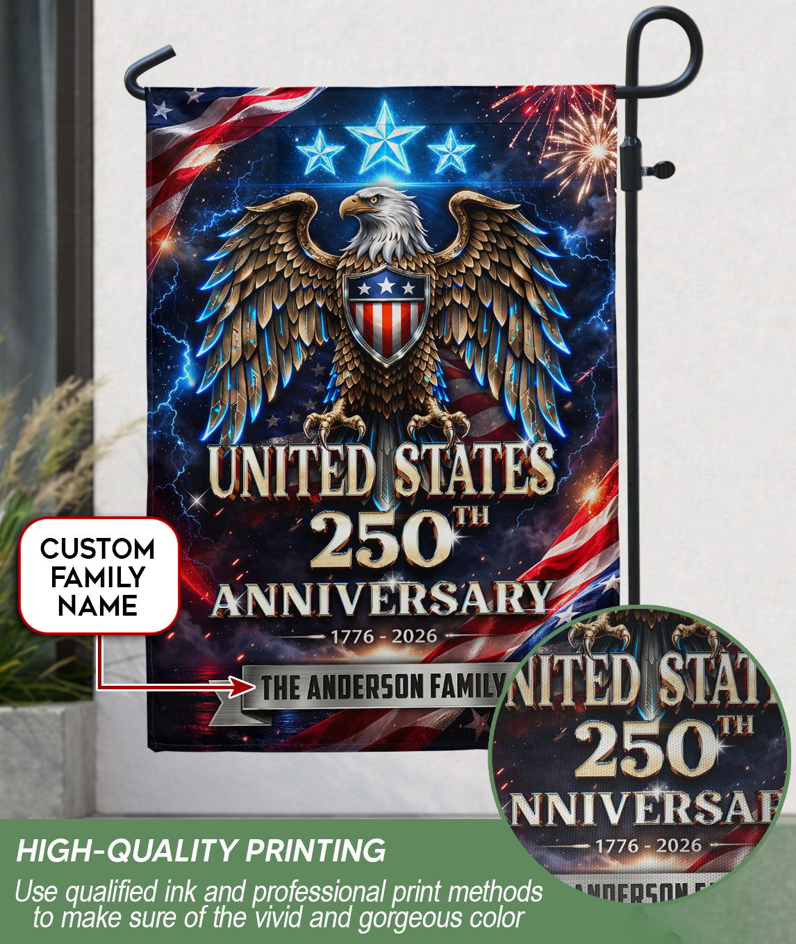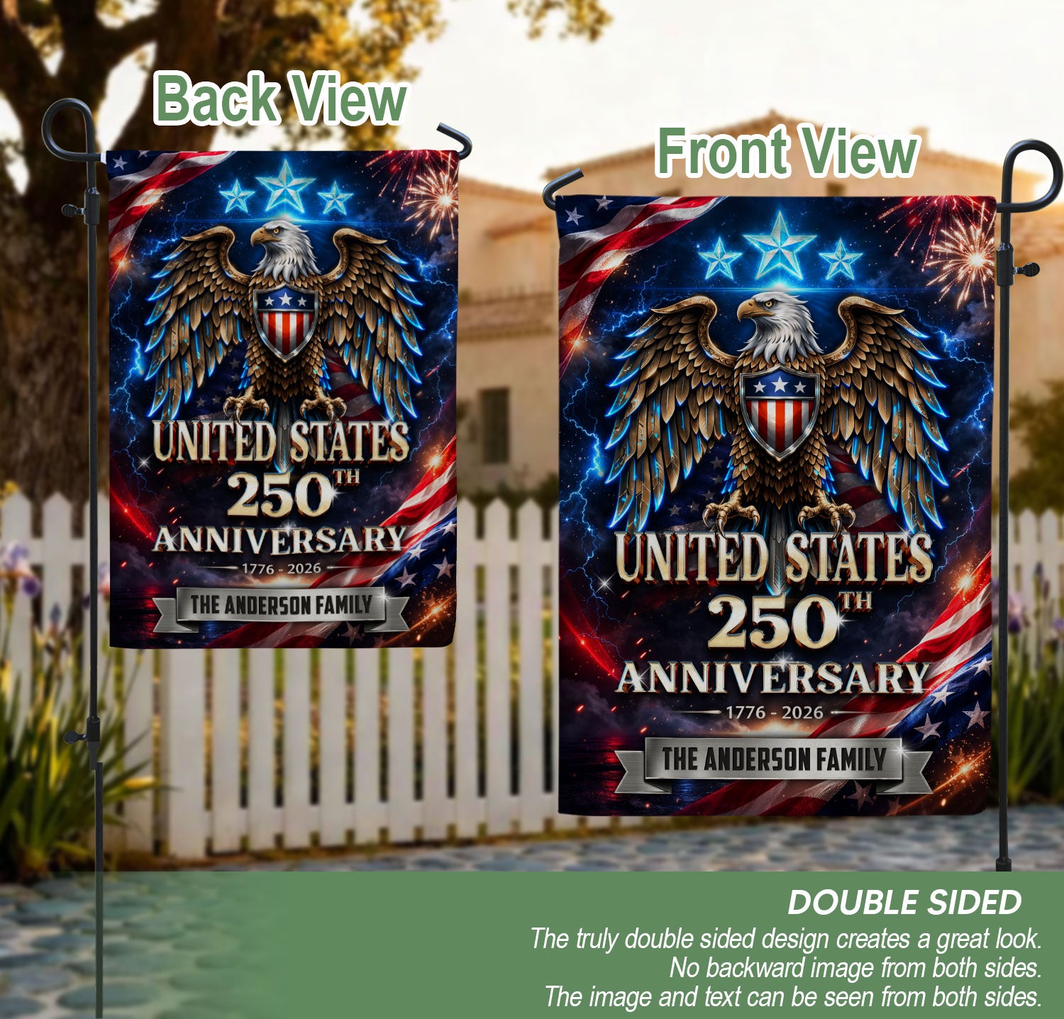 Celebrate America’s 250th anniversary from 1776 to 2026 with this custom garden flag featuring your family name, a majestic eagle, three stars, and vibrant American flag elements. Crafted for outdoor display, this patriotic flag captures the spirit of freedom and independence. Perfect for gardens, porches, mailboxes, or as a family gift to honor this historic milestone. Durable polyester material withstands weather, double-sided printing ensures visibility from all angles. Personalize with your surname for a unique touch.