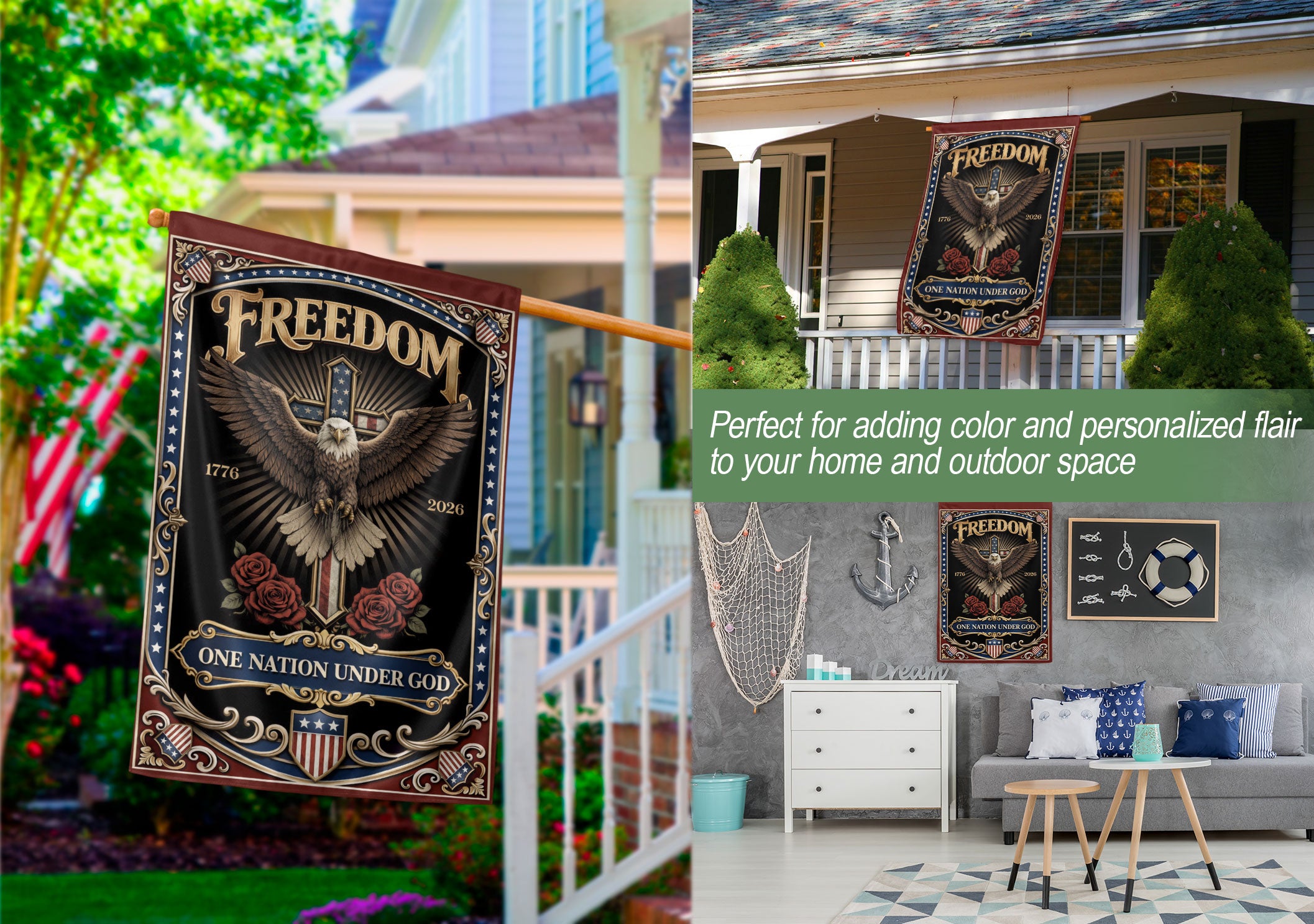 Celebrate America’s 250th anniversary with this double-sided garden flag featuring ‘One Nation Under God’ and ‘We The People’ messages. The design showcases a powerful eagle and cross in patriotic red, white, and blue colors, honoring 250 years of freedom from 1776 to 2026. Crafted for outdoor display, this durable flag embodies faith, Christian values, and American pride. Perfect for gardens, porches, or yards to inspire liberty and patriotism. Easy to hang with a standard garden flag pole (not included). Double-sided printing ensures visibility from both sides.
