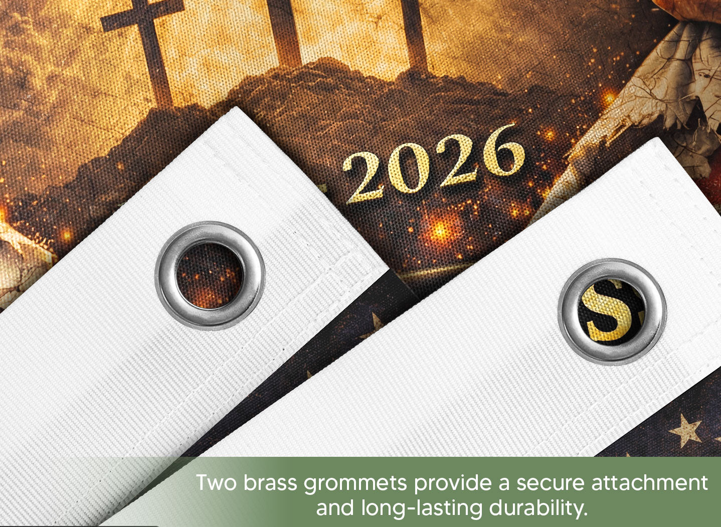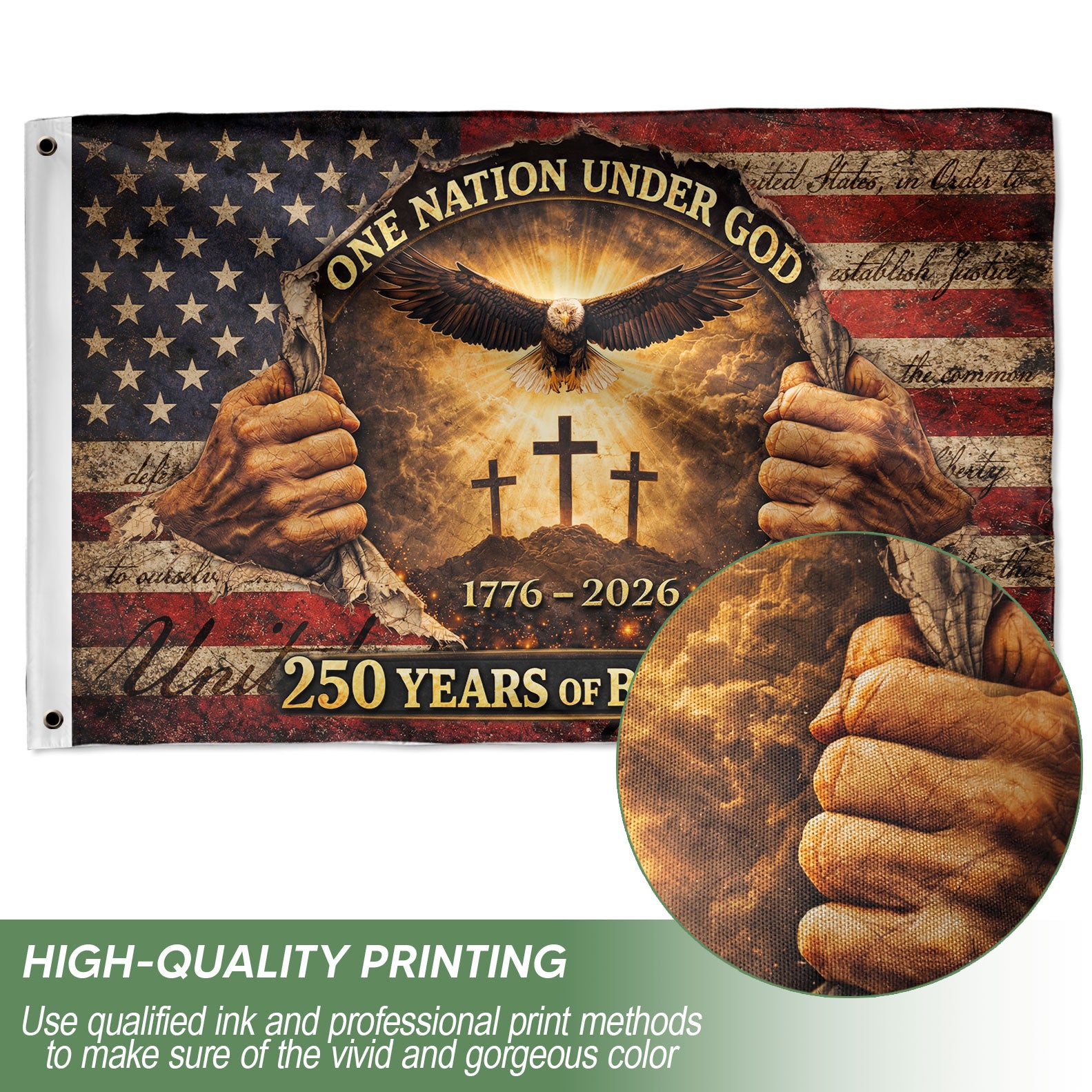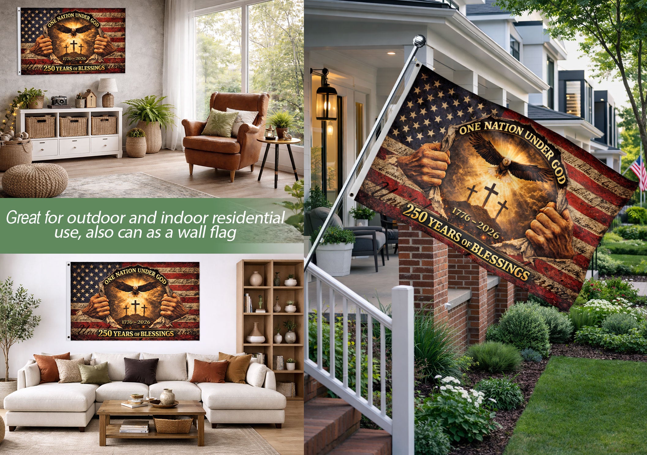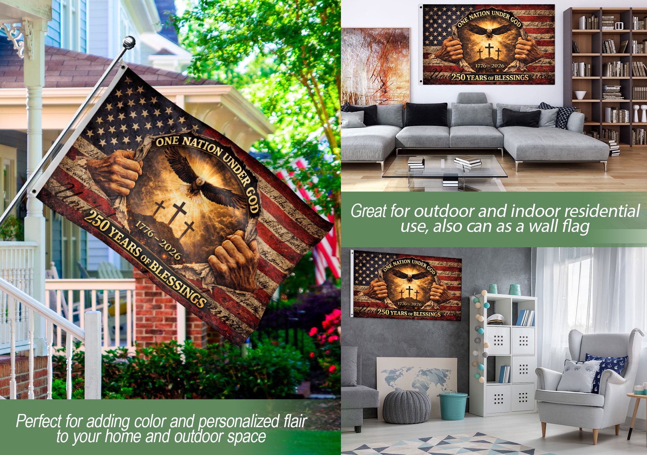 Celebrate 250 years of American independence with this patriotic USA house flag spanning 1776-2026. Featuring a soaring eagle above a prominent cross set against the iconic stars and stripes background, this flag proudly displays ‘One Nation Under God.’ Crafted from durable, weather-resistant polyester fabric, it measures standard house flag size (typically 28×40 inches) with reinforced grommets for easy hanging on flagpoles, porches, or garden displays. Perfect for displaying your faith and American heritage during the 250th anniversary celebrations, Fourth of July, Memorial Day, or everyday patriotism. Fade-resistant colors ensure long-lasting vibrancy outdoors. Easy to clean and machine washable for maintenance.
