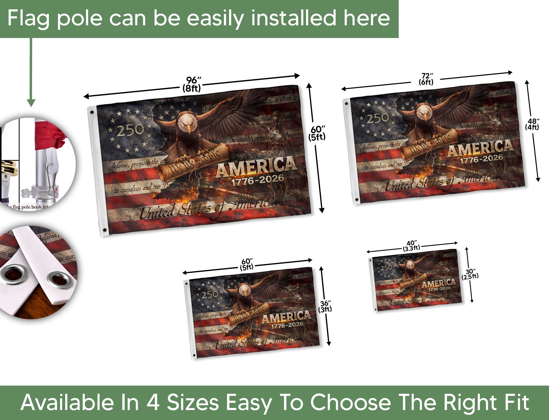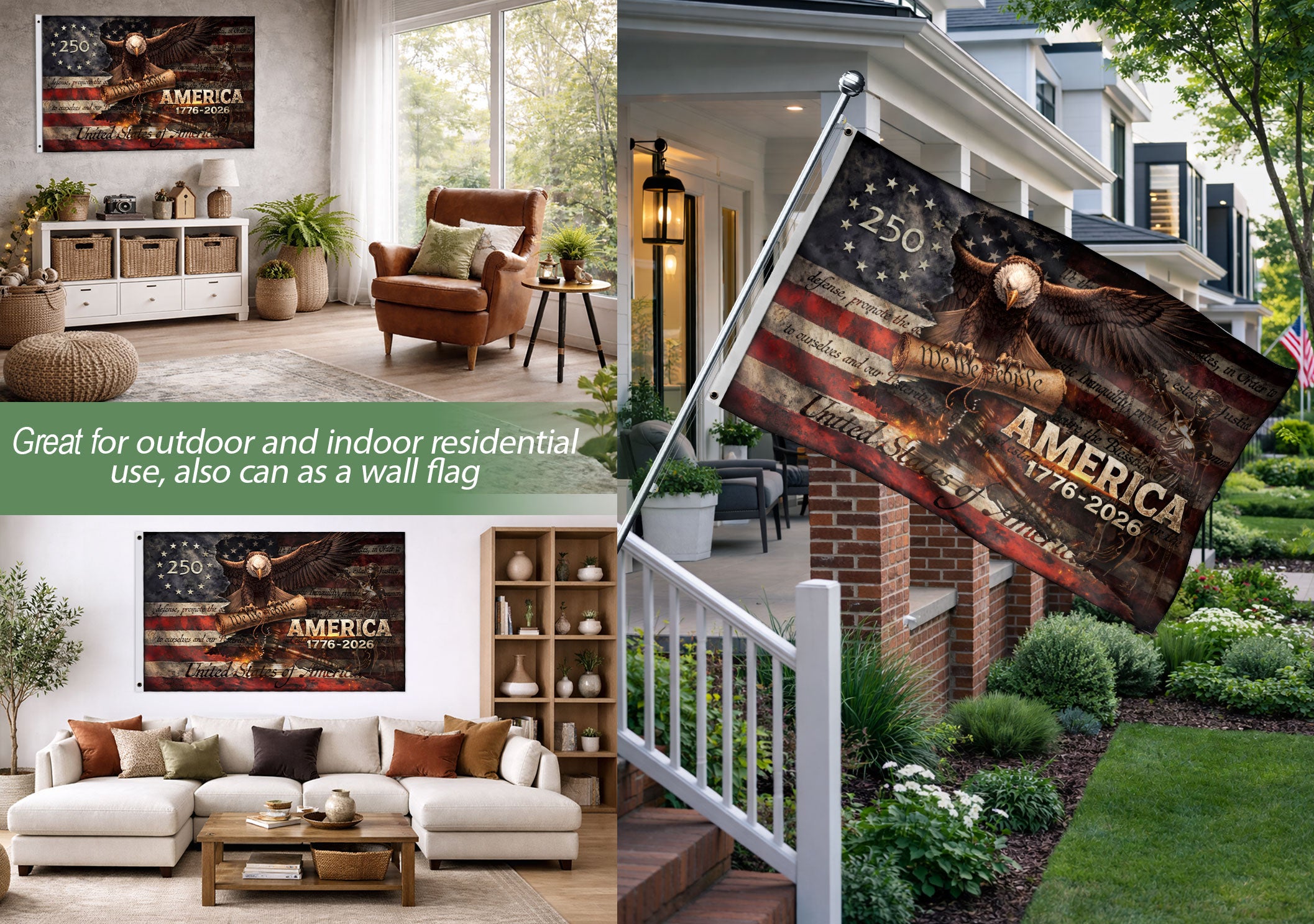 Celebrate 250 years of American independence with this striking house flag. Featuring a bold patriotic eagle, “We The People” scroll, and vintage design commemorating 1776-2026, it’s crafted for durable outdoor display. Made from high-quality polyester fabric that withstands weather elements, this flag adds a powerful statement of national pride, history, and freedom to your porch, yard, or garden. Perfect for Fourth of July, Memorial Day, or everyday display to honor American heritage. Double-sided printing ensures visibility from both sides, with reinforced edges for long-lasting use. Easy to hang with a standard flagpole or bracket—not included.