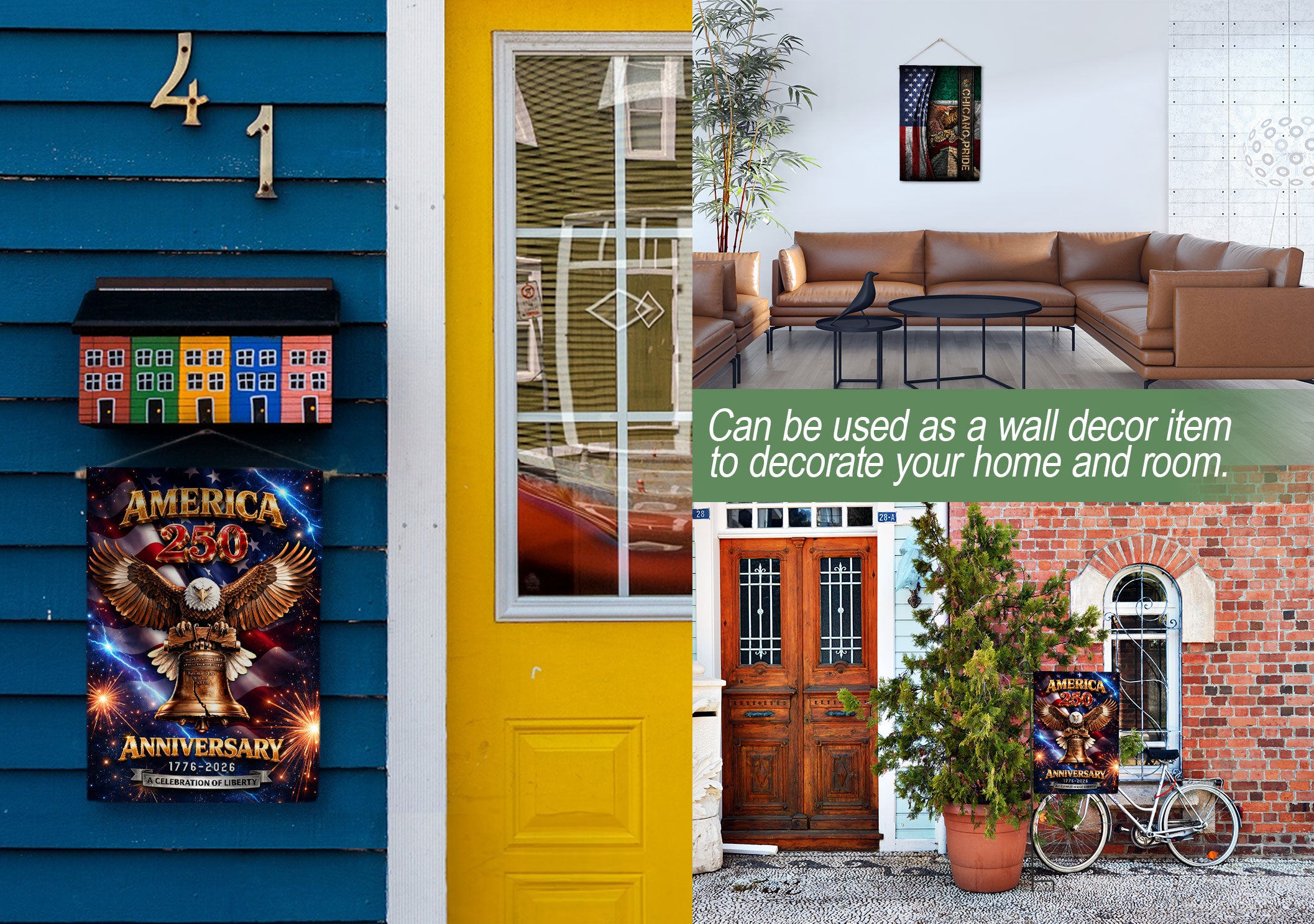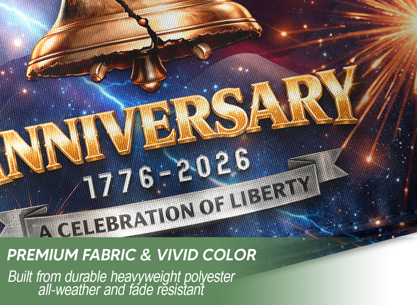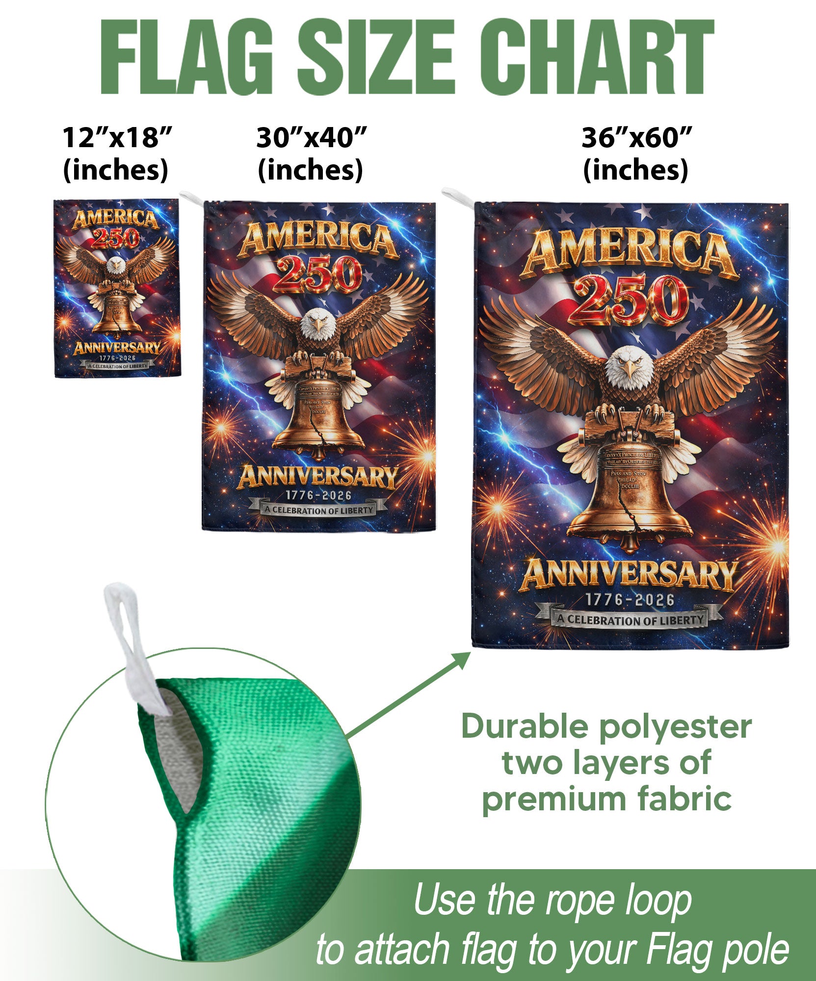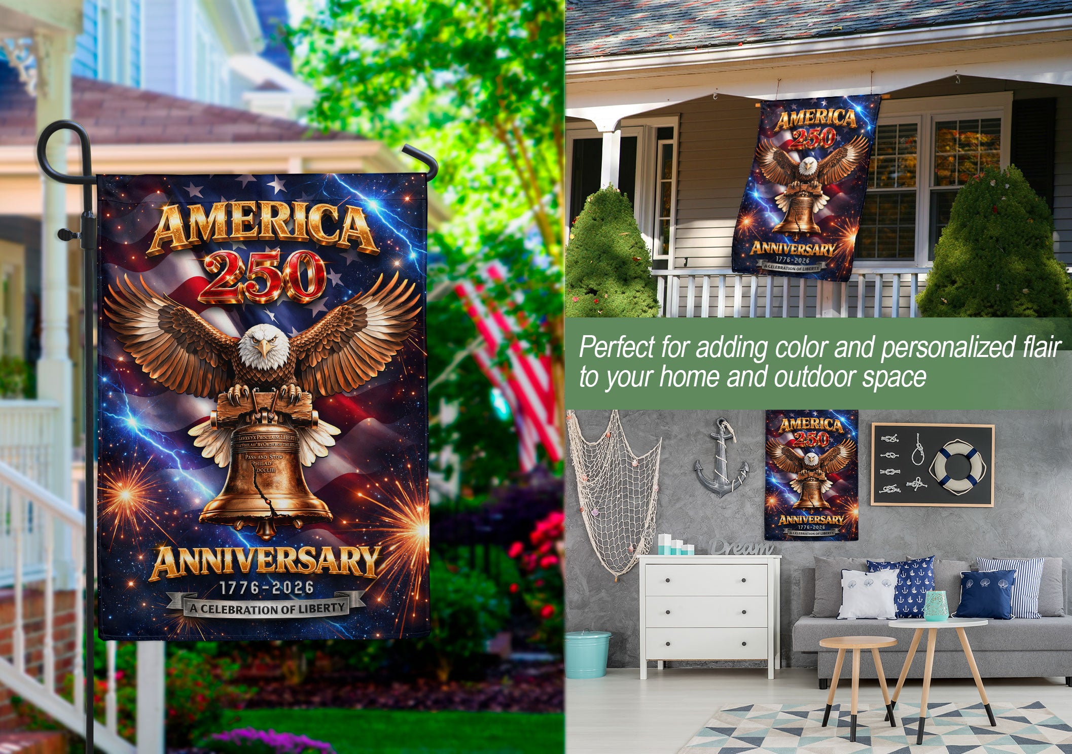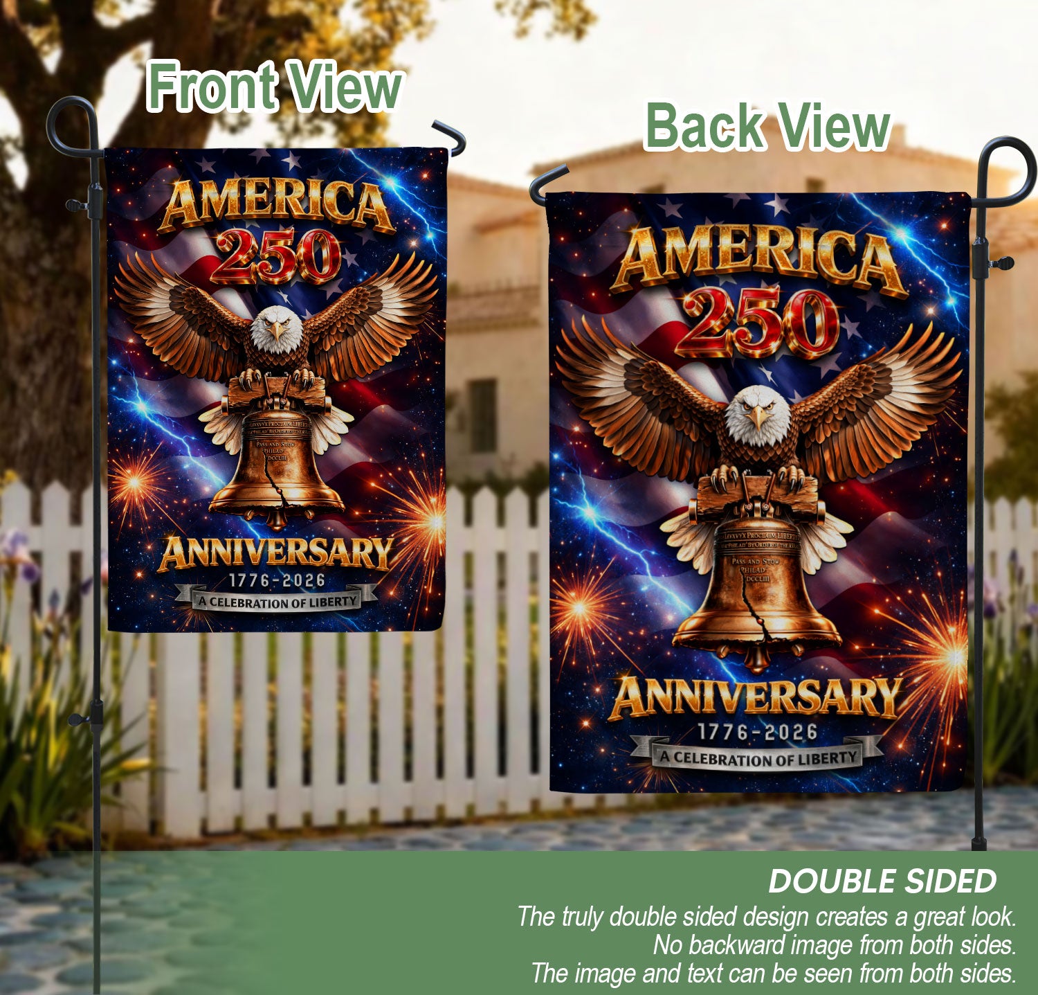 Celebrate America’s 250th anniversary from 1776 to 2026 with this striking double-sided house flag. Featuring the iconic Liberty Bell, a majestic bald eagle, and dynamic lightning-inspired fireworks, this outdoor banner honors the nation’s heritage, resilience, and enduring spirit of liberty. Crafted for durability, it’s perfect for displaying on your porch, garden flagpole, or home exterior to show patriotic pride during Independence Day celebrations, historical commemorations, or everyday displays. The vibrant, weather-resistant design ensures bold colors and clear imagery from both sides, making it an ideal tribute to the powerful journey of the United States.