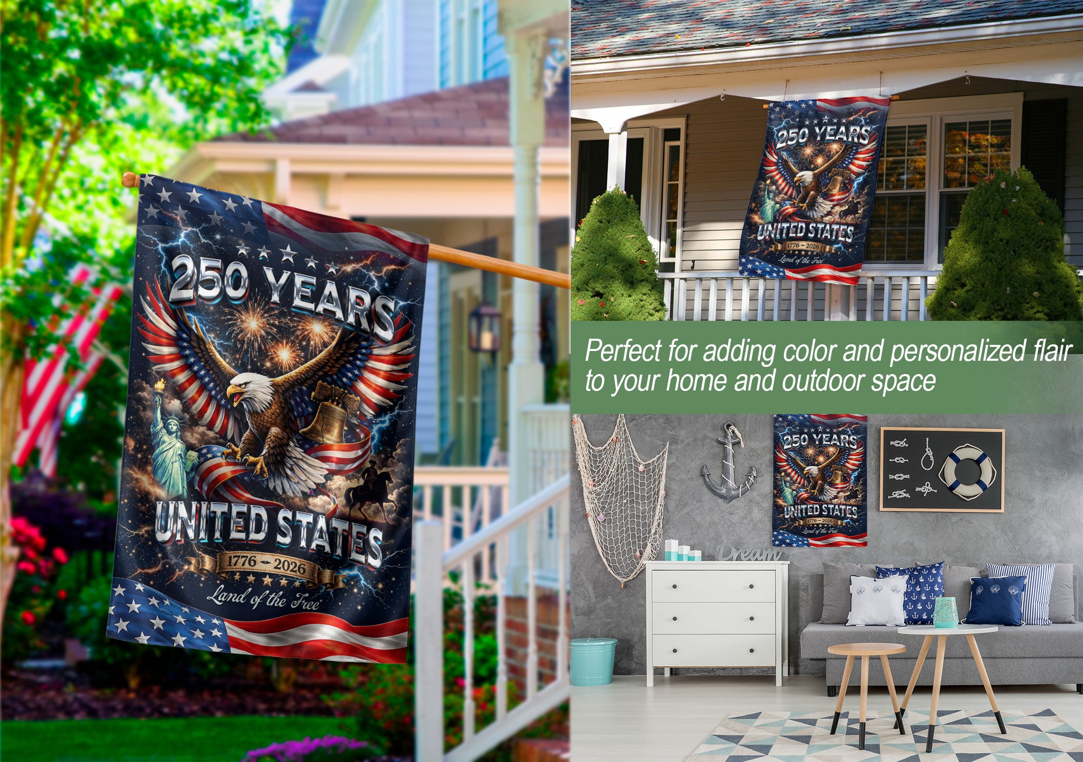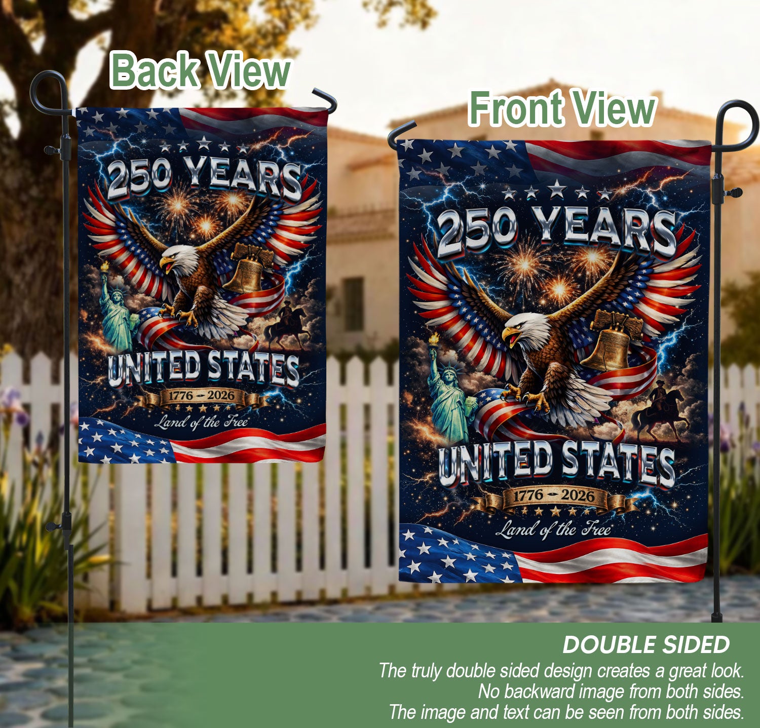 Celebrate America’s 250th anniversary from 1776 to 2026 with this patriotic double-sided garden flag. Featuring a majestic bald eagle soaring alongside the iconic Statue of Liberty, this vintage-inspired design captures 250 years of liberty, strength, and hope. Perfect for outdoor decor in gardens, porches, yards, or patios, it adds a timeless tribute to American freedom. Crafted for durability to withstand weather elements, the flag displays vibrant colors and clear imagery on both sides for visibility from any angle. Ideal for Independence Day, Memorial Day, Fourth of July, or everyday display of national pride. Easy to hang with a standard garden flag pole (not included). Honor the enduring symbols of the USA with this classic outdoor decoration.