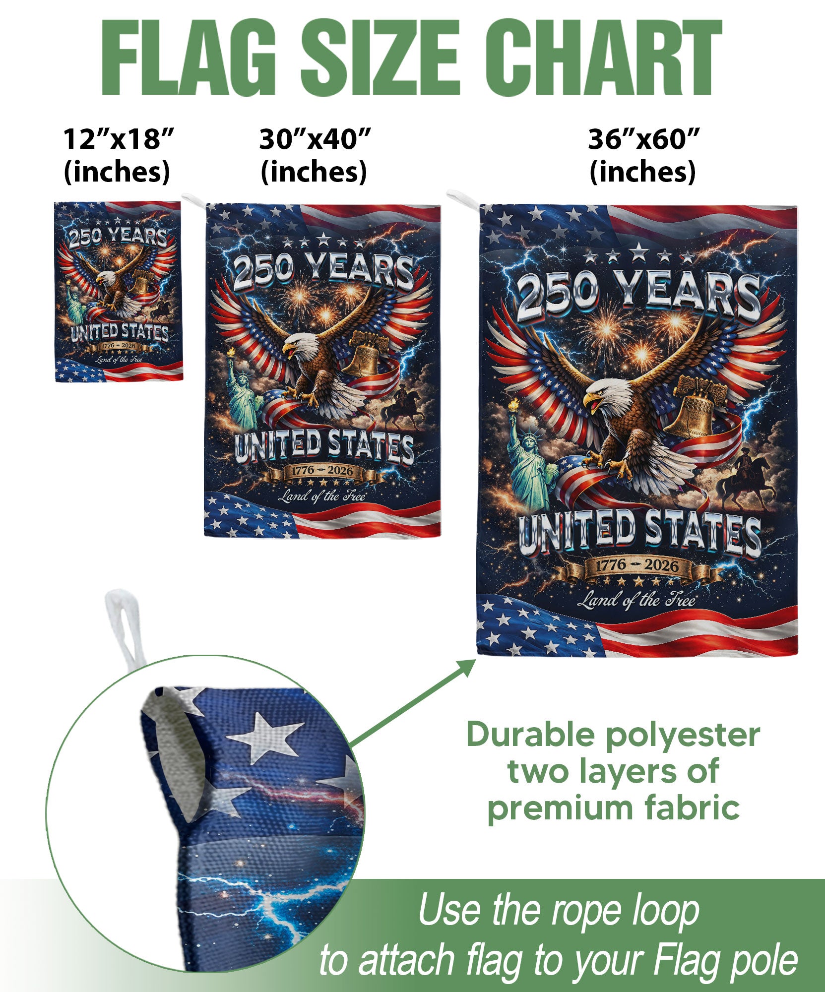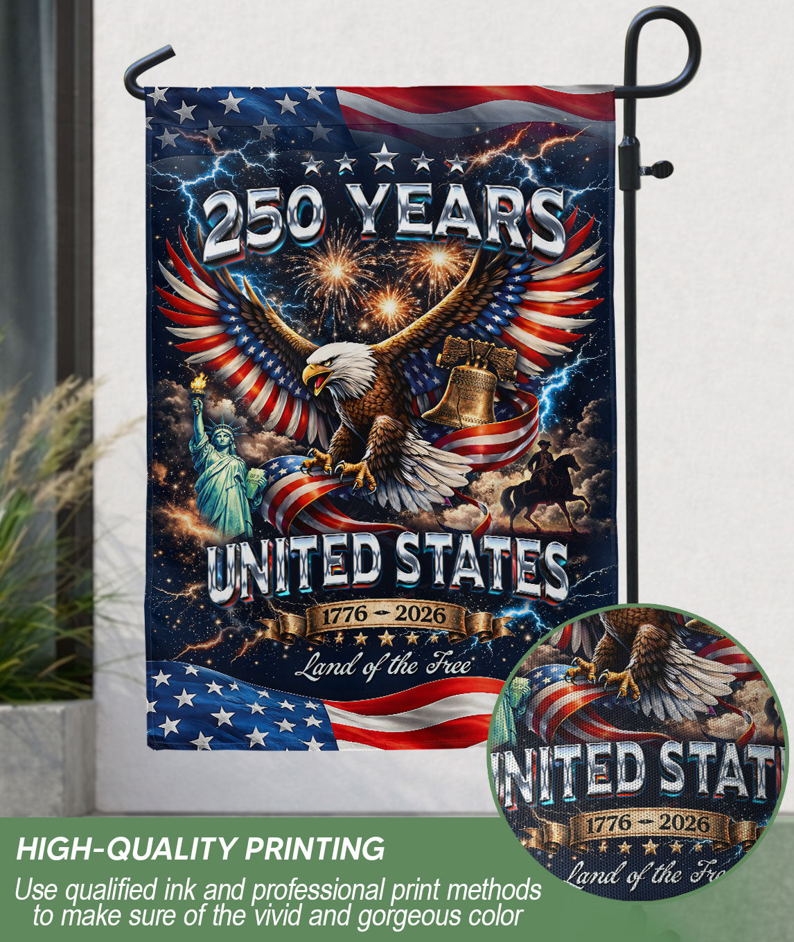 Celebrate America’s 250th anniversary from 1776 to 2026 with this vintage-inspired double-sided house flag. Featuring a majestic bald eagle and the iconic Statue of Liberty, it serves as a timeless tribute to the nation’s enduring symbols of freedom, strength, and hope. Perfect for outdoor decor on porches, patios, or gardens, this durable flag is designed for all-weather use, ensuring vibrant colors and clear details from both sides. Crafted with high-quality polyester fabric, it resists fading and tearing, making it ideal for patriotic displays during holidays, Independence Day, or everyday pride. Easy to hang with a standard flagpole sleeve, this classic piece adds a touch of American heritage to any home exterior.