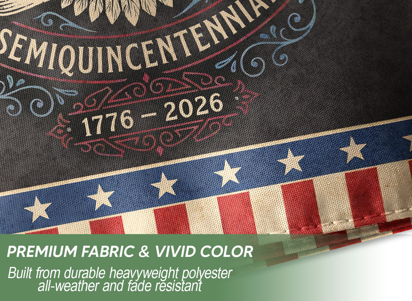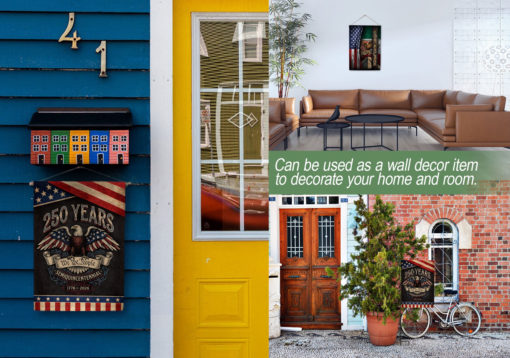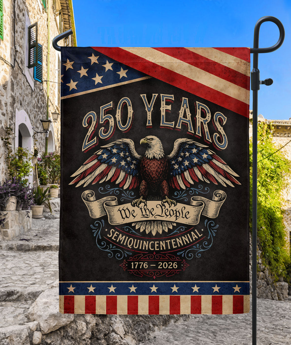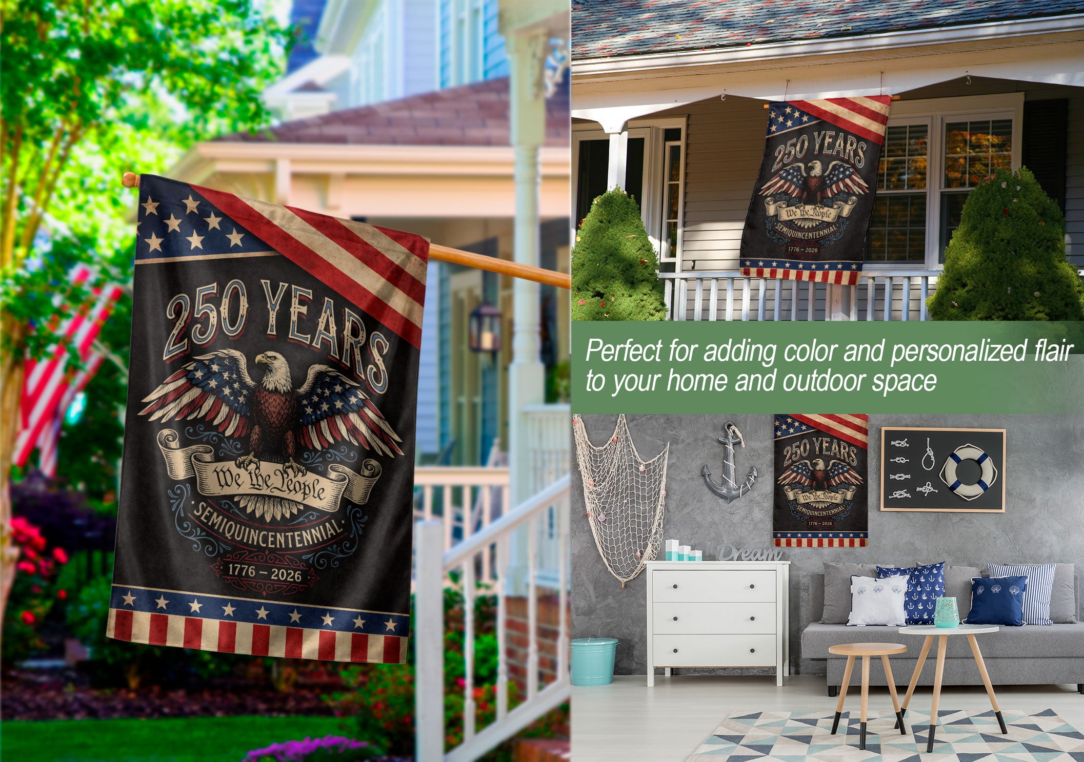 Celebrate America’s 250th anniversary from 1776 to 2026 with this striking house flag featuring ‘We The People’ and a majestic bald eagle in vintage style. Double-sided printing ensures bold patriotic graphics are visible from both sides, making it perfect for garden, yard, porch, or outdoor displays. Crafted with durable, weather-resistant polyester fabric, this USA flag withstands wind, rain, and sun for long-lasting vibrancy. The classic red, white, and blue color scheme with distressed vintage effects honors American independence and unity. Easy to hang with a standard flagpole sleeve or grommets. Ideal for patriots, history enthusiasts, and Fourth of July celebrations. Measures standard house flag size for versatile home decor.