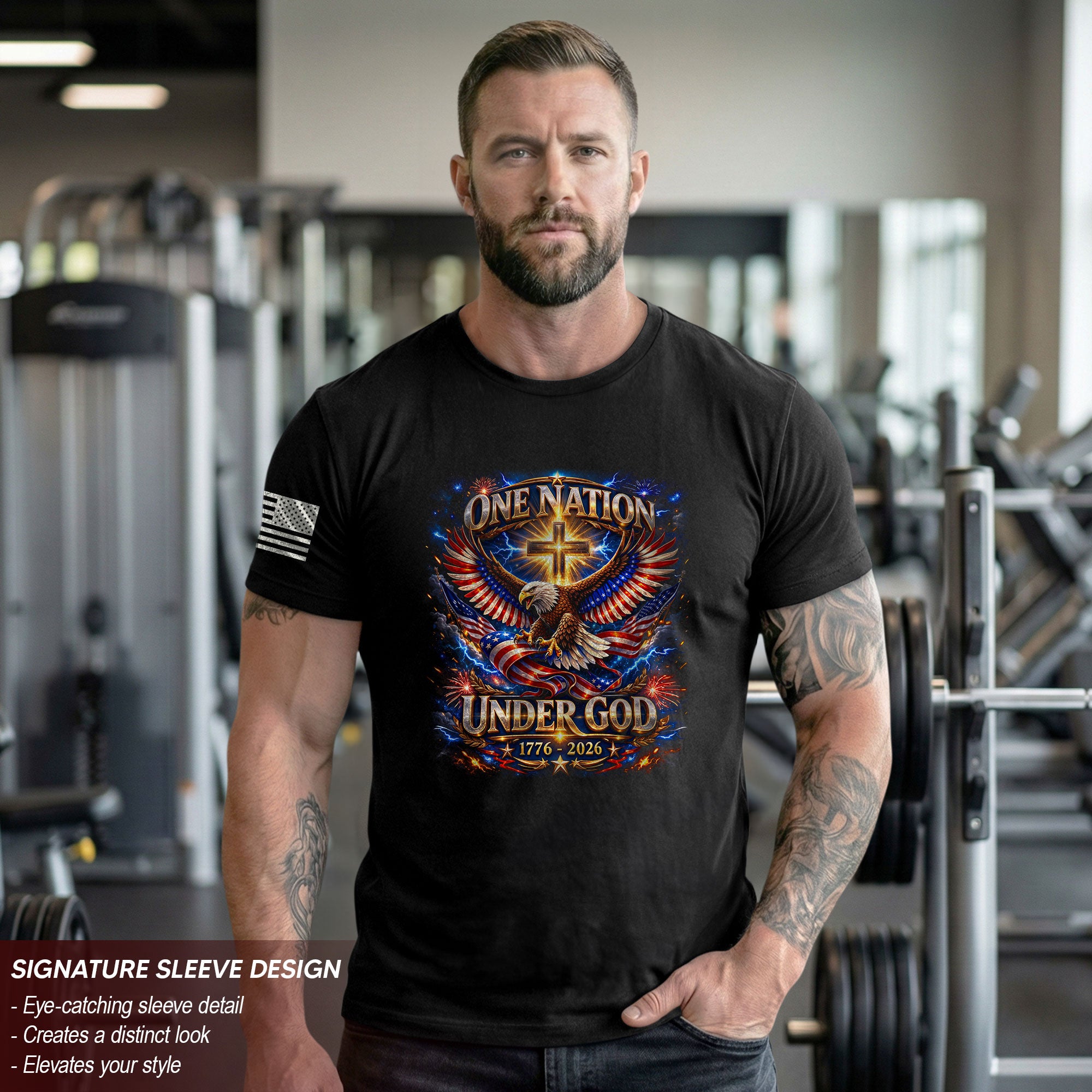 Celebrate America’s 250th anniversary from 1776 to 2026 with this patriotic T-shirt featuring a bold USA eagle, cross, and flag design. The ‘One Nation Under God’ message honors 250 years of faith, national pride, and enduring liberty. Crafted from soft, breathable cotton for all-day comfort, this bootleg-style tee is perfect for Independence Day celebrations, veterans’ events, historical commemorations, or everyday wear showing your American spirit. Available in multiple sizes for men, women, and unisex fit. Machine washable and durable for long-lasting wear.