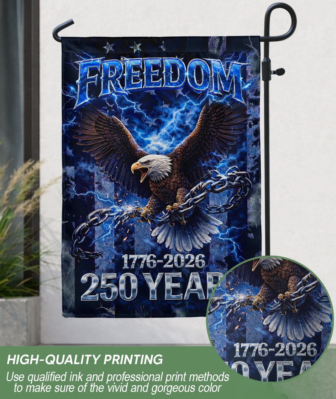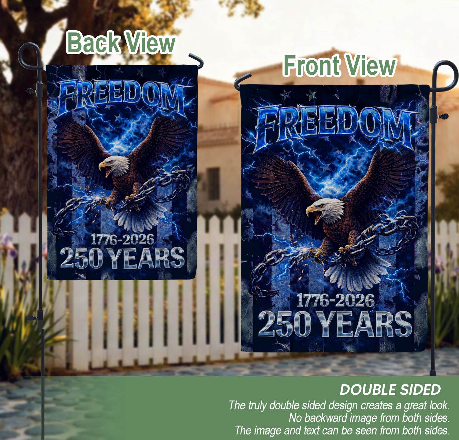Celebrate America’s 250th anniversary from 1776 to 2026 with this striking double-sided house flag featuring a powerful patriotic Freedom Eagle design. Crafted for outdoor durability, this house flag proudly displays the enduring spirit of independence and national pride. Perfect for porches, patios, gardens, or any outdoor space, it withstands weather elements while maintaining vibrant colors on both sides. Ideal for patriots honoring U.S. history, Fourth of July, Memorial Day, or everyday display of American heritage. Easy to hang with standard flagpole hardware, this 28×40-inch flag combines high-quality polyester fabric with vivid printing for long-lasting beauty.