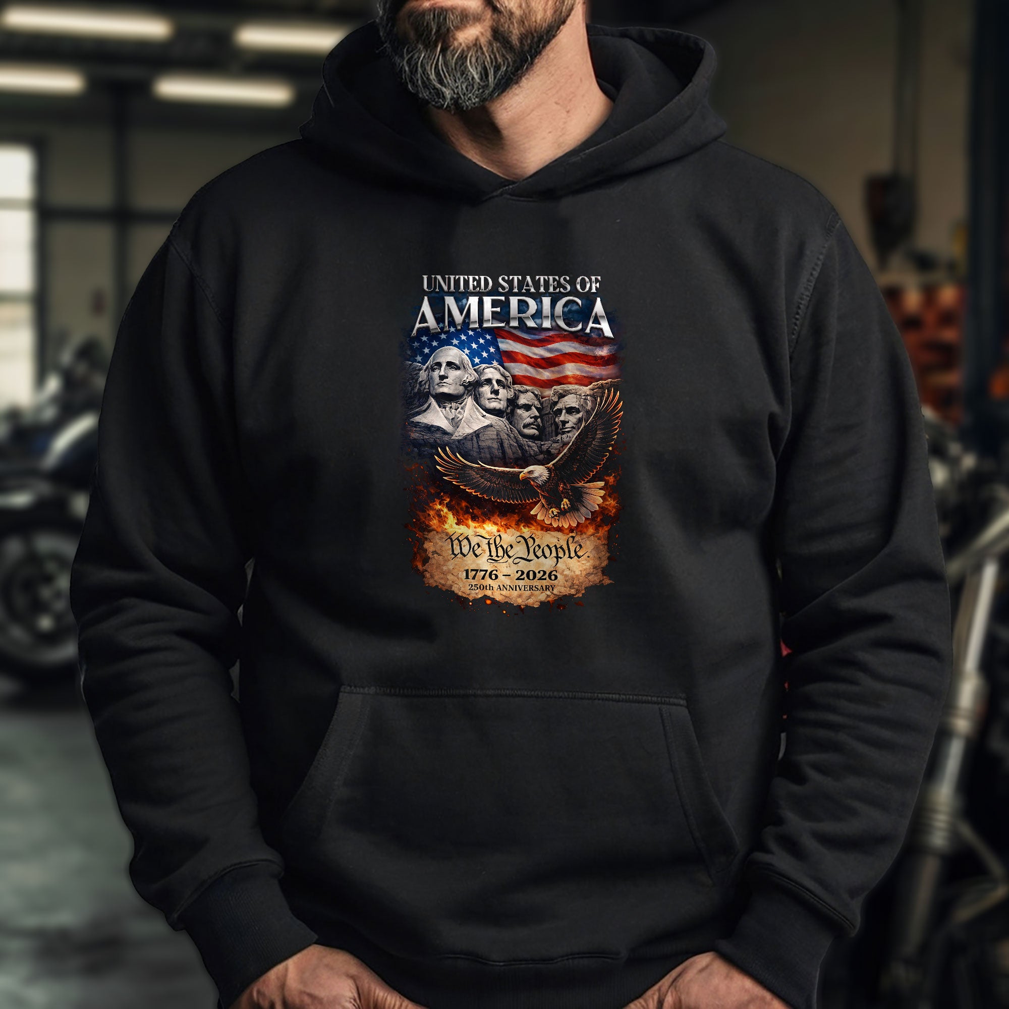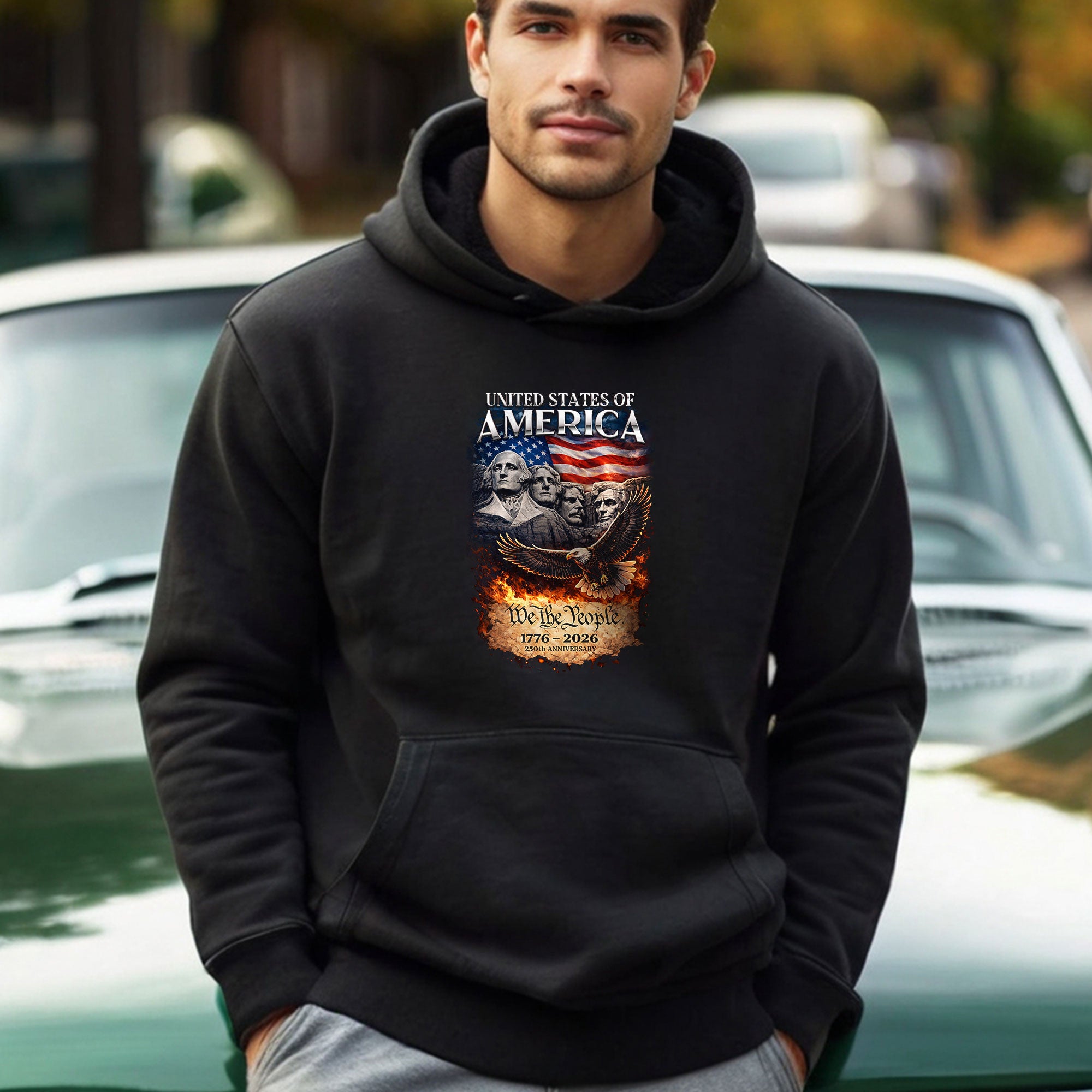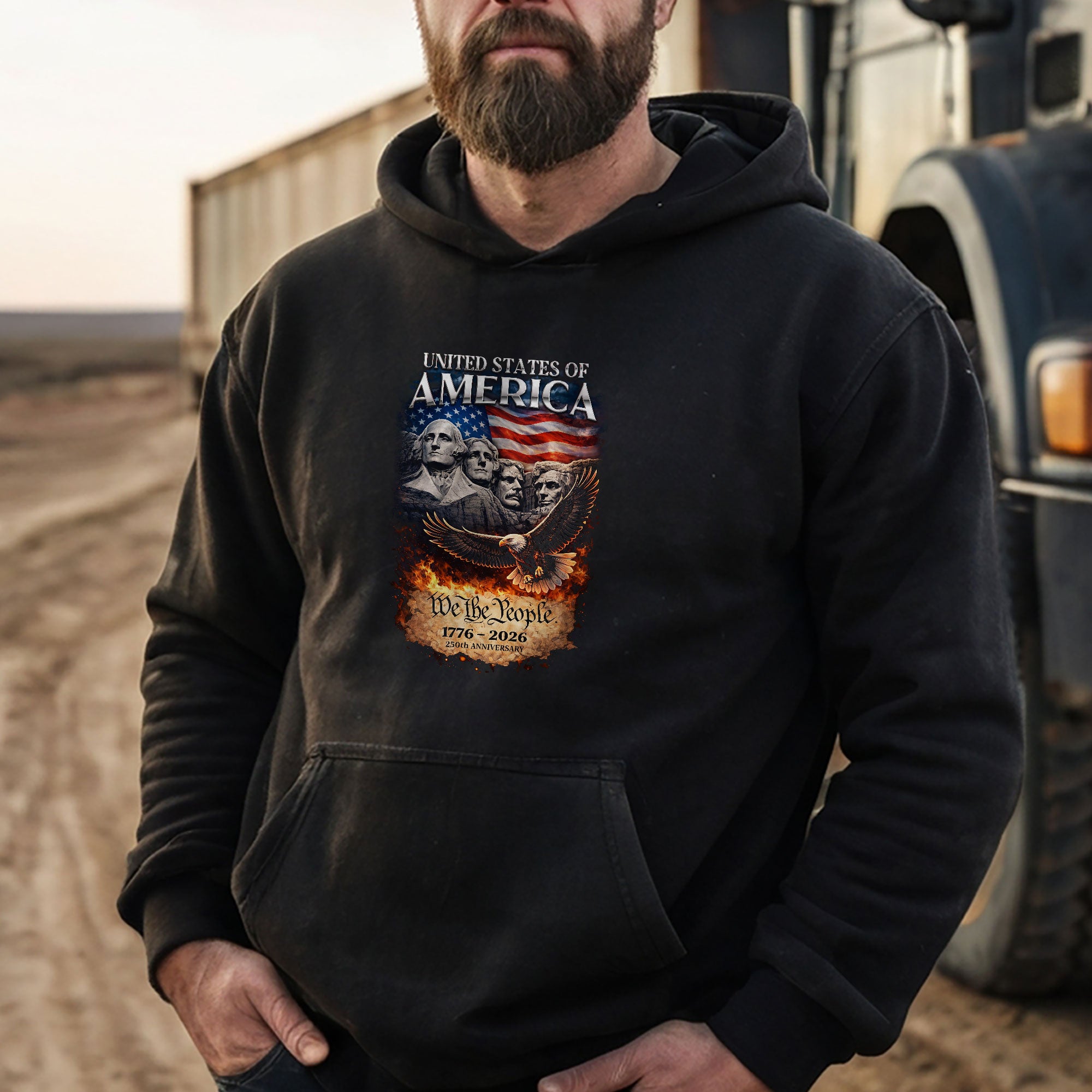 America 250th Anniversary Hoodie 1776-2026 90s Vintage Mount Rushmore Eagle We The People Fire Graphic