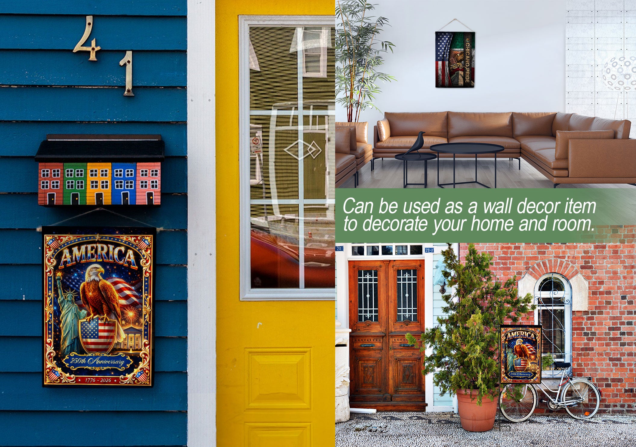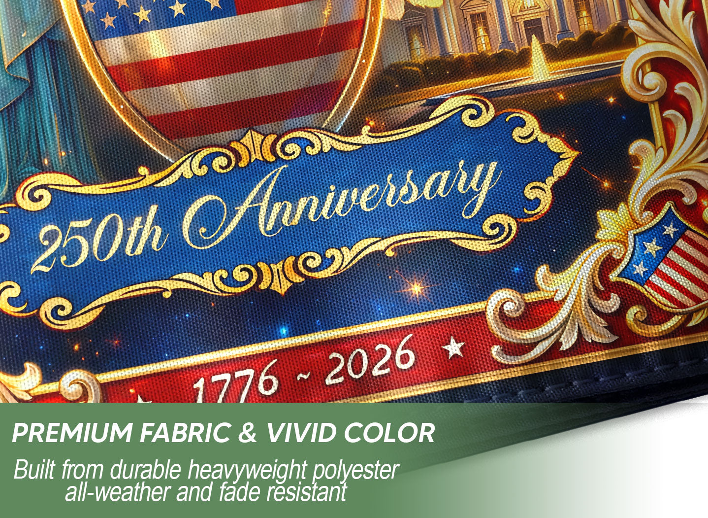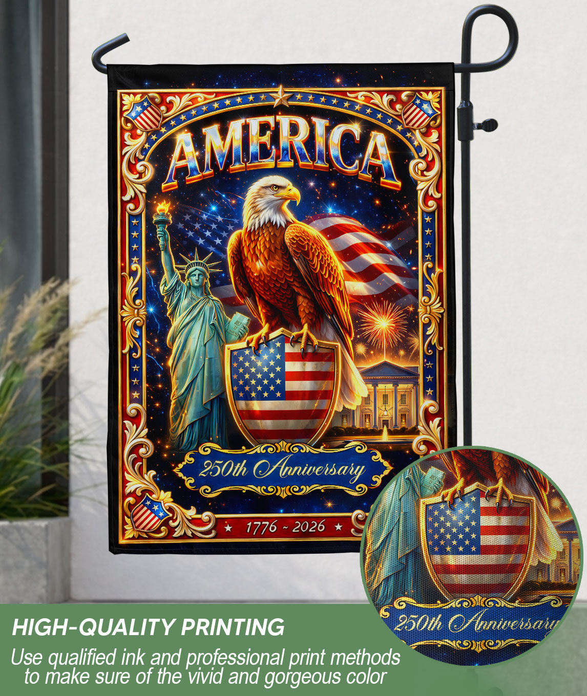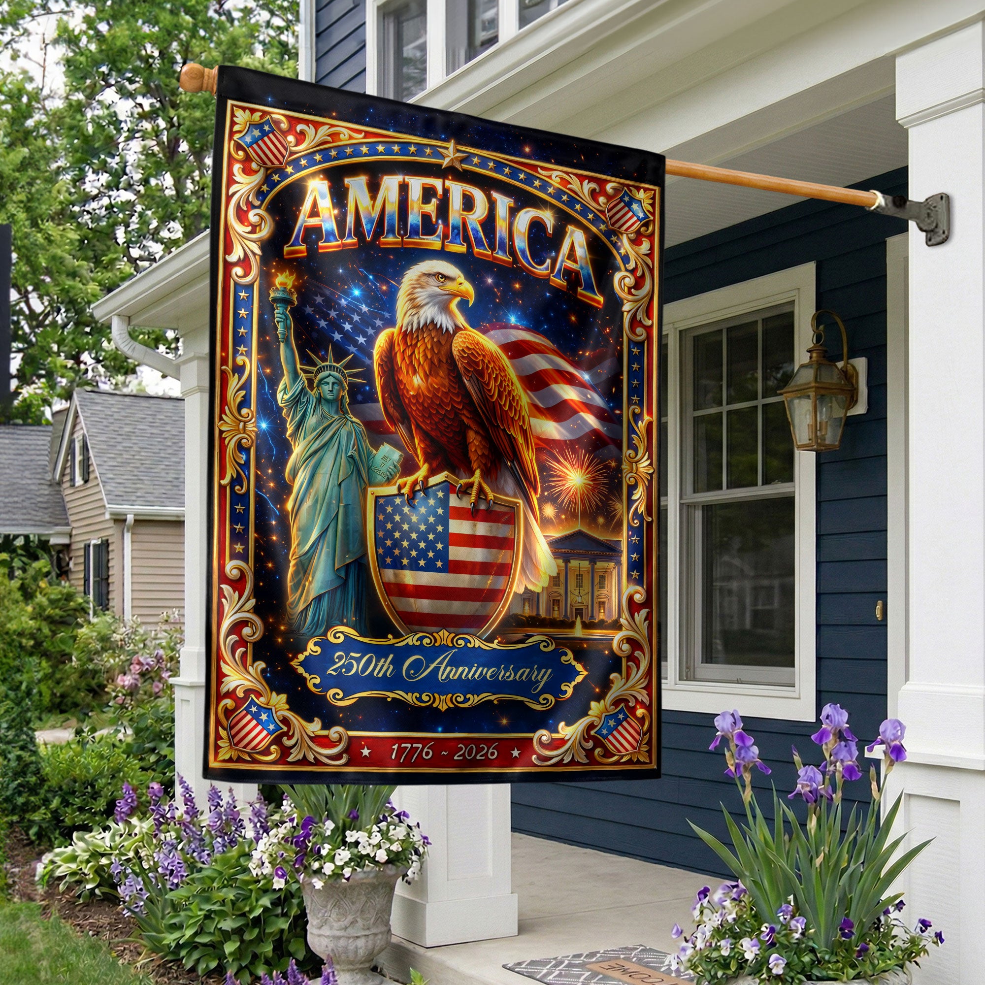 Celebrate the United States’ 250th anniversary from 1776 to 2026 with this striking house flag. Featuring a majestic eagle perched atop the iconic Statue of Liberty and a bold patriotic shield, this vibrant banner embodies American pride, strength, unity, and independence. Crafted for durability and weather resistance, it’s ideal for displaying on your porch, garage, or garden during holidays like the 4th of July, Memorial Day, or year-round to showcase your patriotic spirit. The high-quality polyester material ensures vivid colors that won’t fade easily, making it a meaningful addition to your home decor. Perfect for history enthusiasts, veterans, and anyone honoring America’s legacy of freedom.