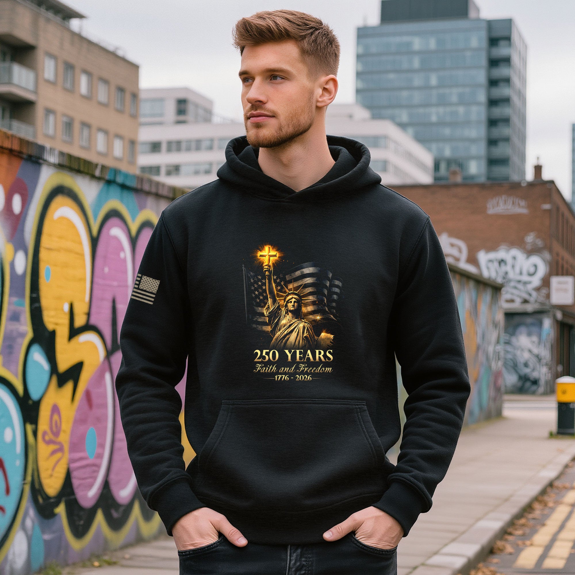 Celebrate America’s 250th anniversary from 1776 to 2026 with this men’s hoodie featuring the iconic Statue of Liberty and Christian cross. This patriotic hoodie symbolizes faith, freedom, and resilience across generations. Crafted for comfort, it’s perfect for everyday wear, casual outings, or showing your pride on Independence Day. Made from soft, durable cotton-poly blend fabric with a cozy hood and kangaroo pocket. Available in multiple sizes for men. Embrace the spirit of liberty upheld by faith in this timeless commemorative design.