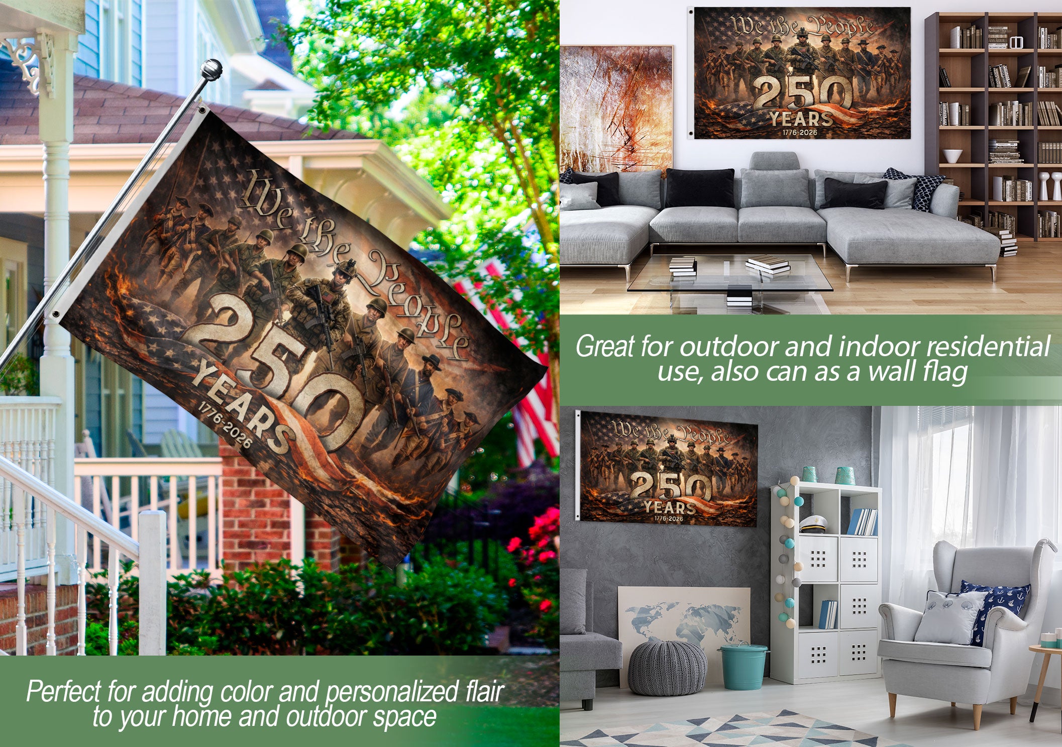 Celebrate 250 years of American freedom with this patriotic garden flag honoring the nation’s journey from 1776 to 2026. Featuring ‘We The People’ alongside imagery of soldiers from past and present, it symbolizes courage, service, and the shared identity that carries freedom forward through every generation. Perfect for gardens, porches, or patios to display national pride during the 250th anniversary. Durable fabric withstands outdoor conditions, double-sided printing ensures visibility from all angles. Ideal for veterans, history enthusiasts, and patriots commemorating America’s enduring spirit.