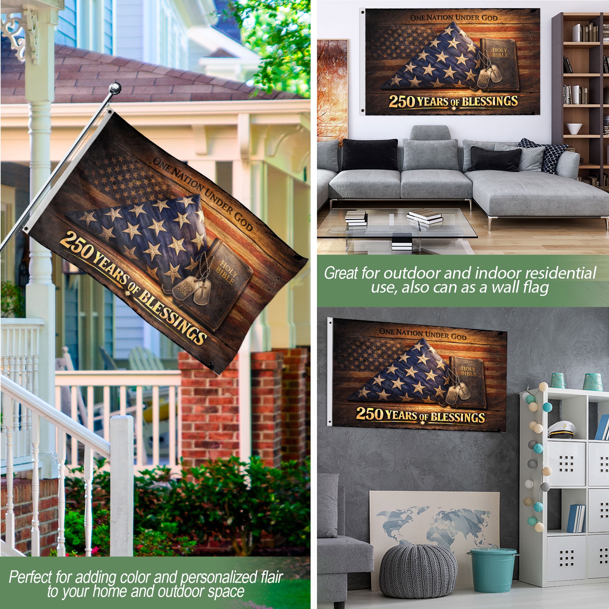 Celebrate America’s 250th anniversary from 1776 to 2026 with this striking Christian flag banner. Featuring the Holy Bible and ‘One Nation Under God’ design, this double-sided house flag showcases patriotic pride and religious faith. Crafted from premium polyester fabric, it delivers vibrant, fade-resistant colors visible from both sides. Weather-resistant properties protect against rain, wind, and sun, making it ideal for long-term outdoor display on porches, garages, or home exteriors. Reinforced grommets allow for easy hanging with ropes or clips. Perfect for patriots, Christians, and history lovers honoring the nation’s enduring values of hope, tradition, and divine guidance during the 2026 semiquincentennial observance. Durable construction ensures it withstands the elements while proudly waving your faith and American spirit.