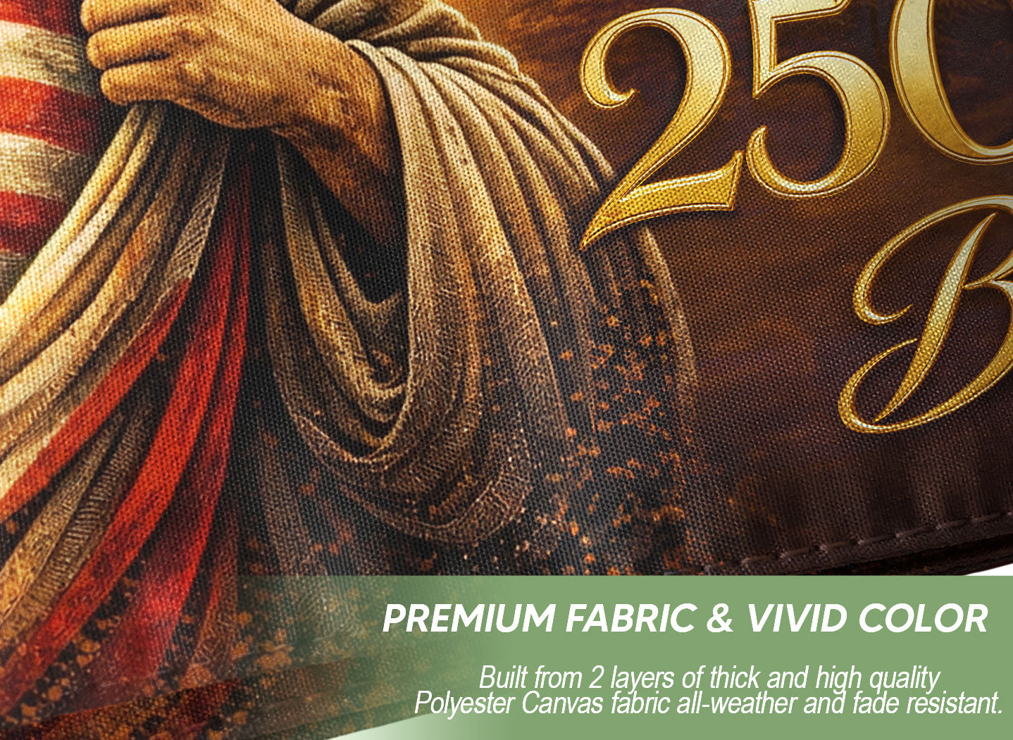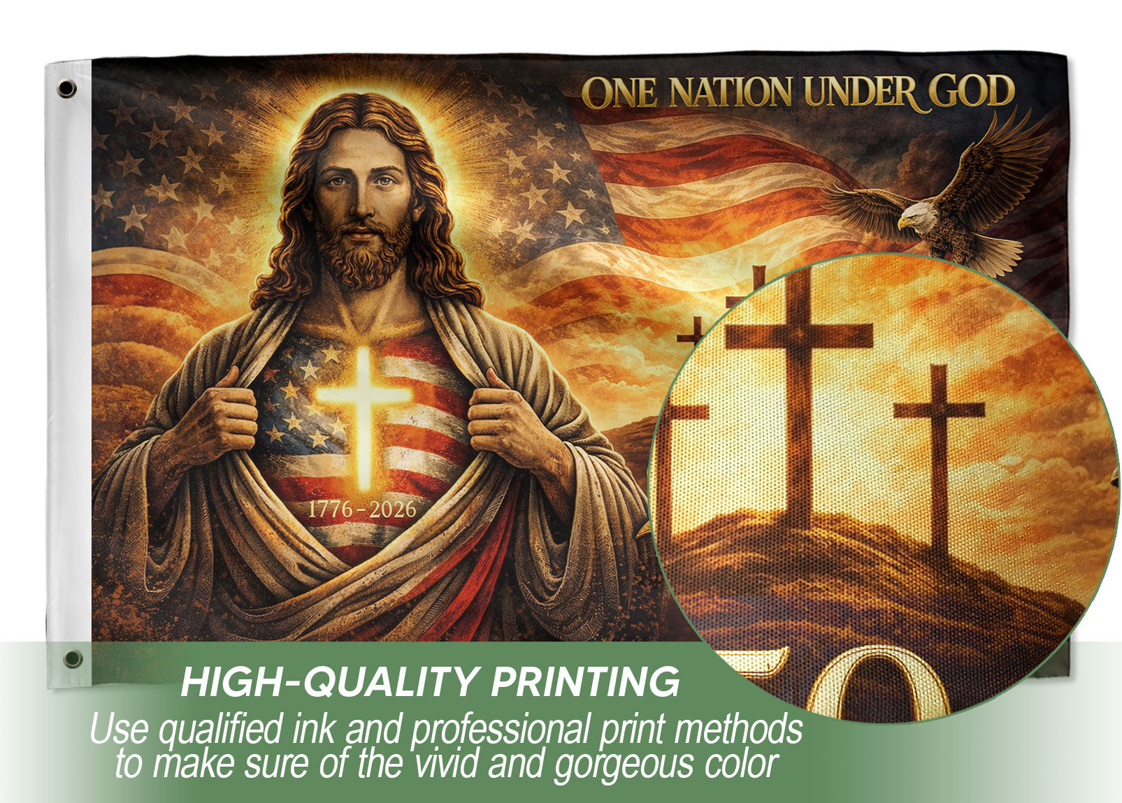 Celebrate America’s 250th anniversary with the Christian American Heritage Flag, an outdoor banner featuring powerful symbols of faith and patriotism: Jesus, majestic eagle, Liberty Bell, and crosses. Made from durable, weather-resistant polyester fabric, this double-sided banner measures 3×5 ft with vibrant, fade-resistant printing for bold visibility from any angle. Ideal for flagpoles, porches, garages, patriotic events, churches, rallies, or home displays. Double-stitched edges and reinforced brass grommets provide superior strength against wind and weather, ensuring long-lasting performance. Honor the nation’s founding principles, spiritual heritage, and resilient spirit with this meaningful polyester flag that combines Christian devotion and American pride.
