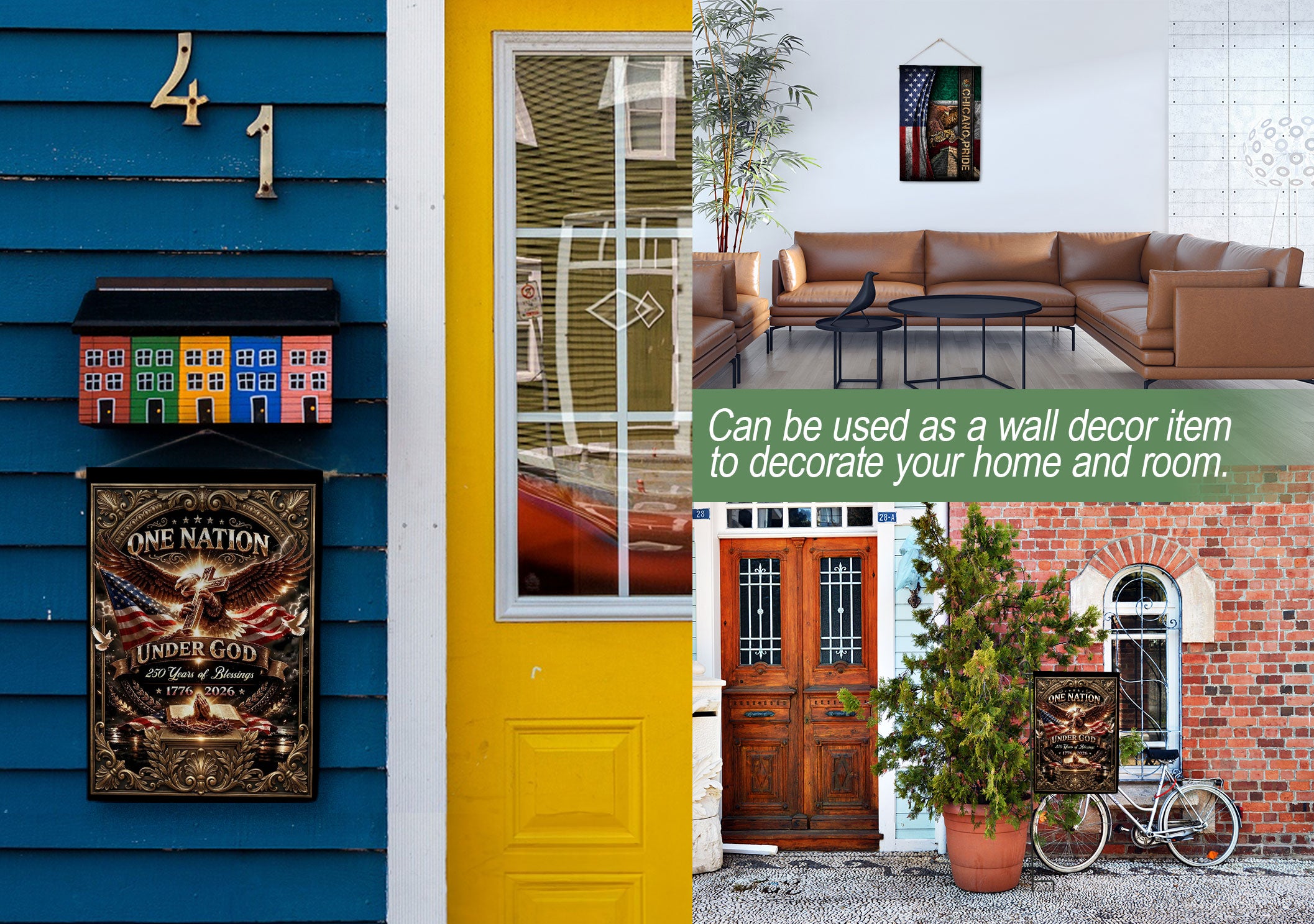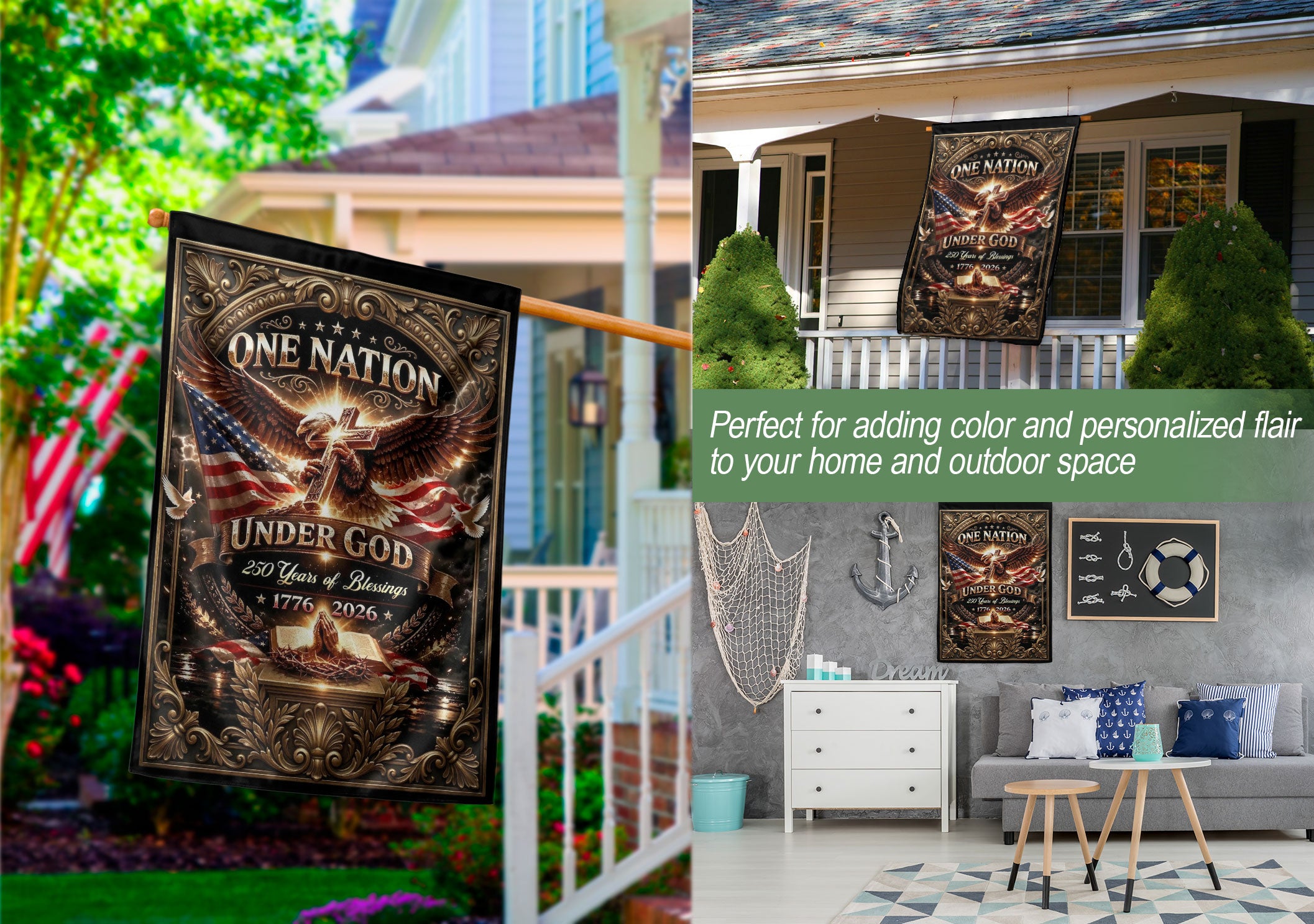 Celebrate 250 years of American blessings with this Christian One Nation Under God garden flag. Featuring a striking eagle and cross design, it symbolizes strength, faith, hope, and divine guidance over the nation’s history from 1776 to 2026. Crafted for outdoor use, this patriotic faith banner is ideal for gardens, porches, mailboxes, or patios. Made from durable, weather-resistant polyester fabric to withstand sun, wind, and rain while maintaining vibrant colors. Double-sided printing ensures clear visibility from both sides. Easy to hang with a sleeve for standard garden flag poles (pole not included). Perfect for Independence Day, Memorial Day, Fourth of July, or everyday display of Christian patriotism and gratitude to God. Measures approximately 12.5 x 18 inches, standard garden flag size. Express your belief in ‘One Nation Under God’ with this meaningful USA commemorative flag.