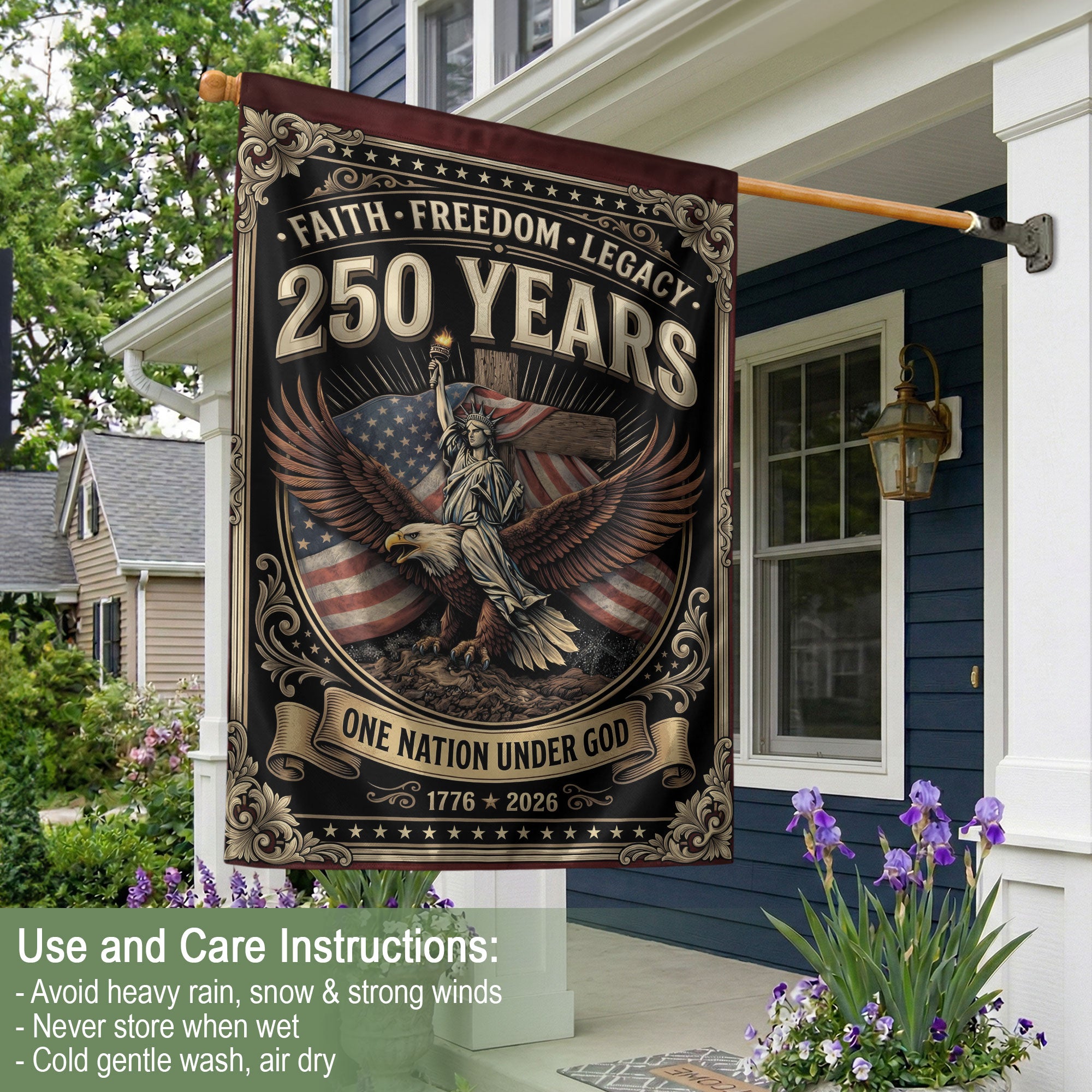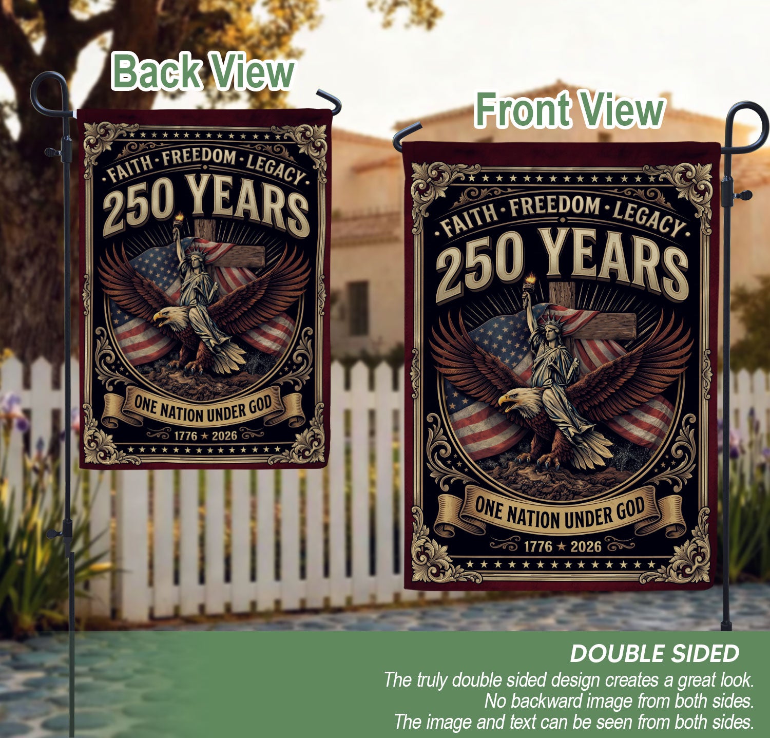 Celebrate American heritage and Christian faith with this double-sided patriotic garden flag. The bold design features ‘One Nation Under God,’ a majestic eagle, patriotic cross, ‘We The People,’ and ‘Faith and Freedom’ to honor 250 years of USA independence, unity, and liberty. Crafted for durability, this garden flag withstands outdoor conditions and displays proudly from both sides. Ideal for gardens, porches, patios, or yards, it’s perfect for patriots, Christians, and history lovers. Use it year-round or during holidays like Independence Day, Memorial Day, and the 250th anniversary celebrations to showcase national pride and spiritual values.