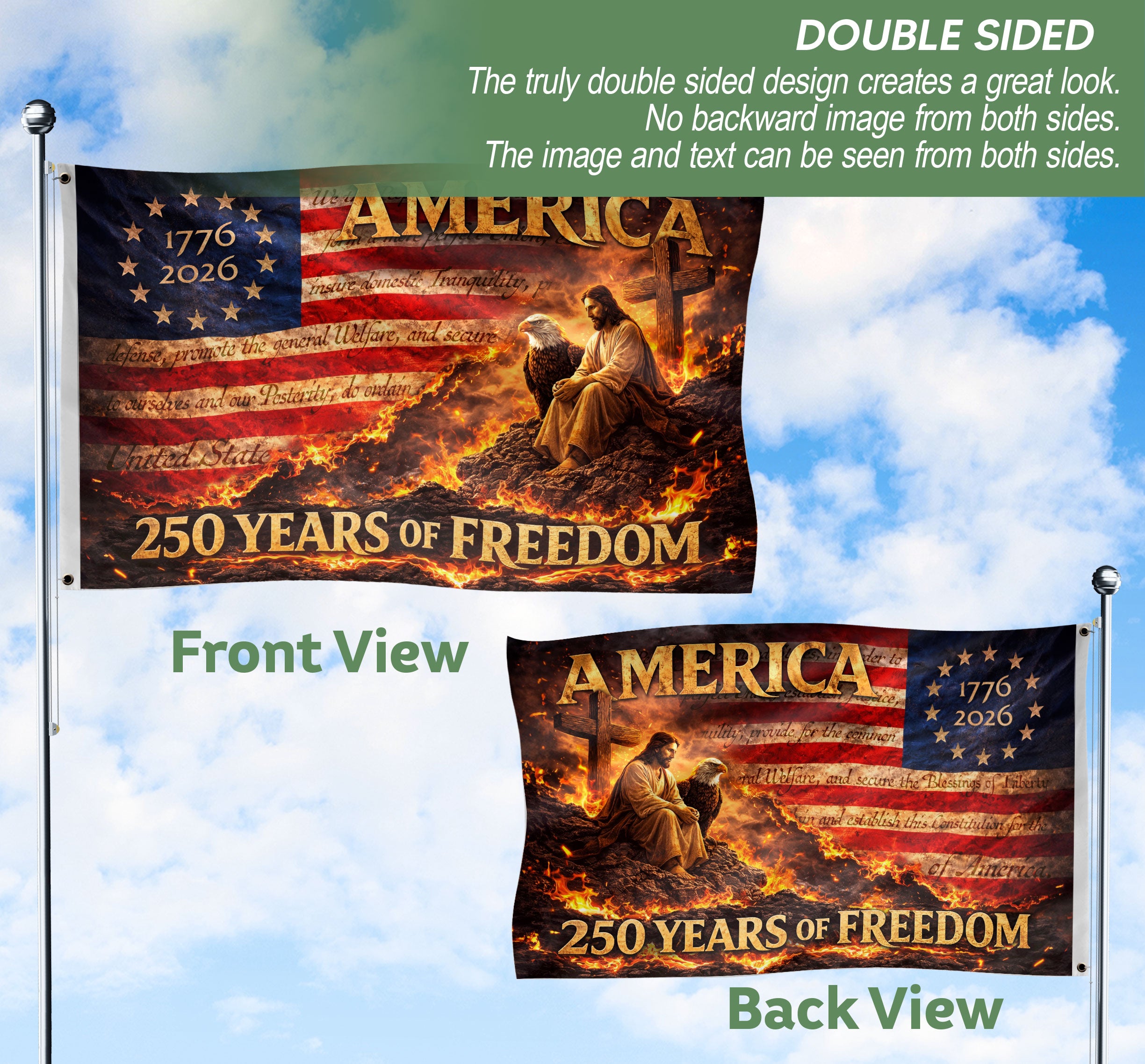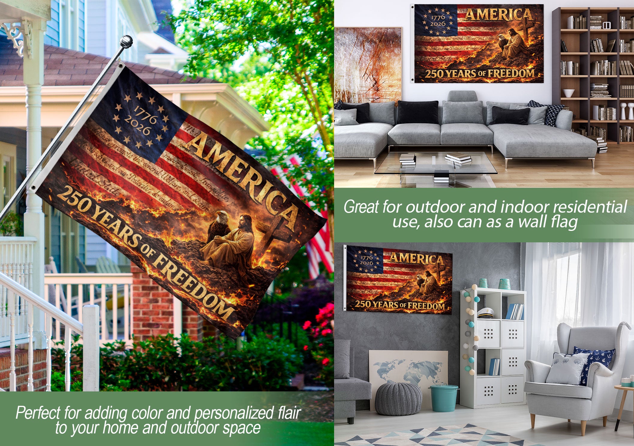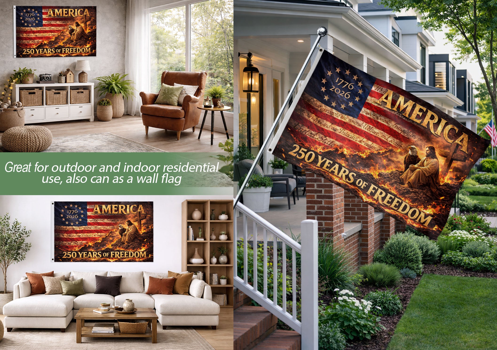 Celebrate the 250th anniversary of the United States from 1776 to 2026 with this Christian USA house flag. Featuring a striking design with a cross, majestic eagle, and ‘We The People’ theme, this patriotic flag honors American heritage and Christian faith. Perfect for displaying on your front porch, yard, or home to inspire pride and freedom. Durable construction ensures it withstands outdoor conditions while adding a meaningful touch to any space. Ideal for patriots, history enthusiasts, and those commemorating 250 years of independence.