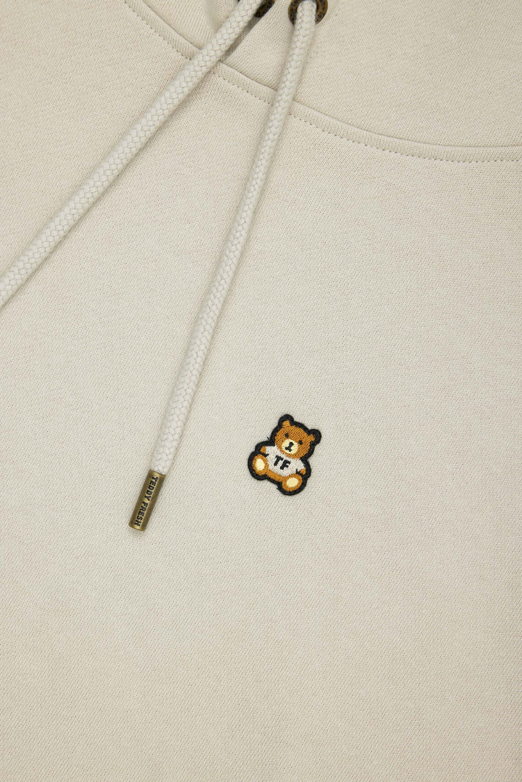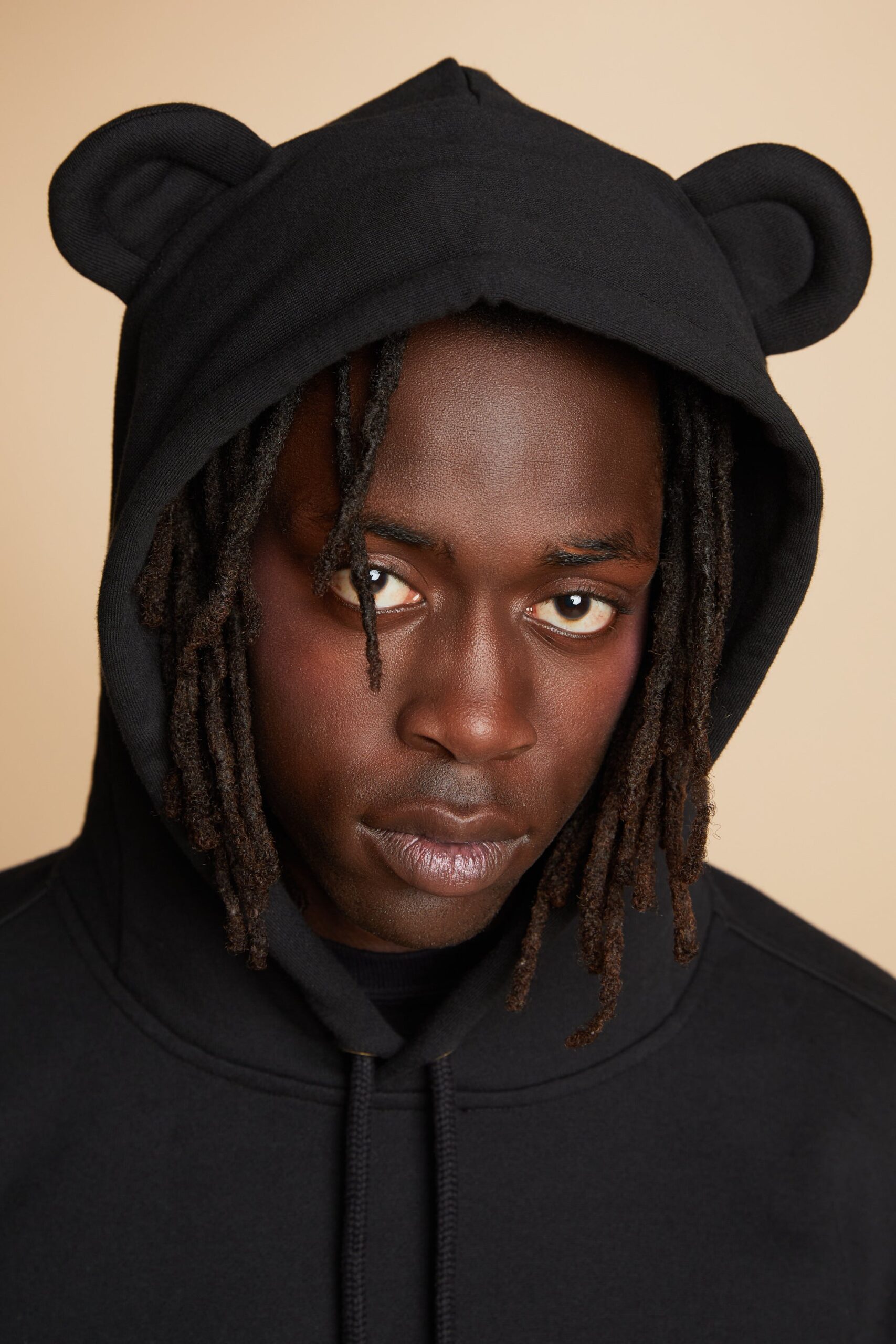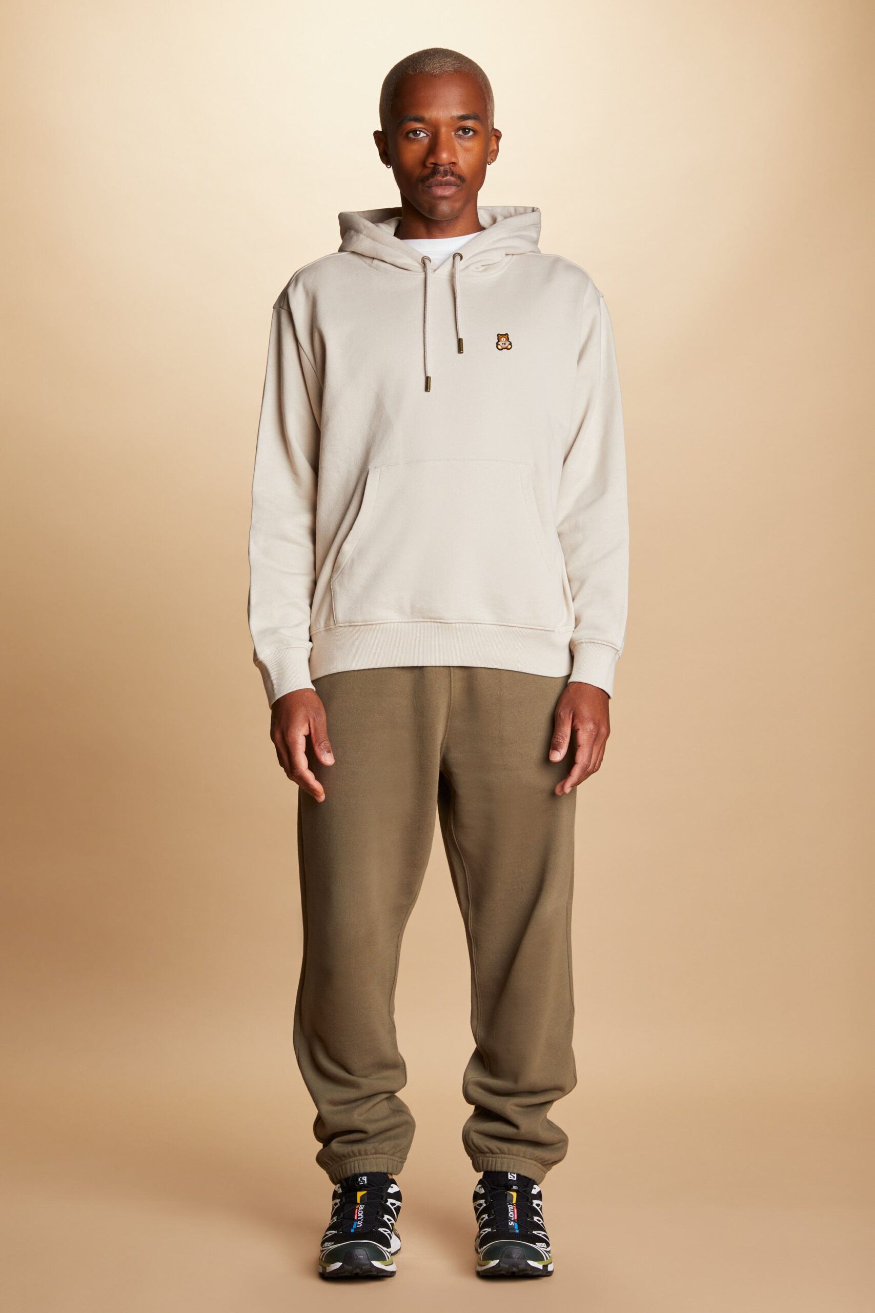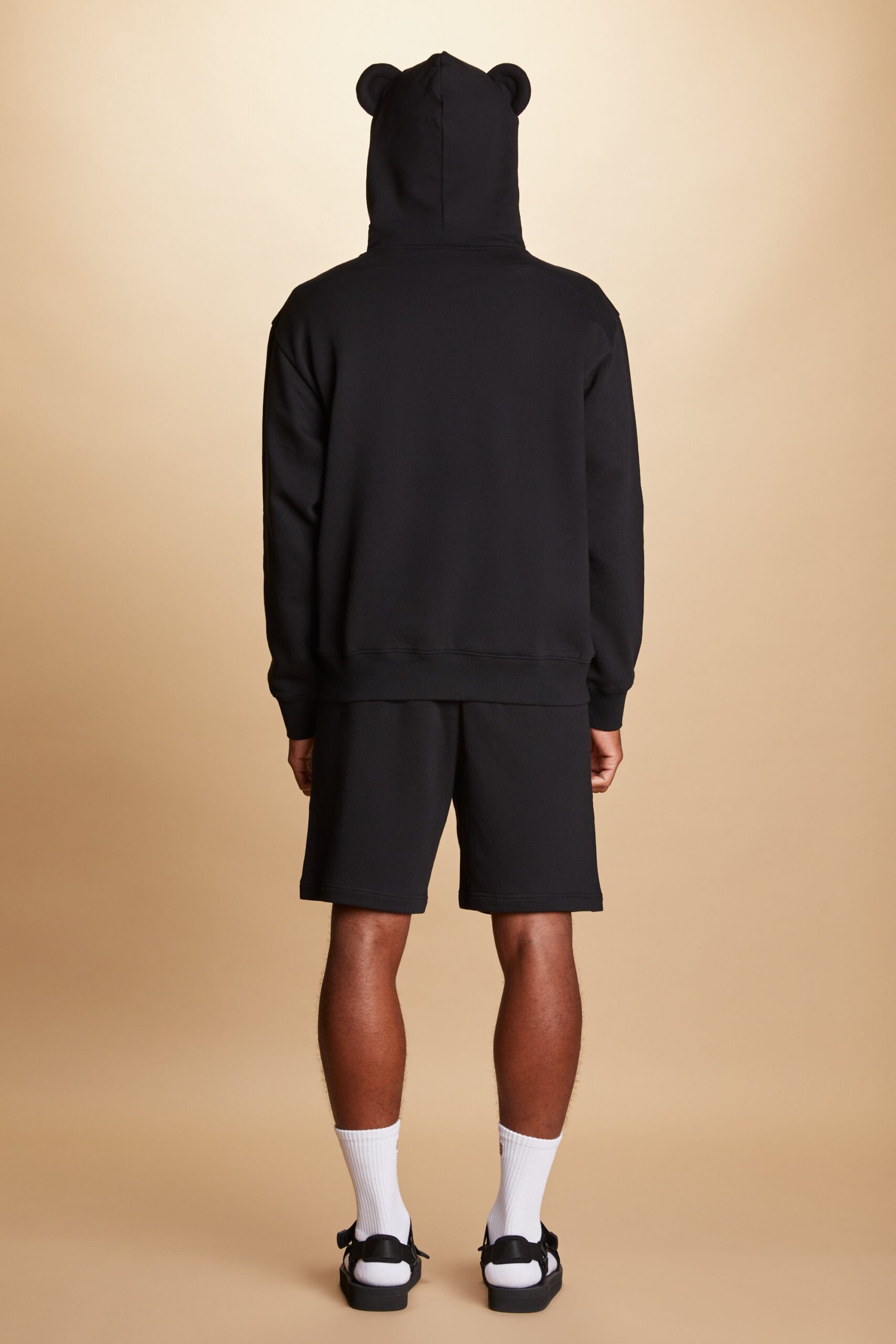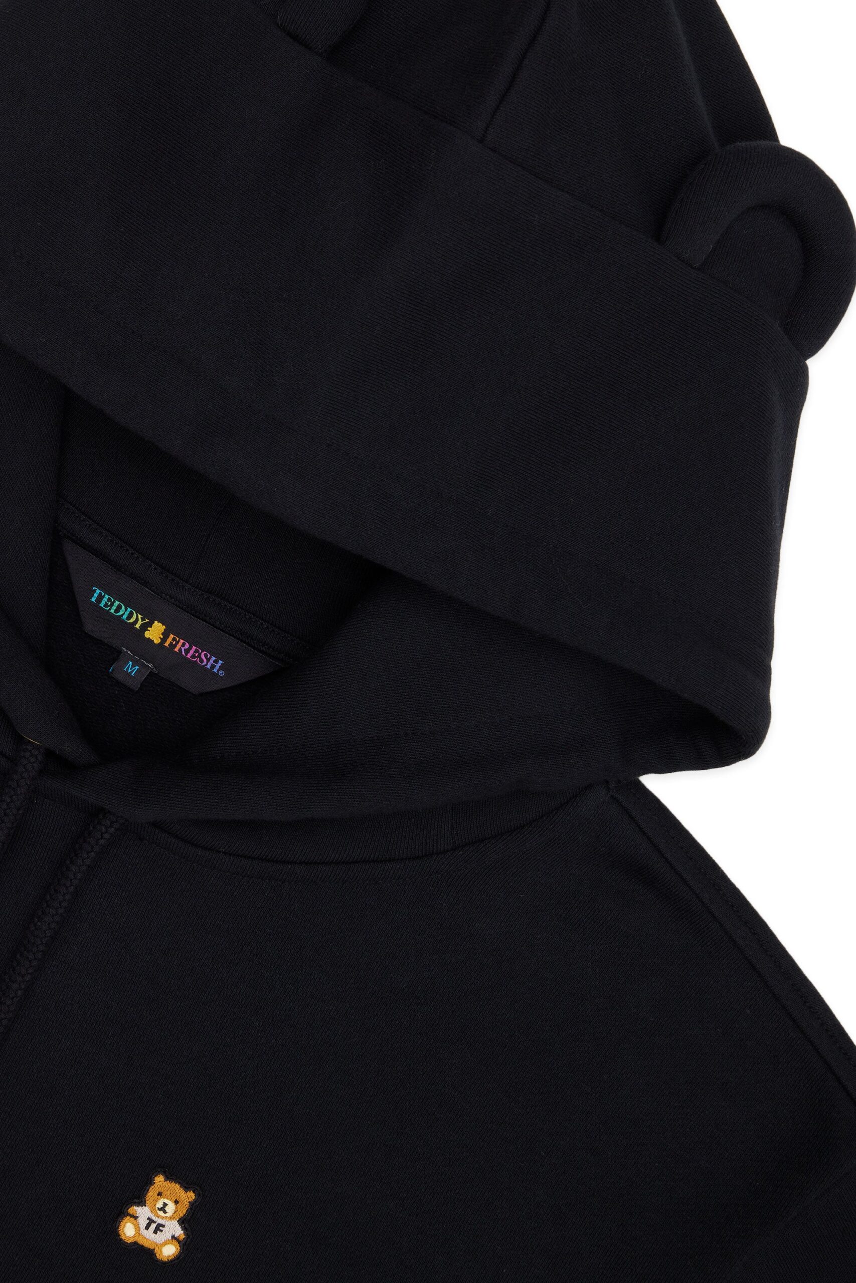 DETAILS Fleece hoodie with bear ears Braided drawcord hood with with debossed metal aglets Embroidered bear patch on chest Ribbed cuffs, neckband, and waistband Kangaroo pocket 100% Pre-shrunk cotton fleece, 320gsm, fabric piece dyed FIT Unisex regular fit Size Medium: Chest: 48″ Length: 27″ (measured flat) Malcolm is 6’1″ and wearing size L Model’s chest/bust: 36″ Model’s waist: 32″ Horace is 6’0″ and wearing size M Model’s chest/bust: 40″ Model’s waist: 31″ Model’s hip: 30″