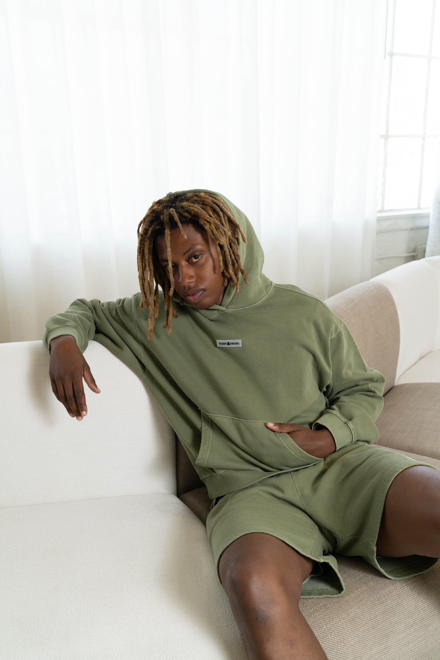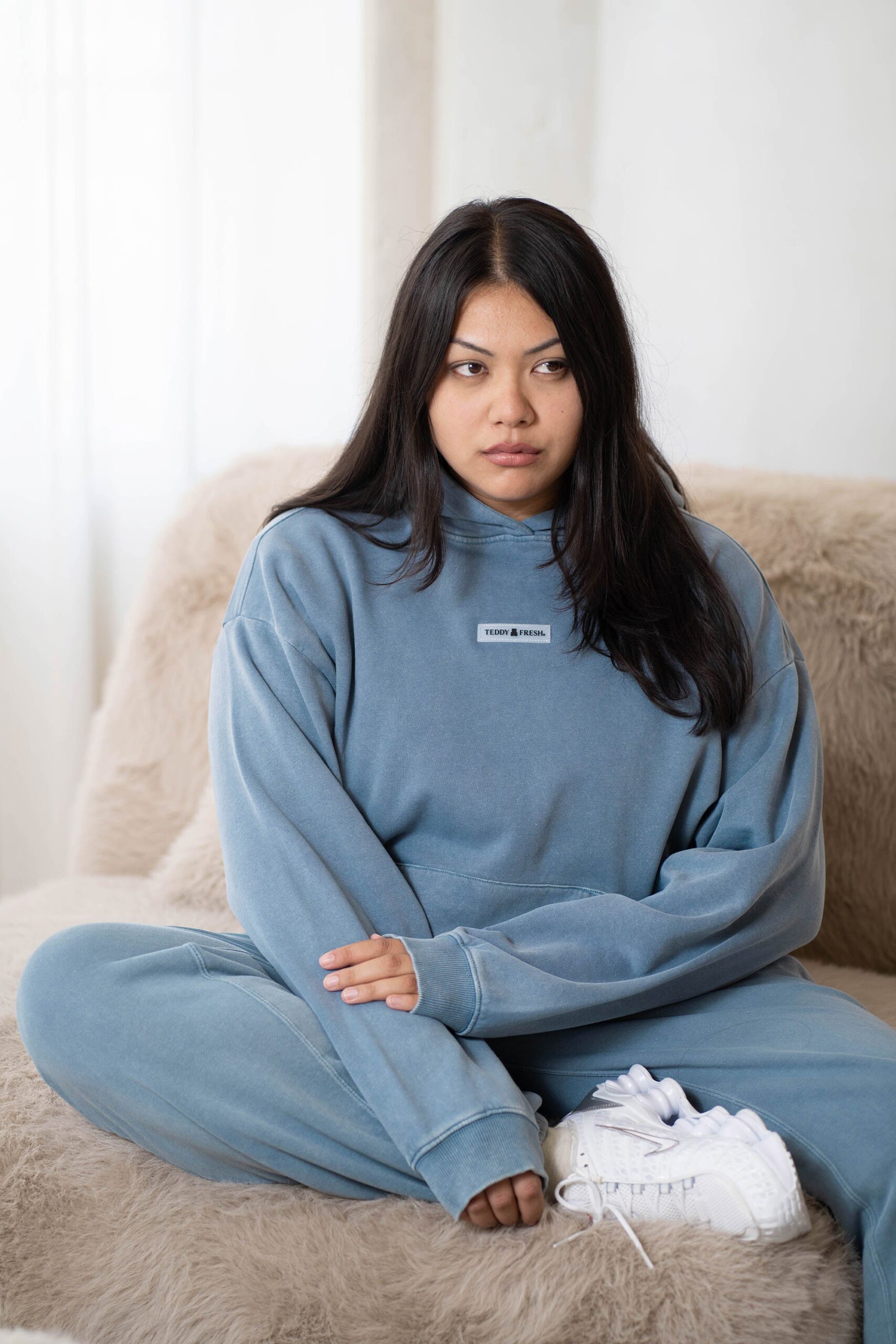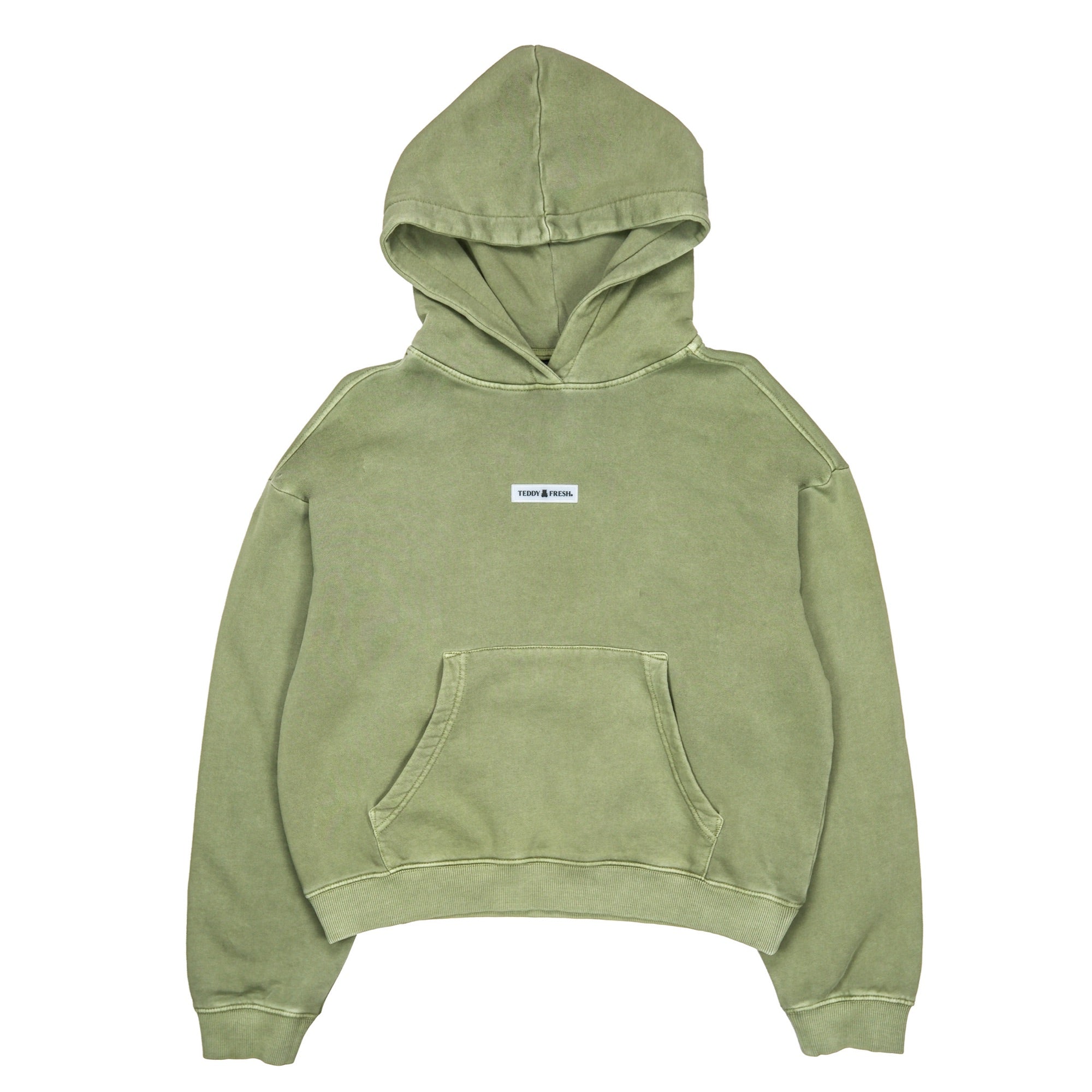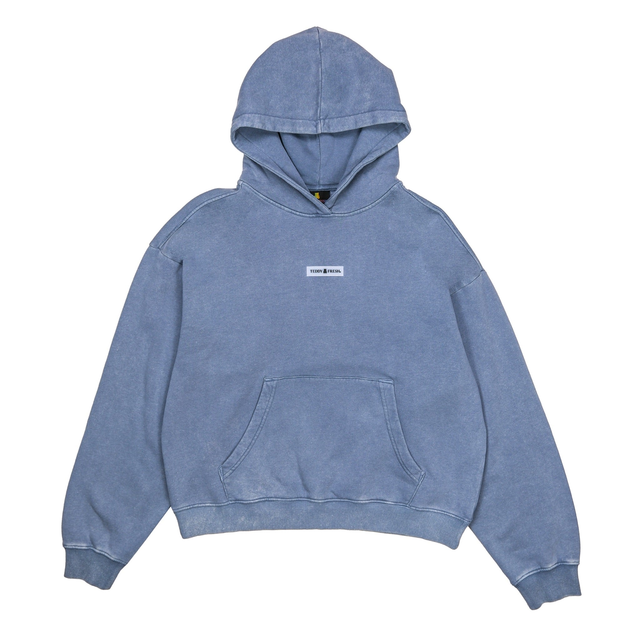 DETAILS Pigment dyed garment washed pullover fleece hoodie Embossed TF silicone label on chest Ribbed cuffs and waistband Kangaroo pocket This garment has undergone a special dye process and is subject to natural variations. No two pieces are alike. 100% Cotton, 320gsm FIT Unisex Boxy Fit Size Medium: Chest: 50″ Length: 25.5″ Sleeve: 23″ Bailey is 5’5″ and wearing size S Model’s chest/bust: 32″ Model’s waist: 25″ Model’s hip: 31″ Maddie is 5’10” and wearing size XL Model’s chest/bust: 42″ Model’s waist: 38″ Model’s hip: 44″ Jawn is 6’0″ and wearing size M Model’s chest/bust: 36″ Model’s waist: 32″ Model’s hip: 40″ CARE Our pigment-dyed garments are designed to have a lived-in, vintage look that may continue to fade slightly over time with washing. This is part of their unique character. To help maintain the look and quality of your pigment-dyed garments, we suggest the following care instructions: Turn the garment inside out before washing. Use cold water and a gentle cycle. Wash separately or with like colors, especially for the first few washes. Do not pour detergent directly onto the garment. Instead, dilute detergent in water first or add it to the washing machine drum before adding garments to the cycle. Use a mild detergent. Avoid bleach or harsh chemicals. Lay flat to dry to prevent shrinking and fading.