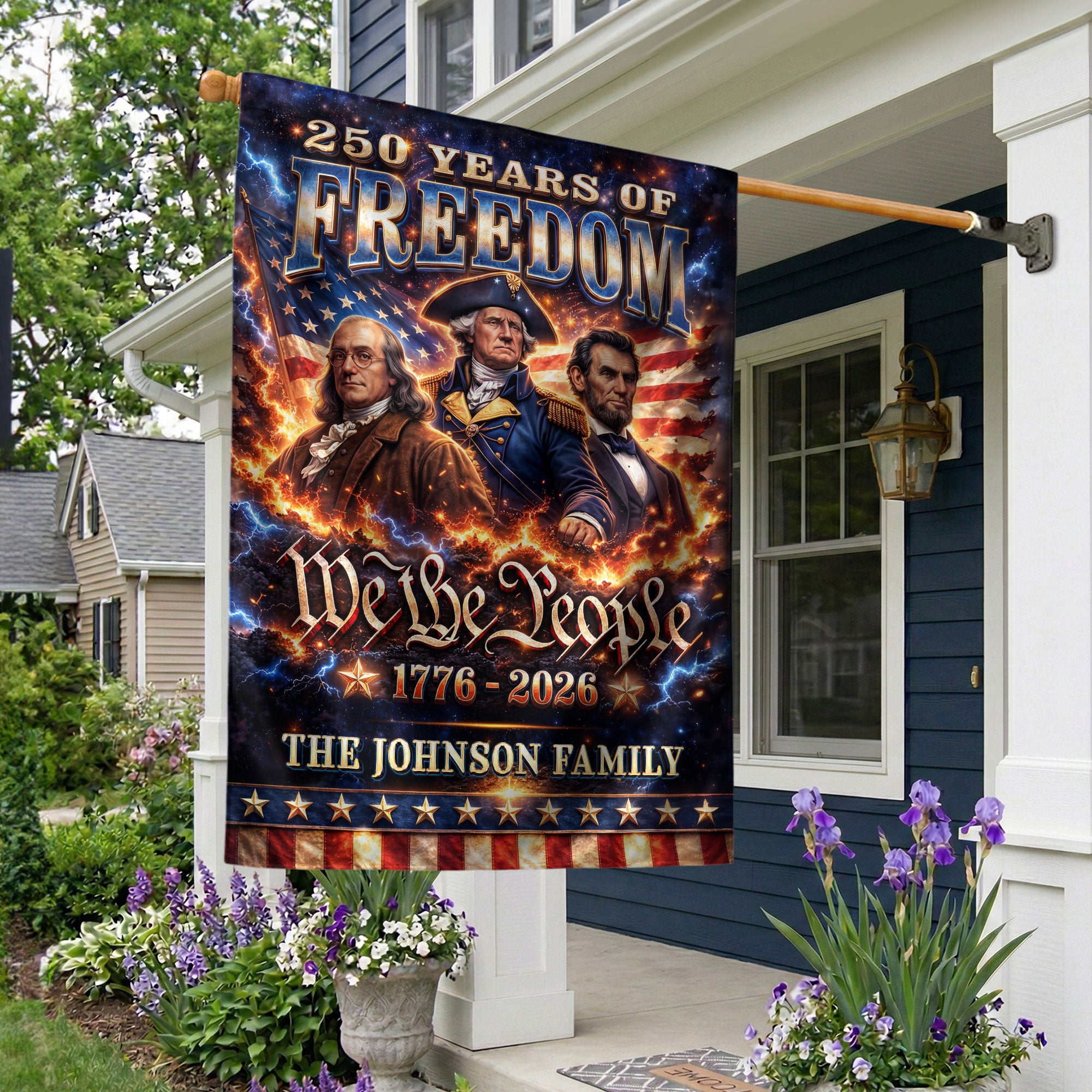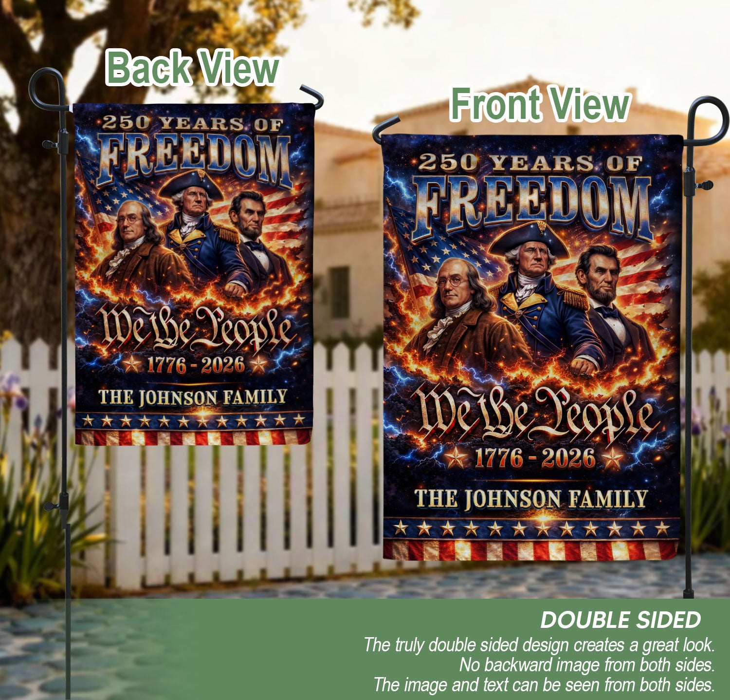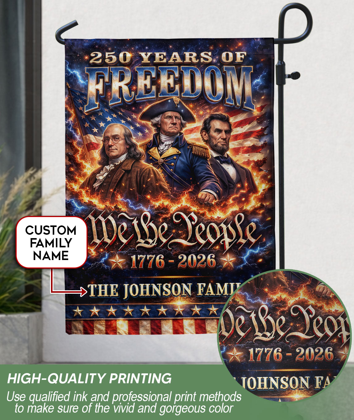 Celebrate America’s 250th anniversary with this personalized garden flag featuring custom family name. Showcases iconic portraits of Founding Fathers Benjamin Franklin and George Washington, plus Abraham Lincoln, the historic ‘We the People’ inscription, and the American flag. Honors the journey from 1776 to 2026, perfect for patriotic displays in gardens, yards, or porches. Durable fabric withstands outdoor conditions, vibrant colors and detailed printing ensure long-lasting appeal. Ideal for history enthusiasts, veterans, or families marking this milestone with a unique, custom touch.