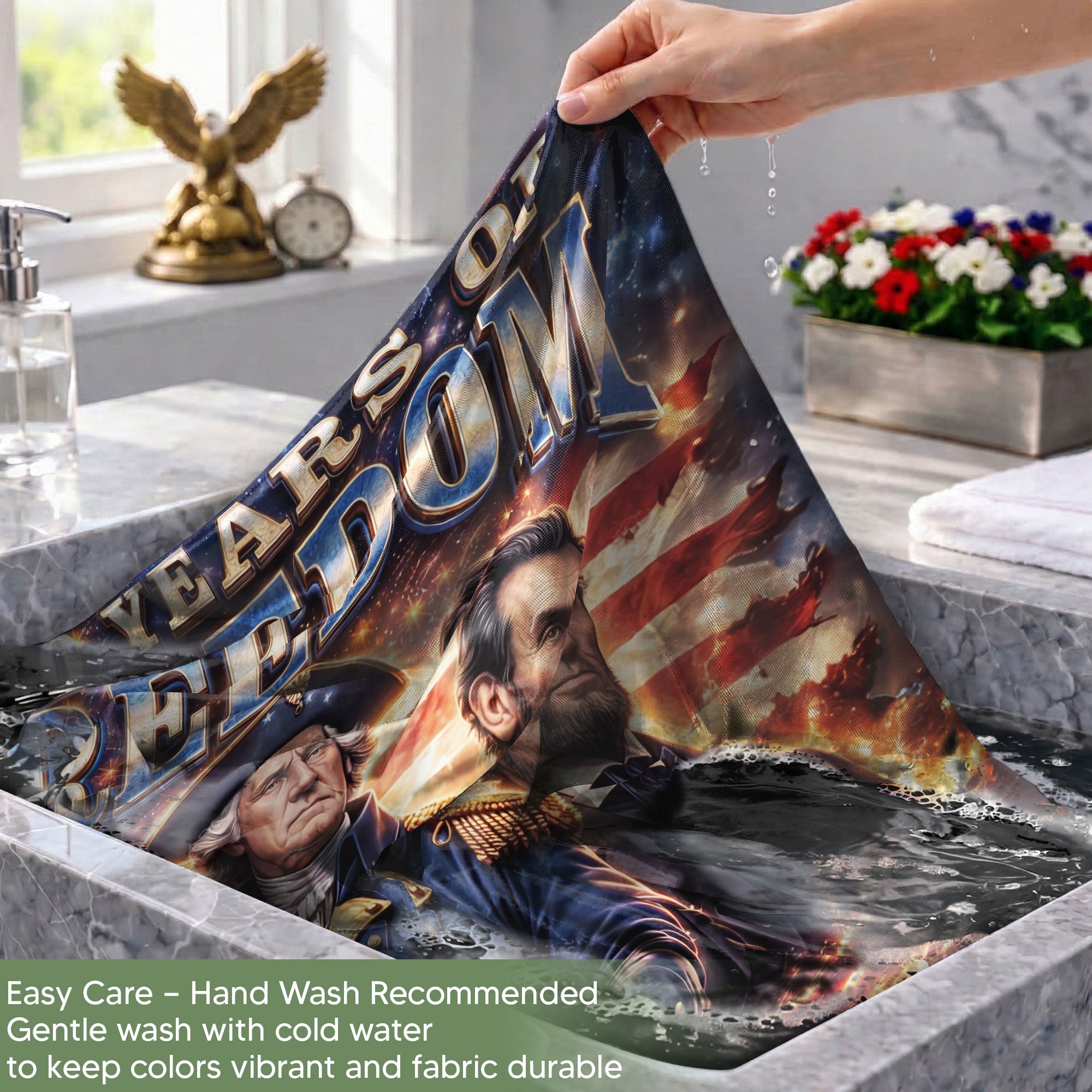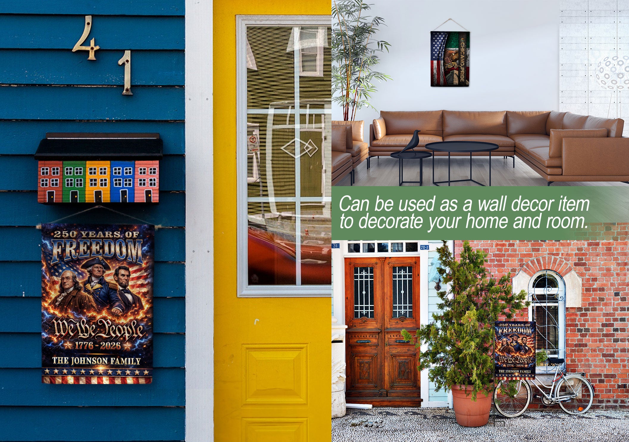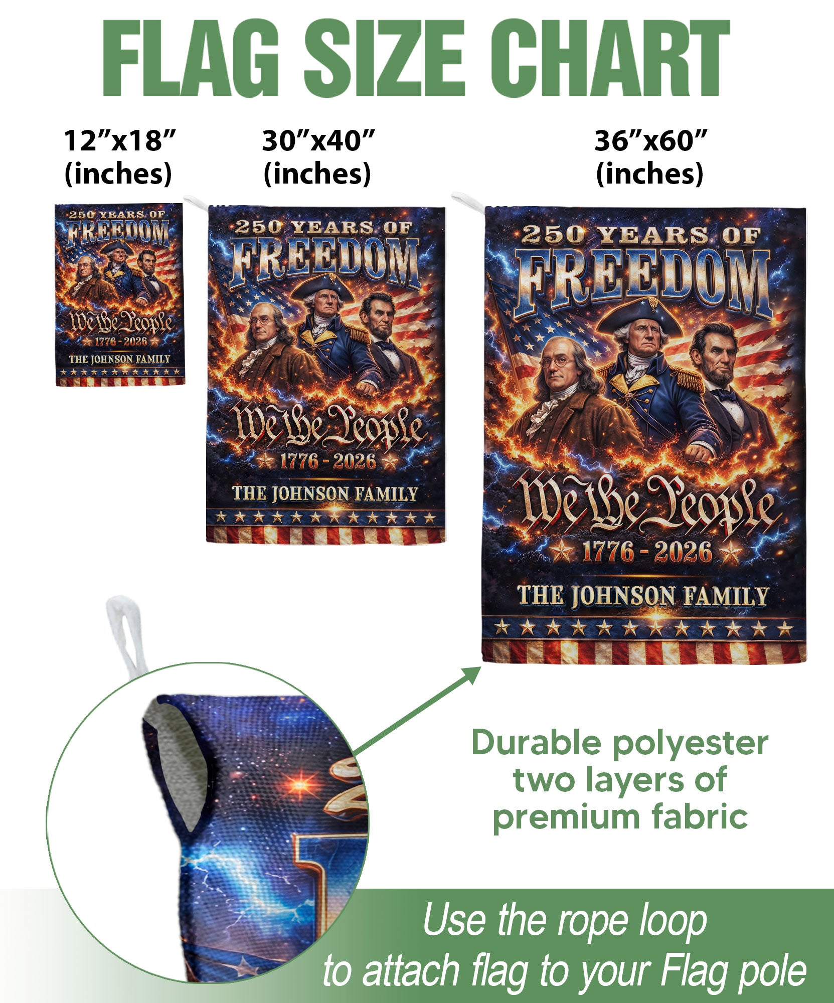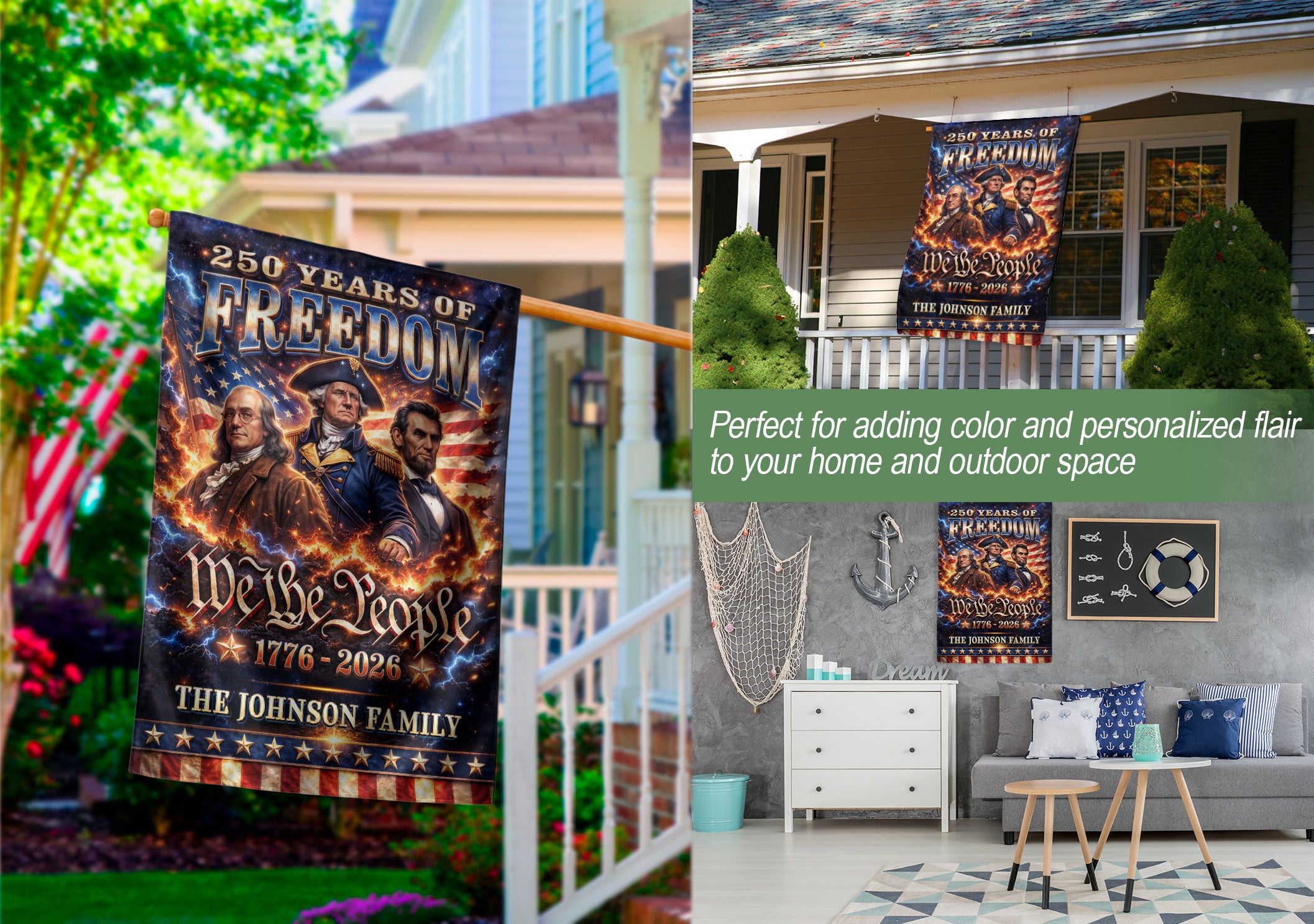 Celebrate America’s 250th anniversary with this personalized garden flag featuring custom family name. Showcases iconic portraits of Founding Fathers Benjamin Franklin and George Washington, plus Abraham Lincoln, the historic ‘We the People’ inscription, and the American flag. Honors the journey from 1776 to 2026, perfect for patriotic displays in gardens, yards, or porches. Durable fabric withstands outdoor conditions, vibrant colors and detailed printing ensure long-lasting appeal. Ideal for history enthusiasts, veterans, or families marking this milestone with a unique, custom touch.