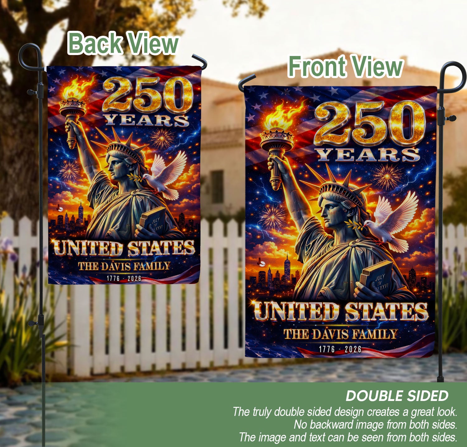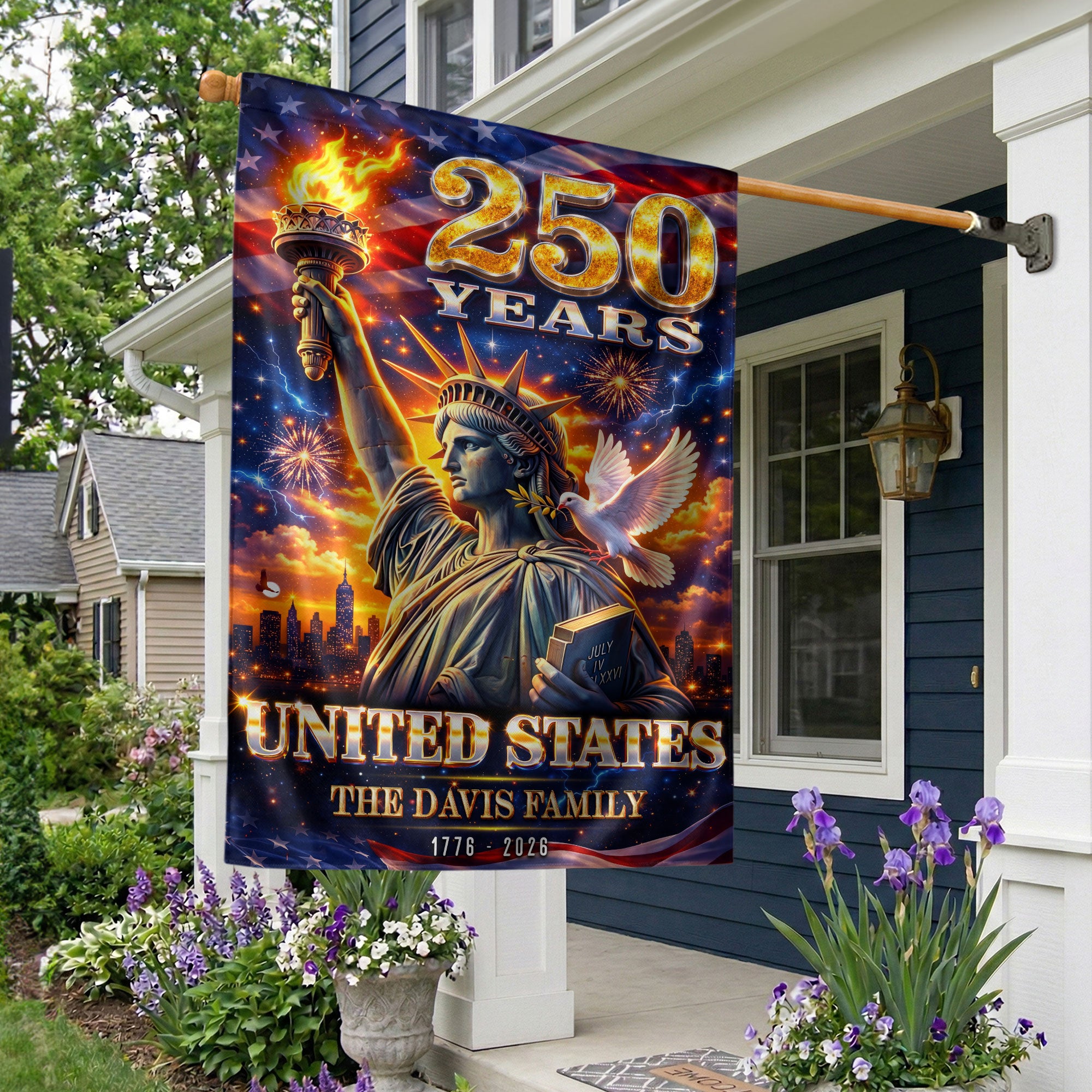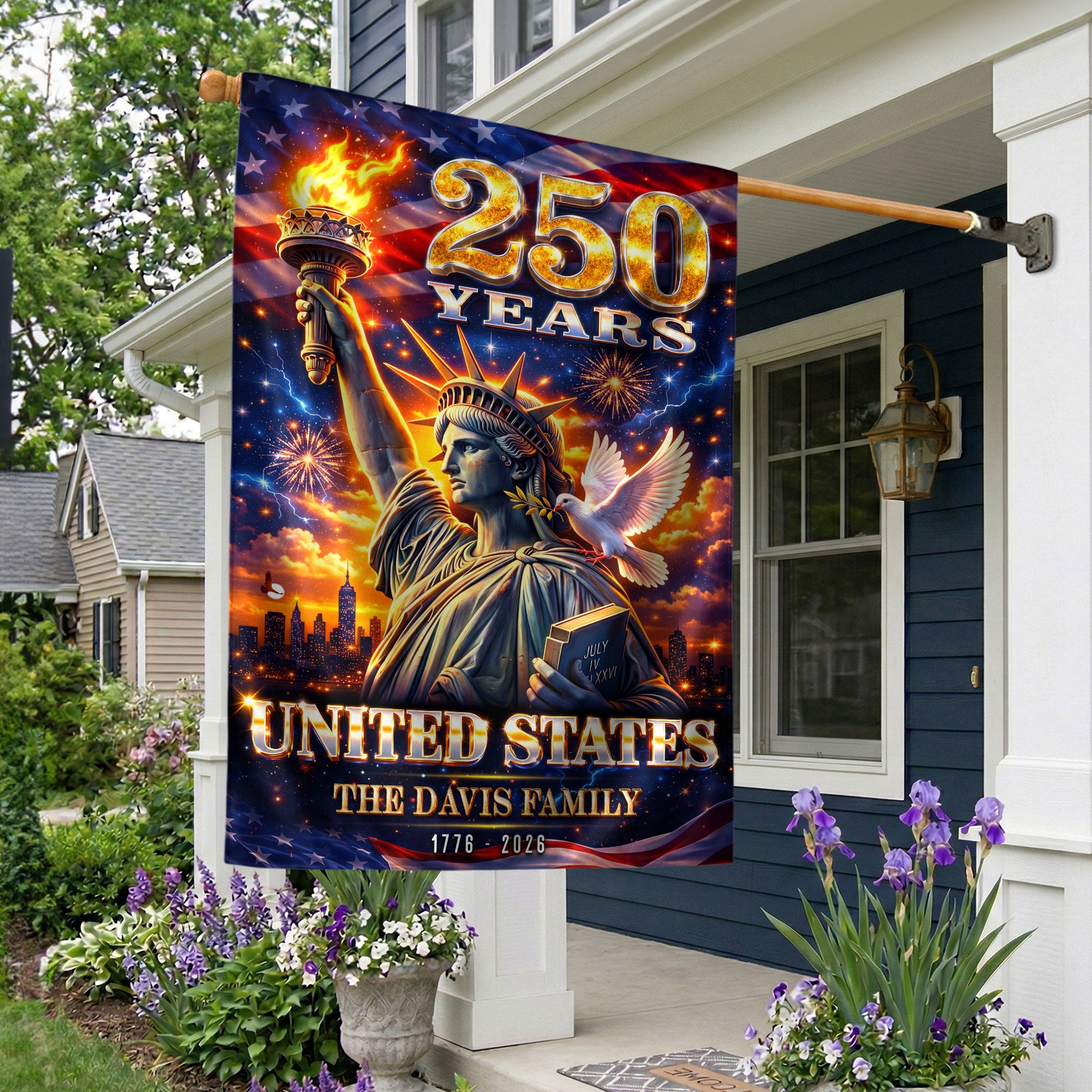 Custom Family Name 250th Anniversary Garden Flag Statue of Liberty USA 1776-2026