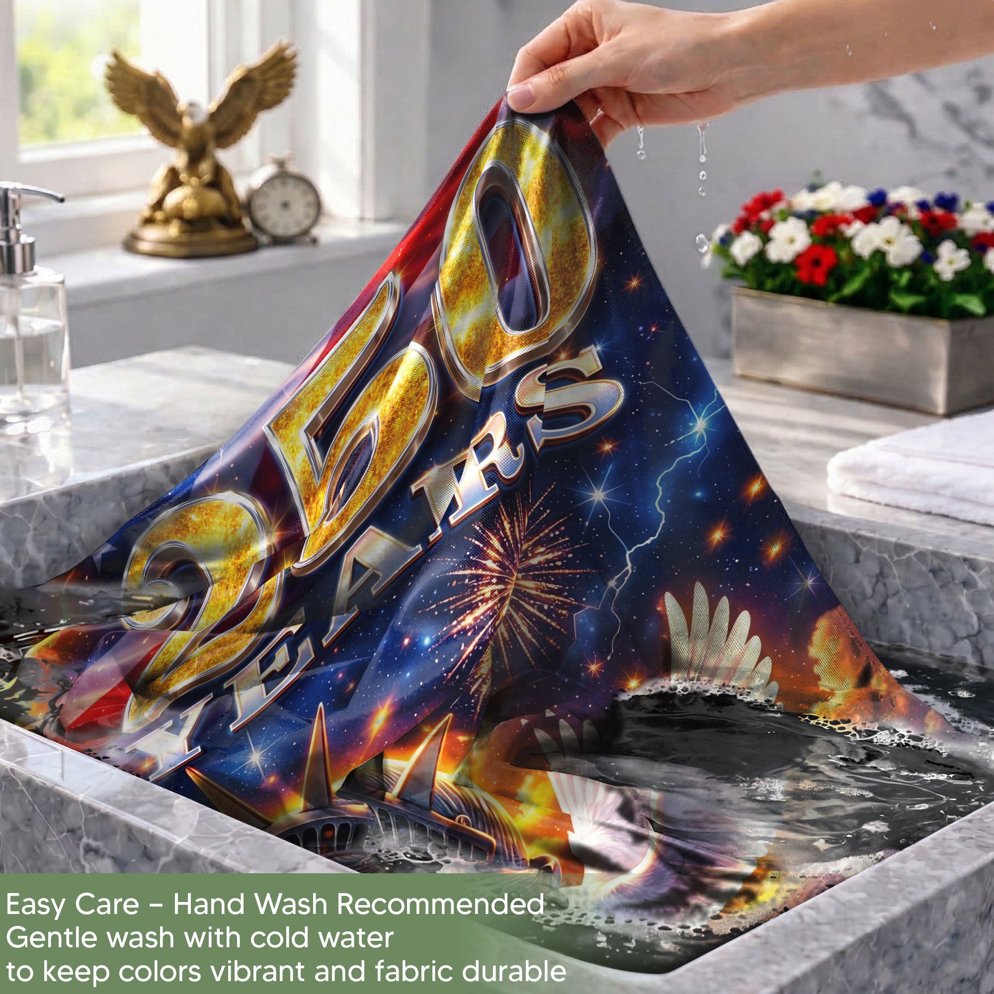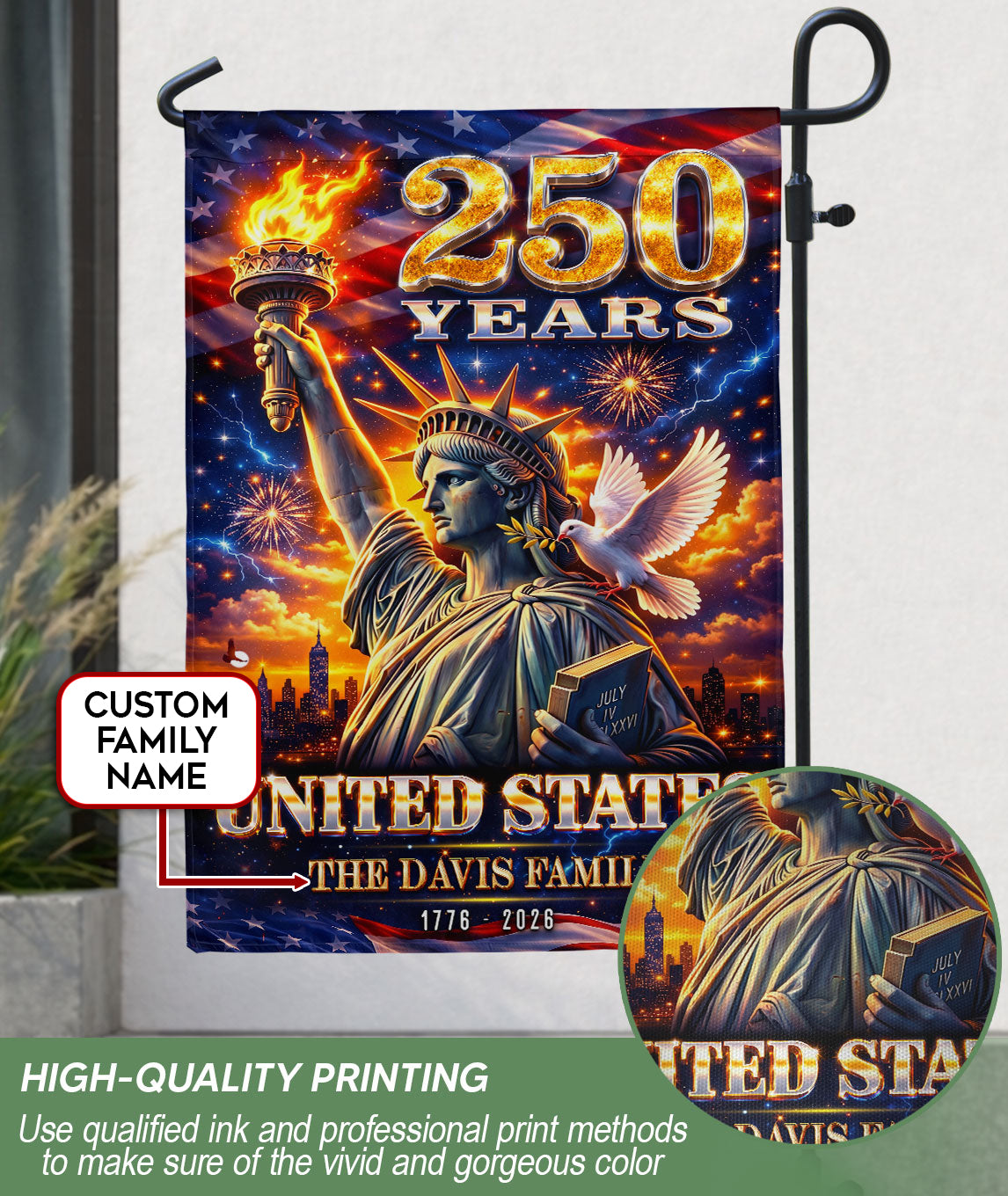 Celebrate the United States’ 250th anniversary with this custom family name garden flag. The design prominently features the iconic Statue of Liberty, surrounded by vibrant fireworks and a dove of peace, symbolizing America’s enduring spirit from 1776 to 2026. Made from durable, weather-resistant polyester fabric, this double-sided garden flag measures approximately 12.5 x 18 inches, perfect for outdoor display in gardens, porches, or patios. Personalize it with your family name to showcase your heritage and patriotism. Ideal for history enthusiasts, veterans, or as a thoughtful gift for the semiquincentennial milestone. Easy to attach to garden flag poles (sold separately) and built to withstand wind and elements for long-lasting display.