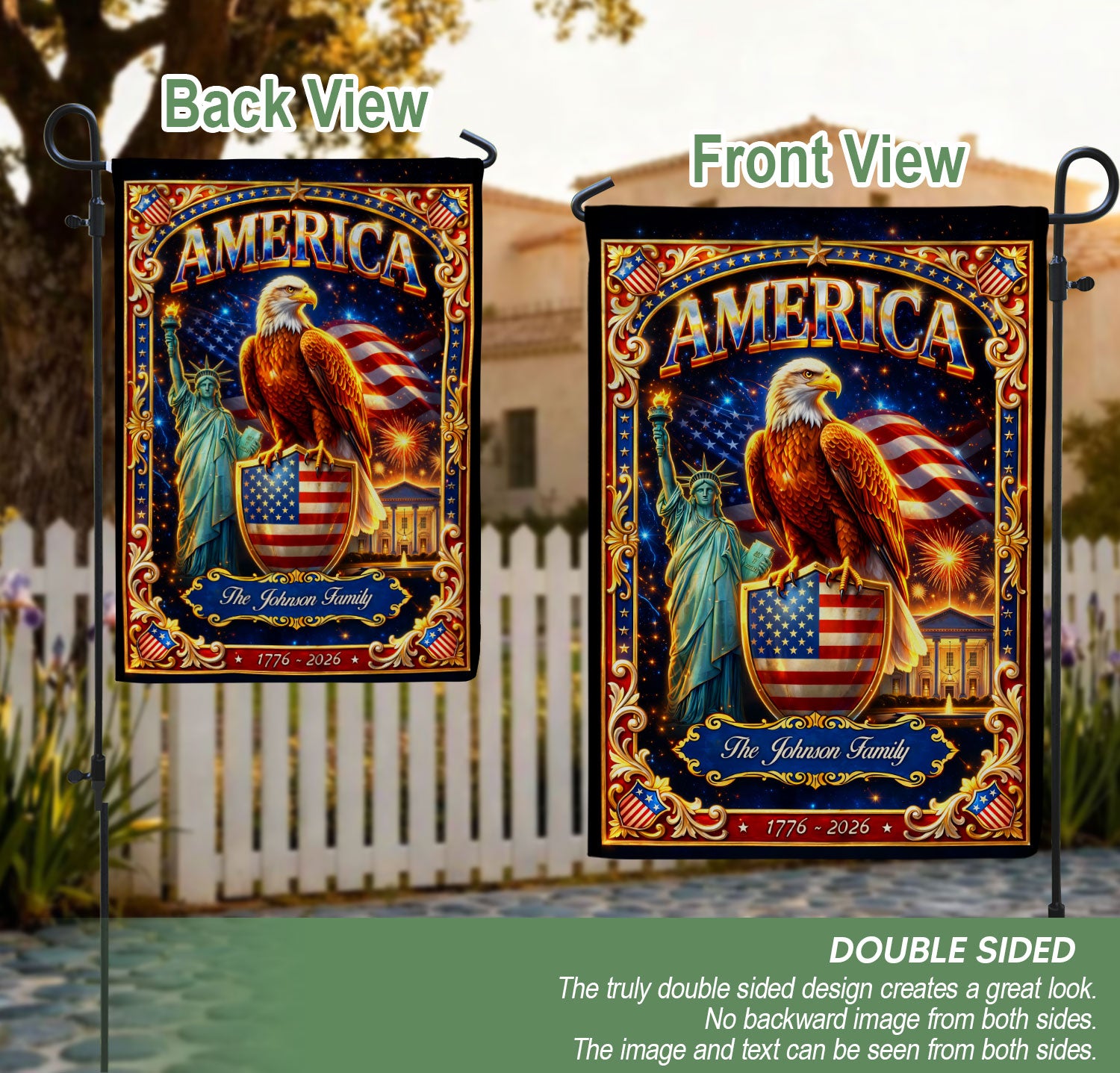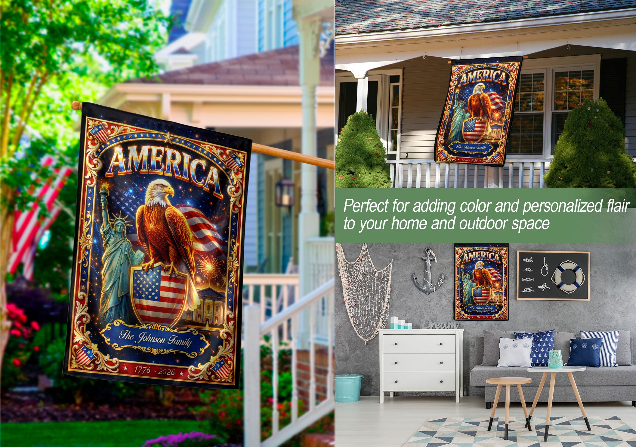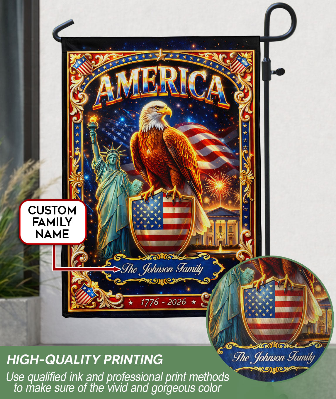 Custom Family Name 250th Anniversary Garden Flag USA Eagle Statue of Liberty 1776-2026