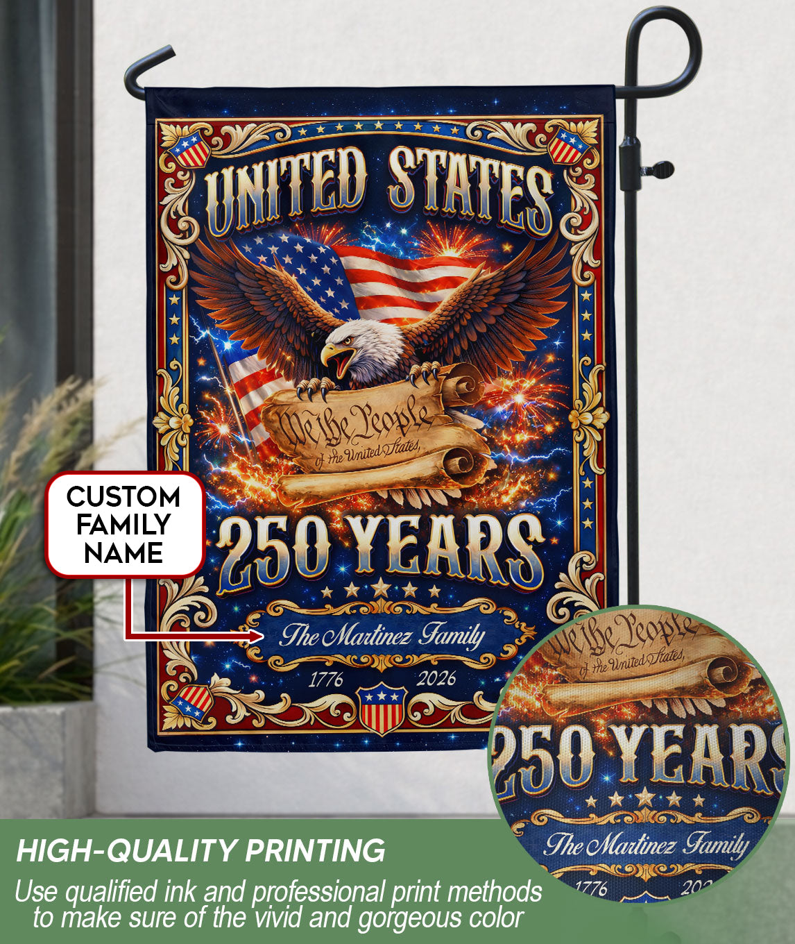 Custom Family Name 250th Anniversary Garden Flag USA Eagle We the People 1776-2026