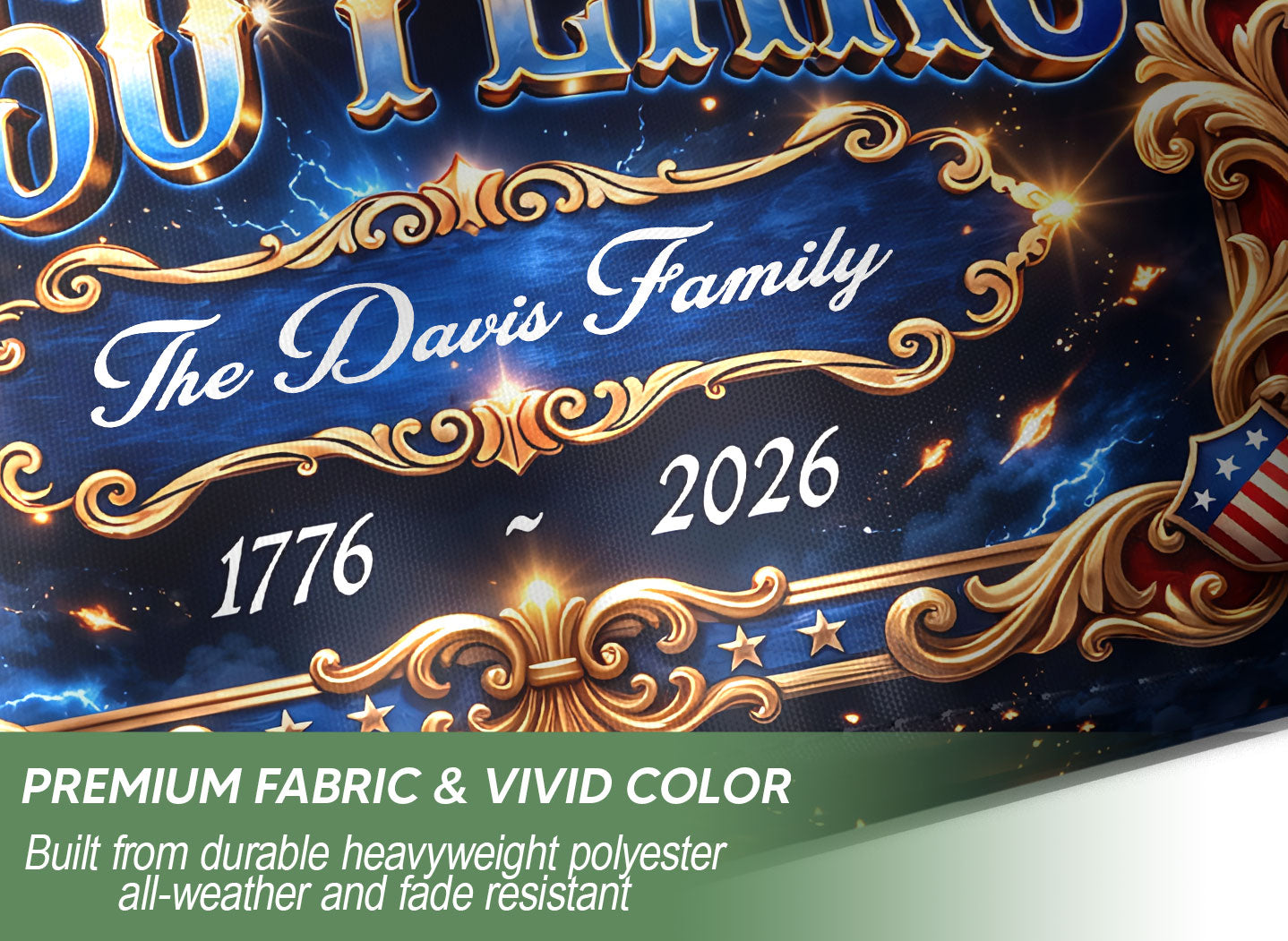 Celebrate America’s 250th anniversary from 1776 to 2026 with this custom garden flag. Personalize it with your family name alongside a majestic patriotic eagle and the iconic USA flag. Crafted from durable, weather-resistant fabric, this vibrant flag withstands outdoor elements for year-round display. Ideal for gardens, porches, yards, or patriotic events. The intricate details and bold colors make it a striking addition to your outdoor decor, honoring American freedom and heritage.