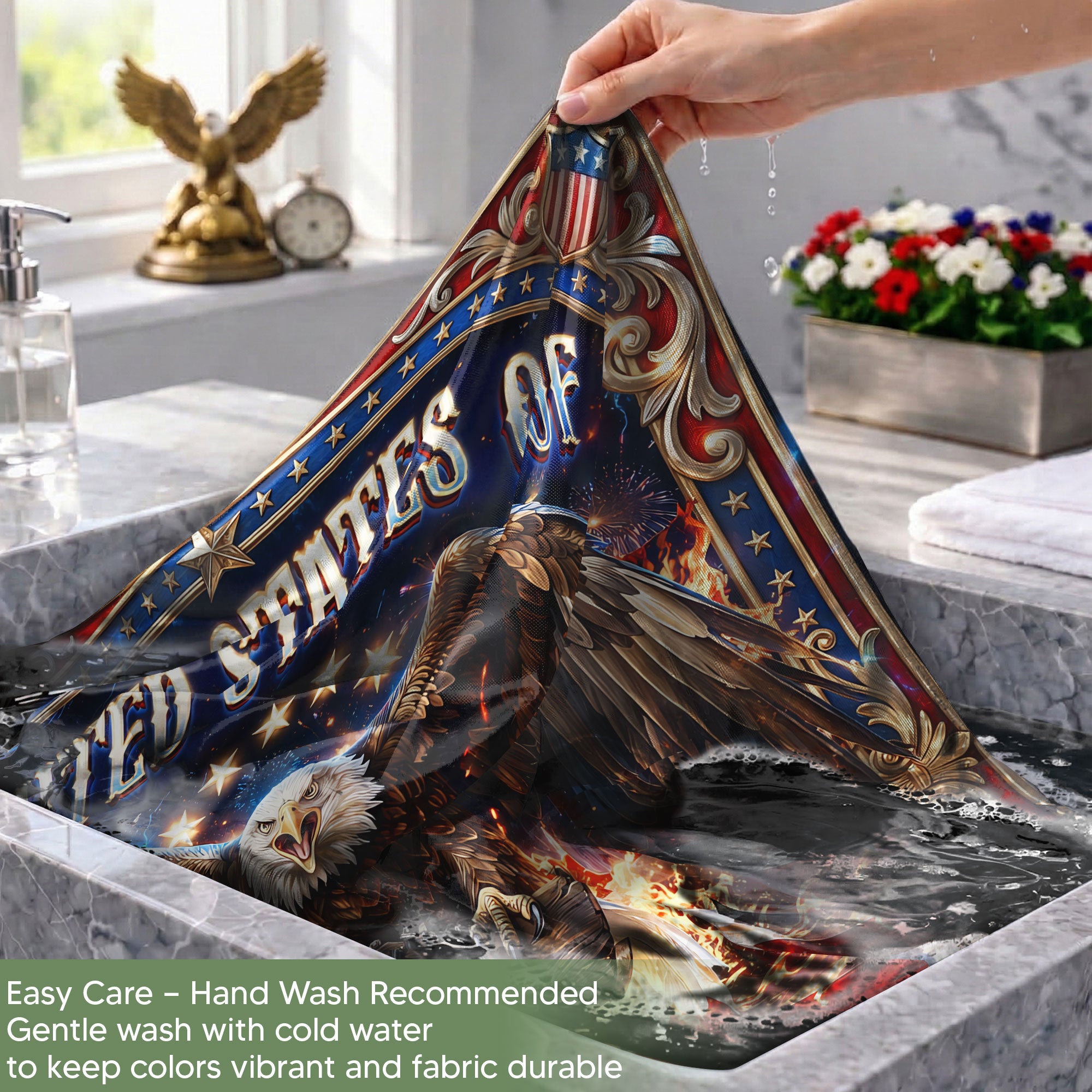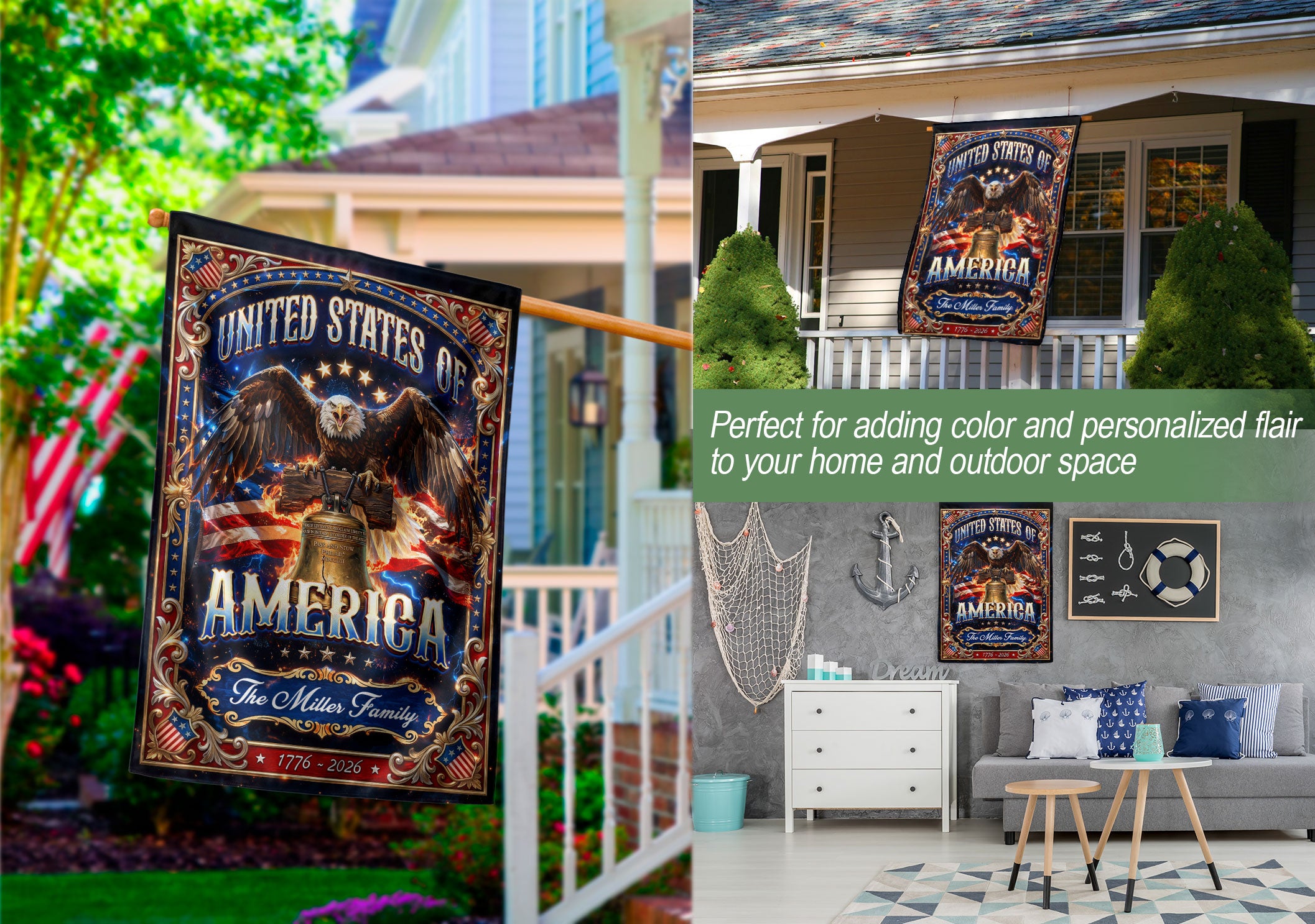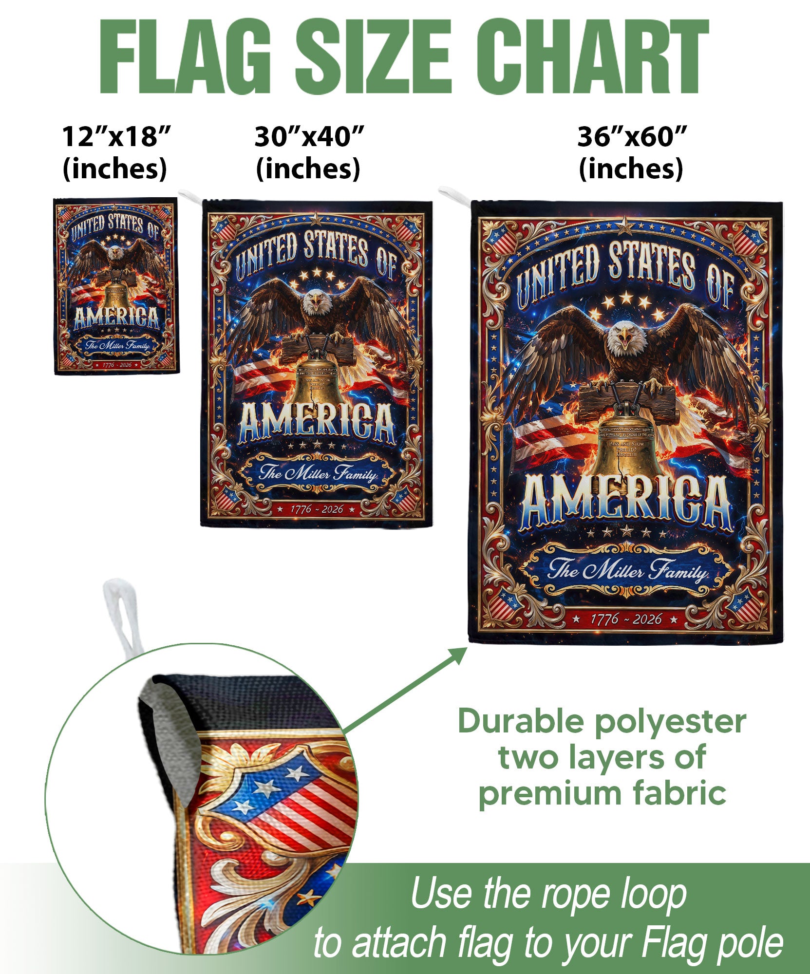 Celebrate American heritage and freedom with this custom garden flag featuring a majestic eagle perched on the iconic Liberty Bell, bold United States of America text, and 1776-2026 semiquincentennial design. Personalize it with your family name for a unique touch that showcases your pride. Crafted from high-quality, durable, weather-resistant fabric, this flag withstands outdoor elements for year-round display in gardens, porches, yards, or patios. Perfect for patriotic holidays like Fourth of July, Memorial Day, or everyday display to honor national history and family legacy.