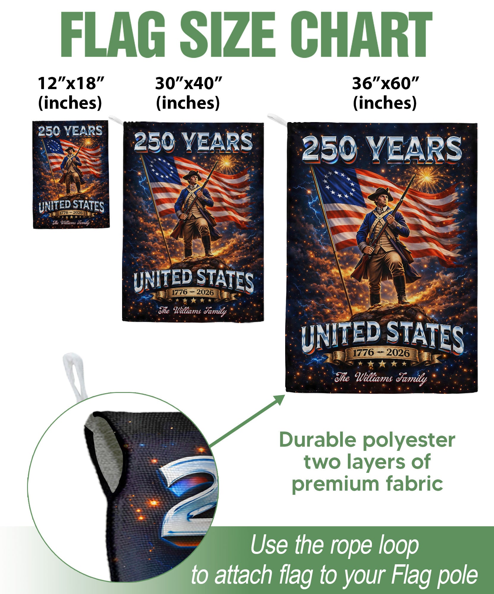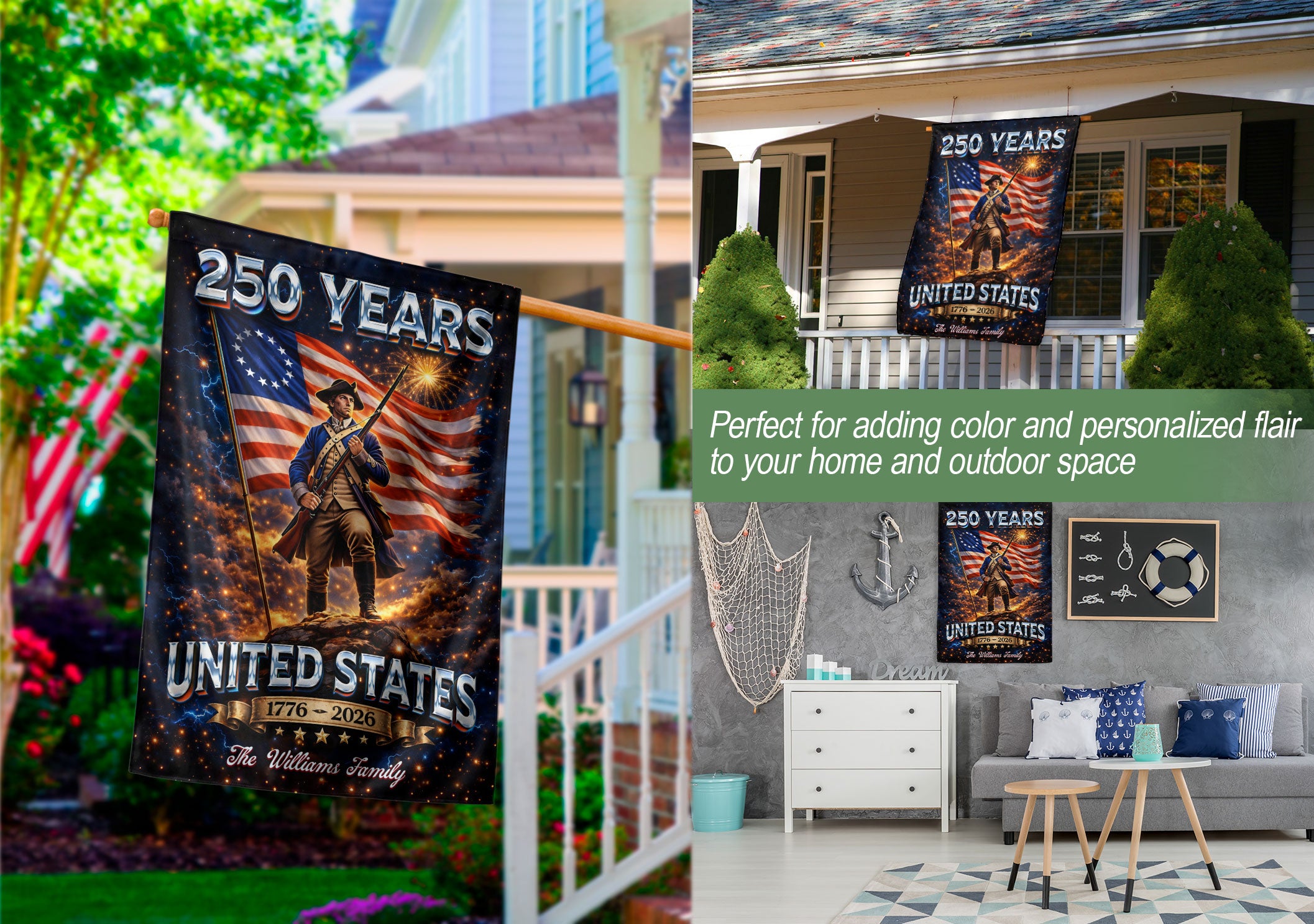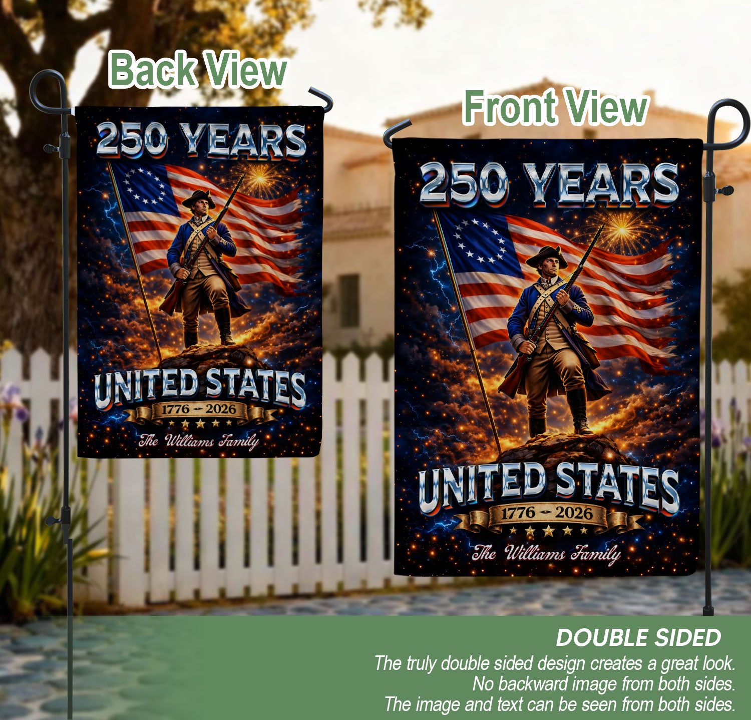 Celebrate America’s 250th anniversary from 1776 to 2026 with this custom garden flag. Personalize it with your family name alongside a bold patriotic soldier design and waving American flag. Crafted from durable, weather-resistant fabric, it withstands outdoor elements for year-round display in gardens, porches, yards, or patios. Vibrant colors and high-quality printing ensure lasting visibility and pride in your heritage. Perfect for Independence Day, Memorial Day, Fourth of July, or everyday USA patriotism. Easy to hang with a standard garden flag pole (not included). Show your love for freedom and family with this unique outdoor decor piece.