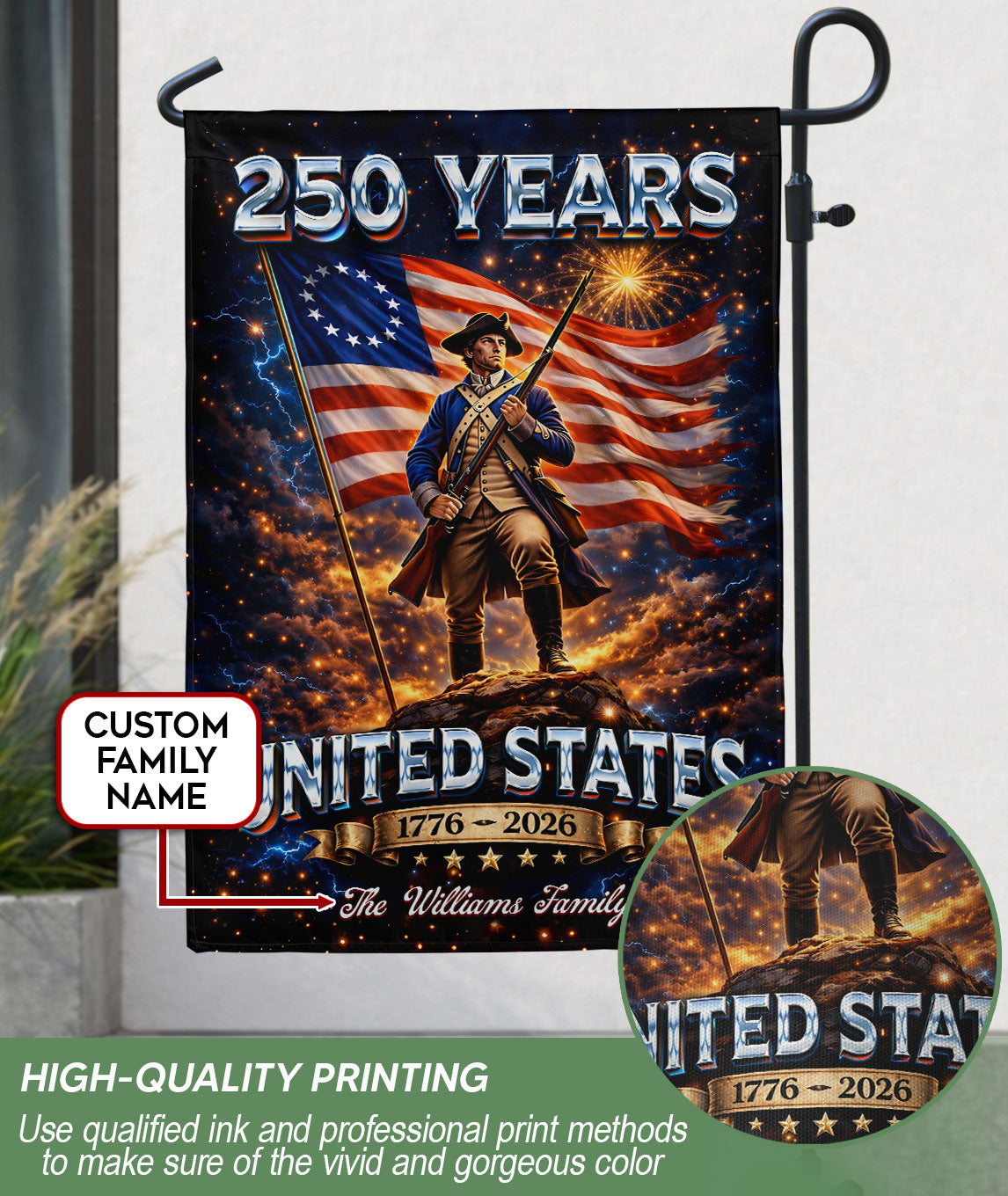 Custom Family Name Patriotic Soldier Garden Flag 250 Years 1776-2026 USA