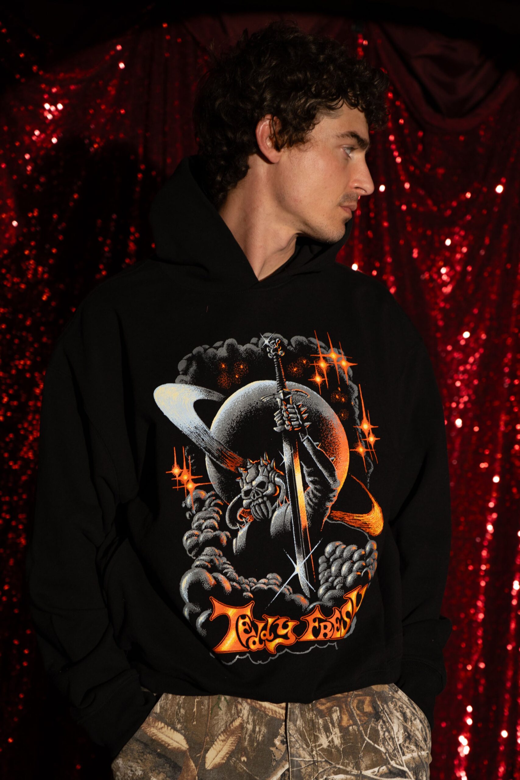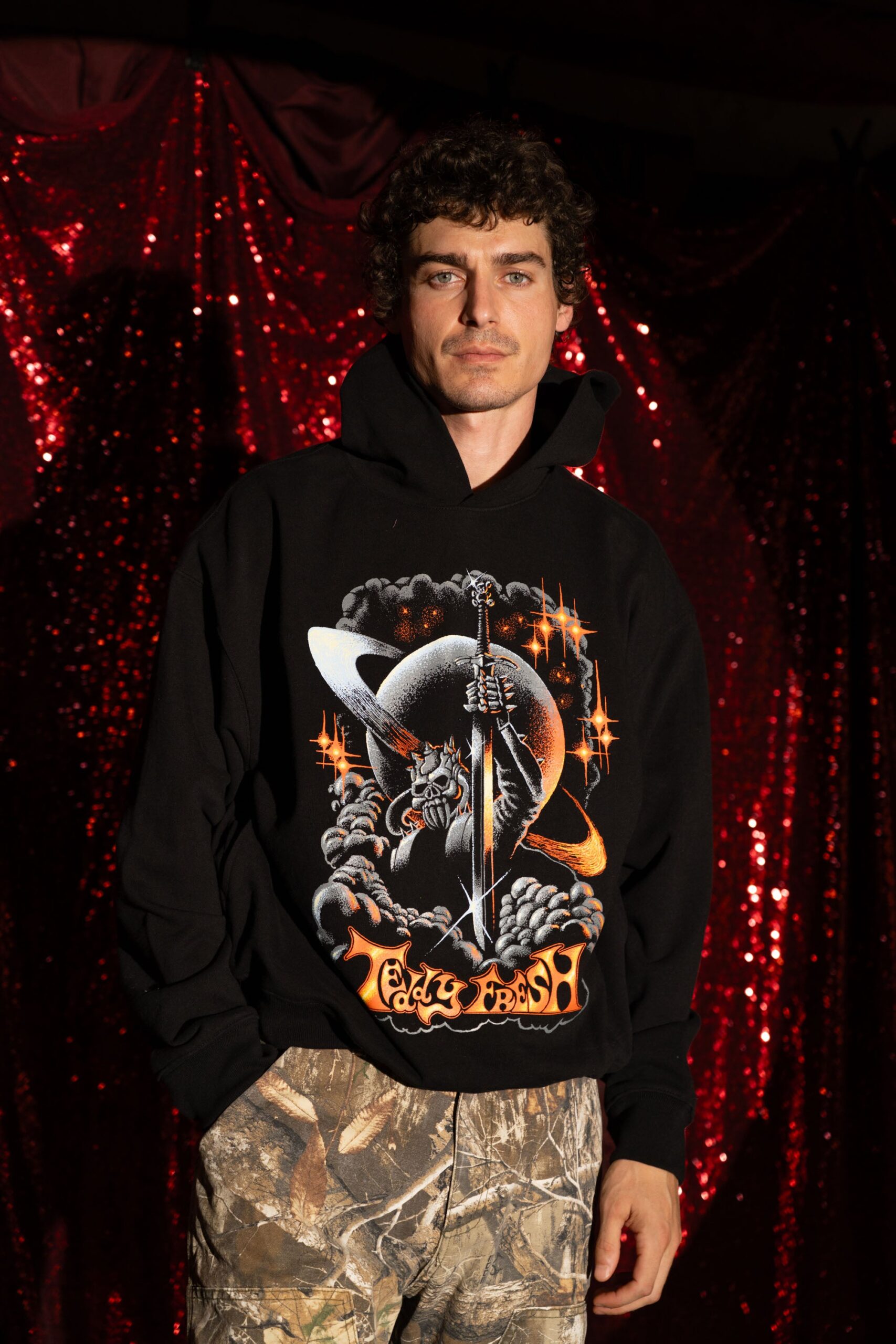 DETAILS Pullover hoodie Screenprinted artwork on front by Simon Heller Ribbed cuffs and waistband Side seam pockets 100% Cotton, 440gsm FIT Unisex oversized fit Size Medium: Chest: 53″ Length: 28″ Sleeve: 24.5″ Dustin is 6’2″ and wearing size M Model’s chest/bust: 38″ Model’s waist: 32″ Model’s hip: 39″