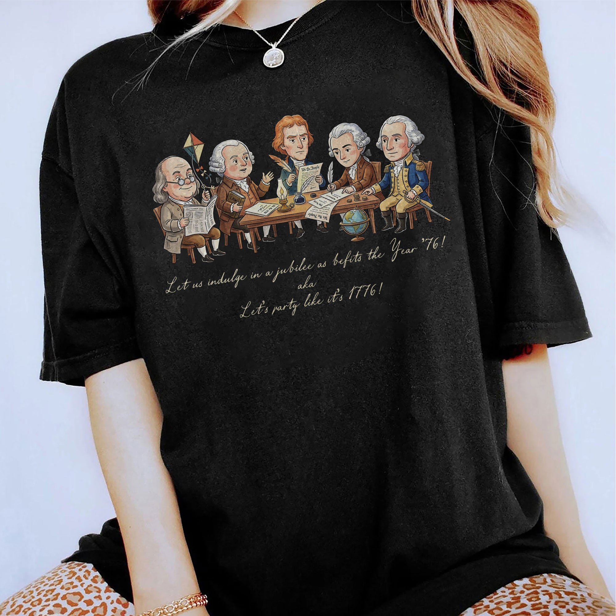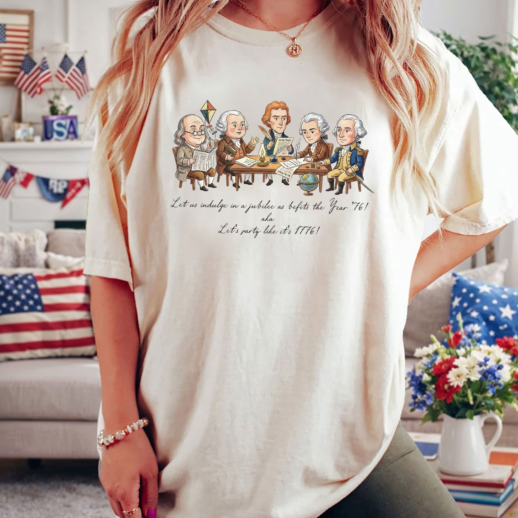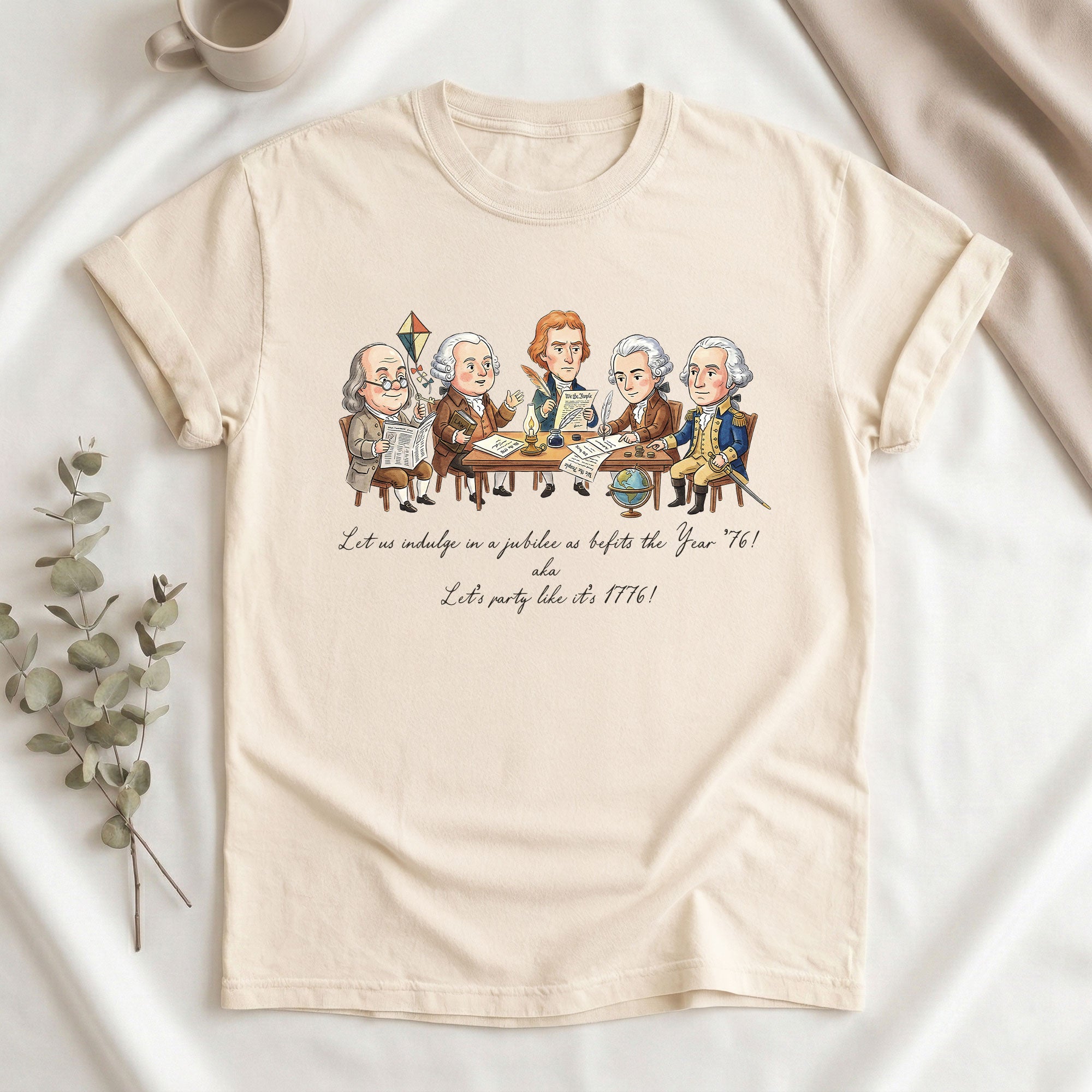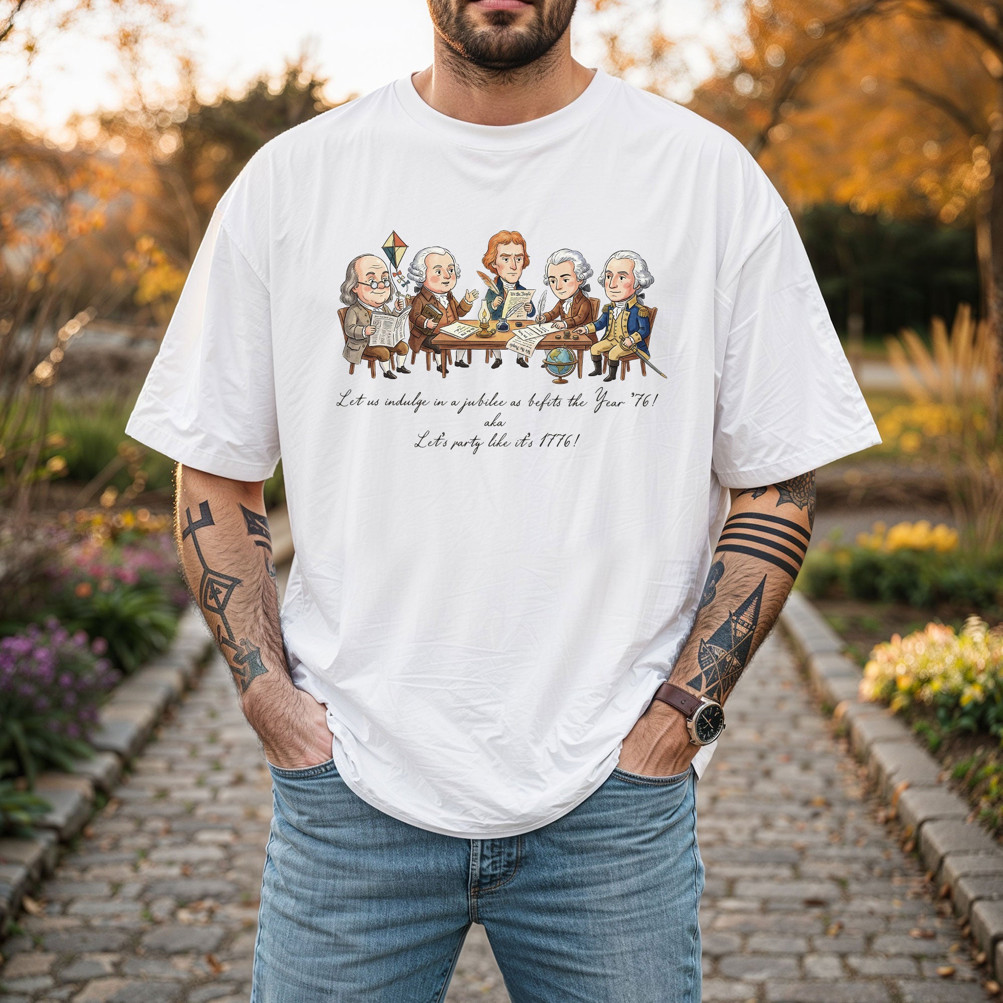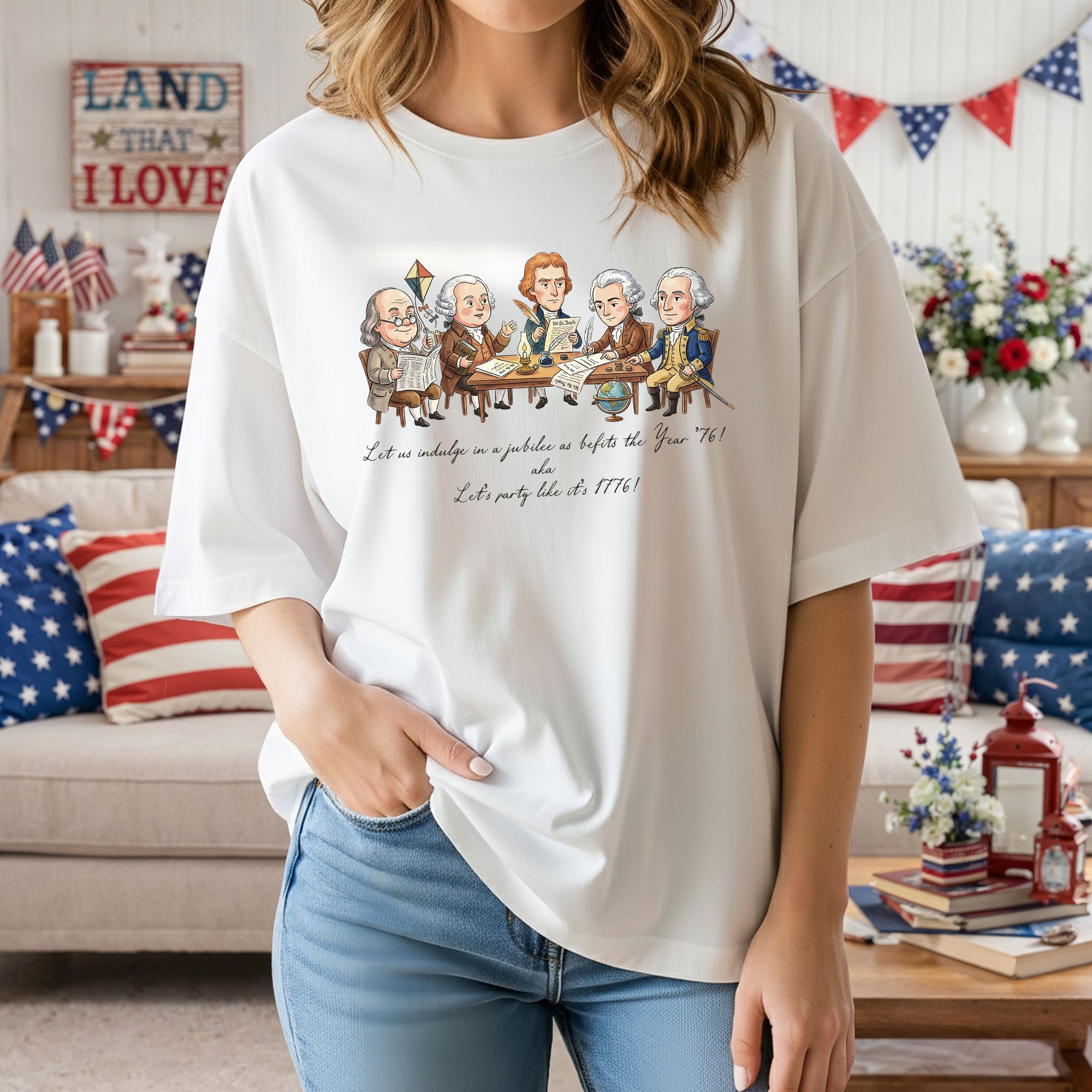 Celebrate America’s 250th anniversary with this vintage-style Founding Fathers 1776 T-shirt. Featuring a playful illustration of the nation’s founding leaders and the iconic quote “Let’s party like it’s 1776,” this classic-fit tee blends patriotism with humor. Made from soft, comfortable cotton for all-day wear, it’s ideal for Independence Day celebrations, patriotic events, historical reenactments, or casual everyday outfits. The retro design captures the spirit of 1776 while offering a fun twist on American history. Available in multiple sizes for men, women, and unisex fit. Perfect for history buffs, patriots, and anyone ready to party like it’s the birth of the USA.