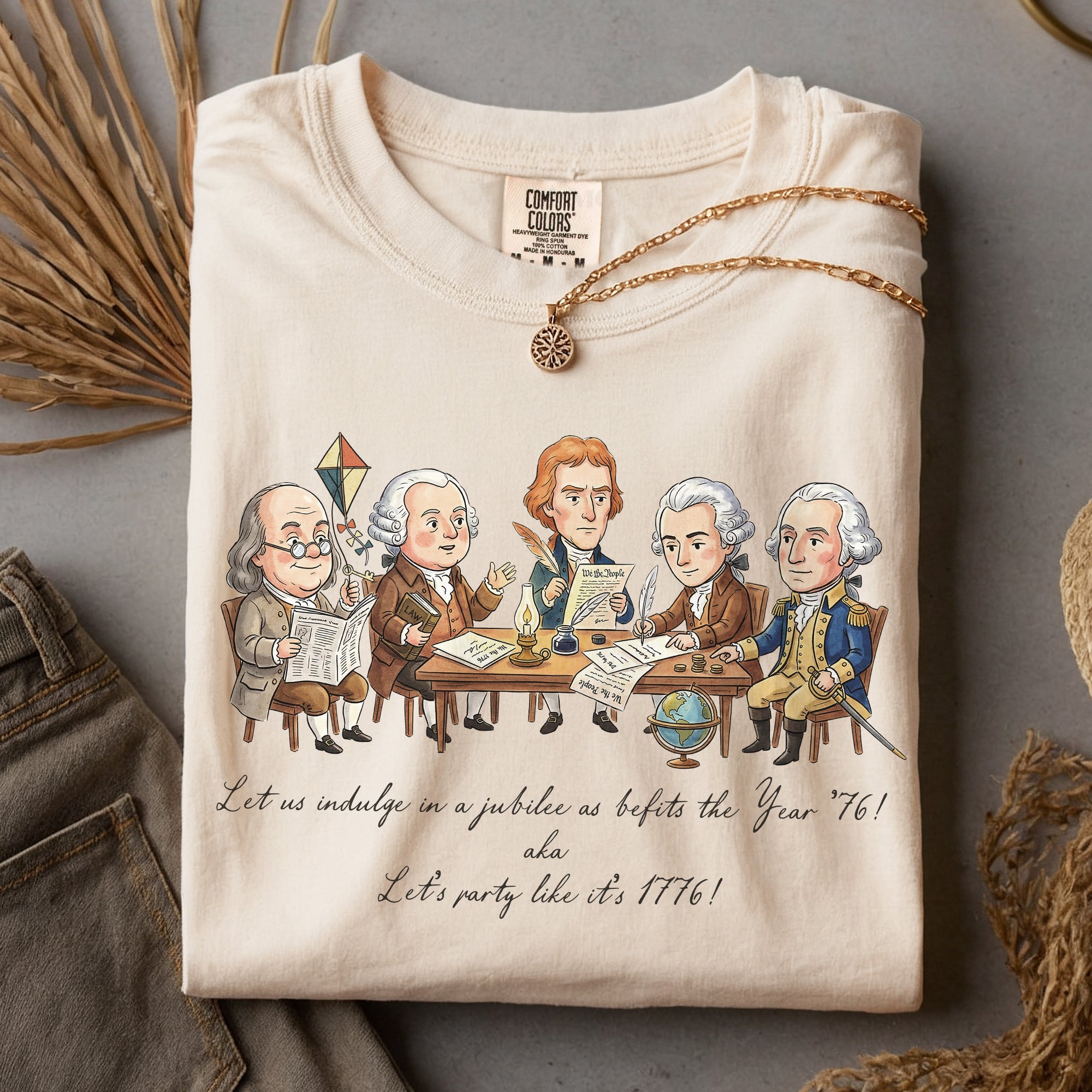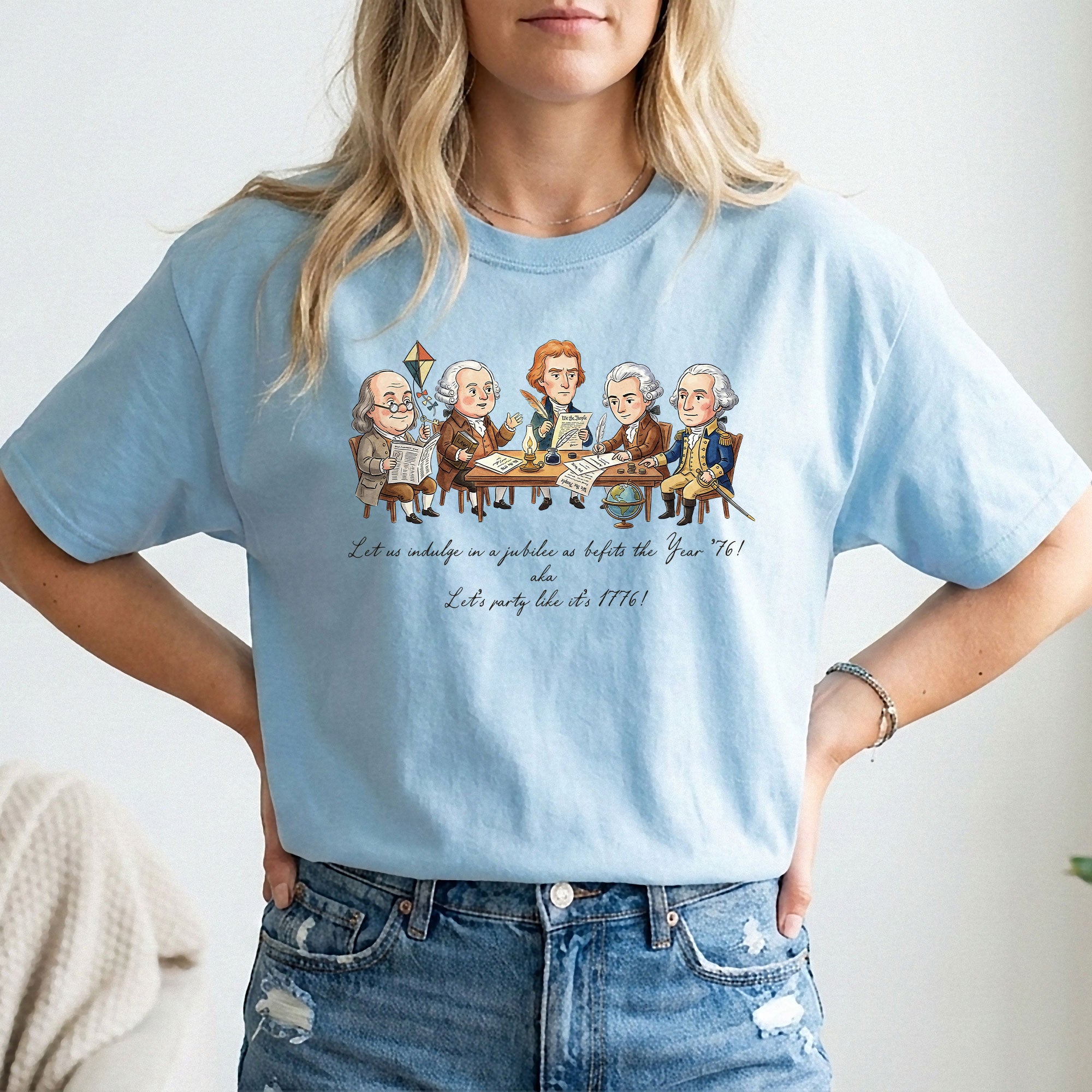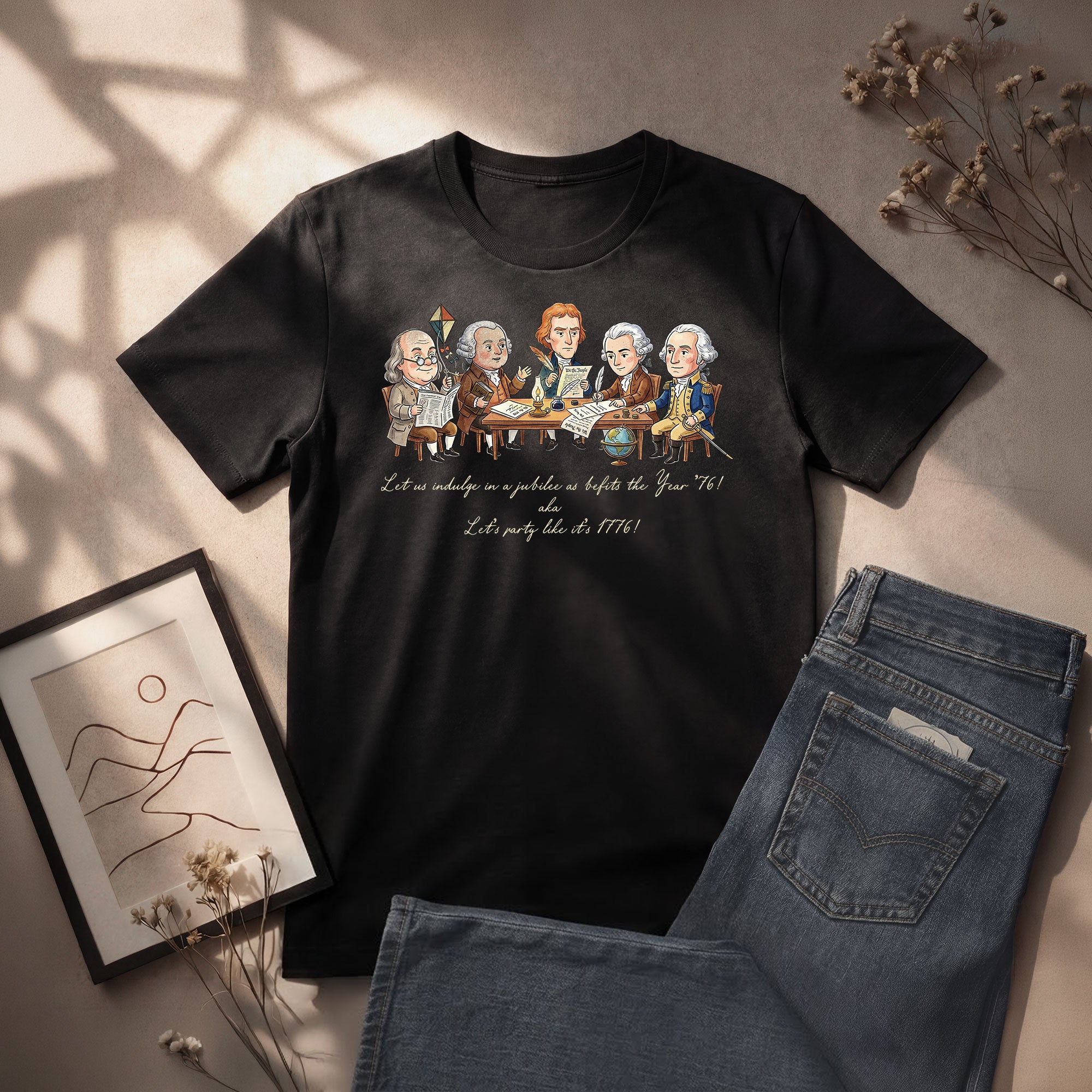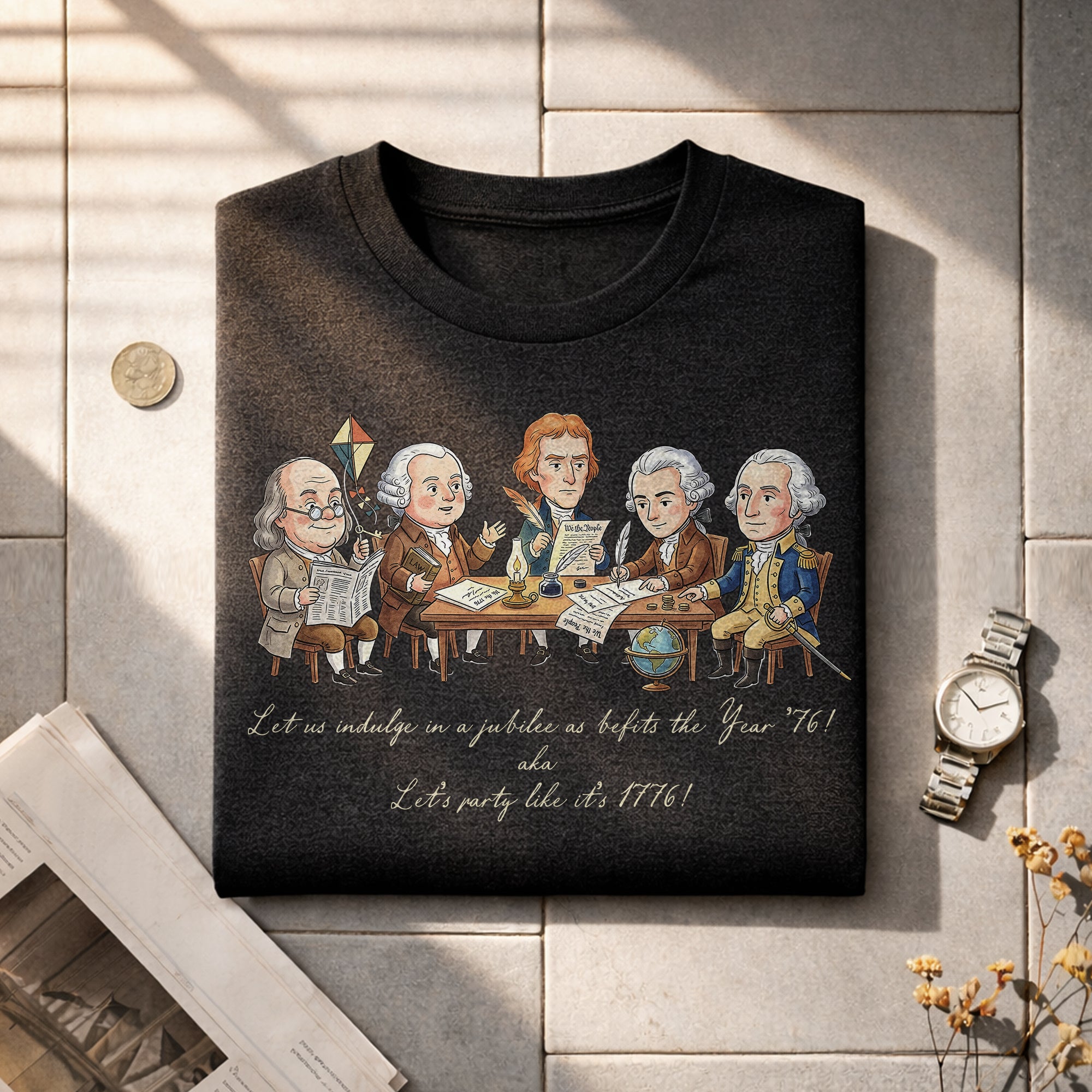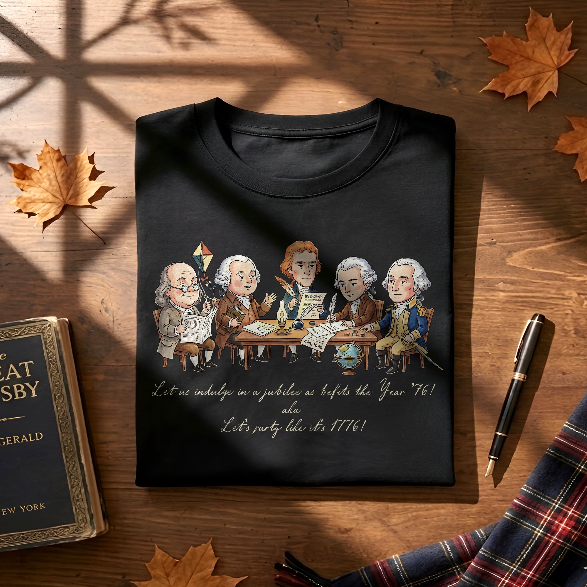 Celebrate America’s 250th anniversary with this vintage-style Founding Fathers 1776 T-shirt. Featuring a playful illustration of the nation’s founding leaders and the iconic quote “Let’s party like it’s 1776,” this classic-fit tee blends patriotism with humor. Made from soft, comfortable cotton for all-day wear, it’s ideal for Independence Day celebrations, patriotic events, historical reenactments, or casual everyday outfits. The retro design captures the spirit of 1776 while offering a fun twist on American history. Available in multiple sizes for men, women, and unisex fit. Perfect for history buffs, patriots, and anyone ready to party like it’s the birth of the USA.
