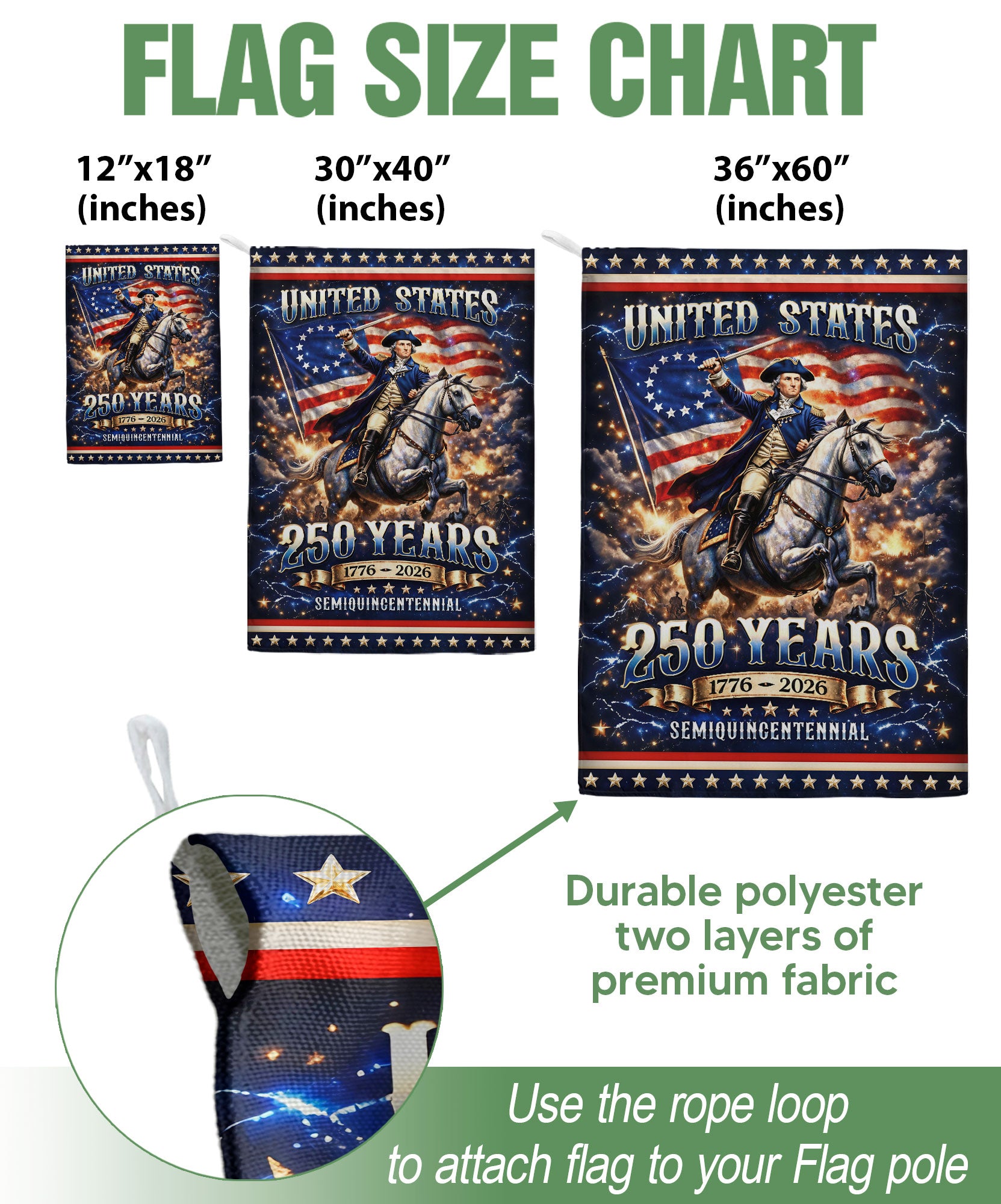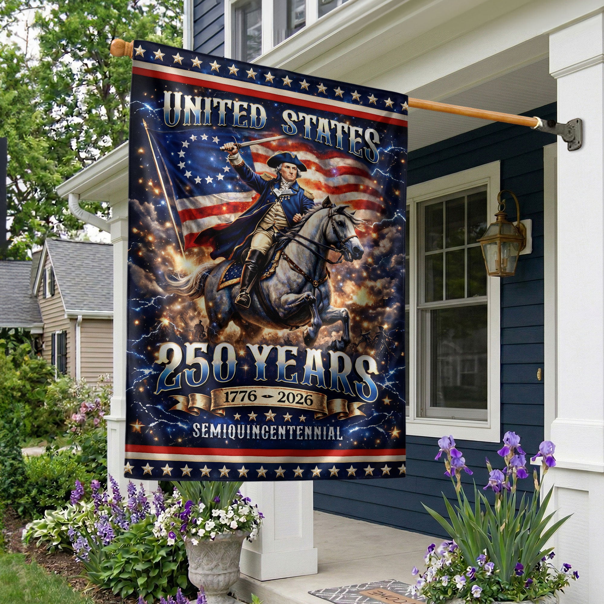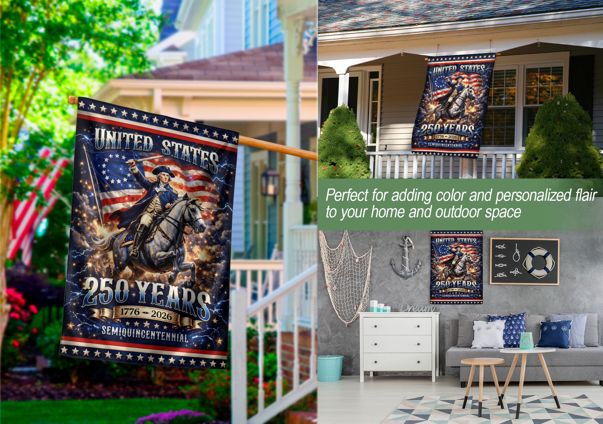 Celebrate the 250th anniversary of the United States from 1776 to 2026 with this striking double-sided house flag featuring George Washington as the Revolutionary War general on horseback. Crafted for outdoor durability, this flag honors the leadership, courage, and sacrifice that shaped the nation during the American Revolution. Perfect for displaying on your porch, garden flagpole, or home entrance to showcase patriotic pride. The high-quality, weather-resistant fabric ensures vibrant colors and clear details on both sides, making it ideal for holidays, historical commemorations, or everyday American heritage displays. Easy to hang and built to withstand the elements.