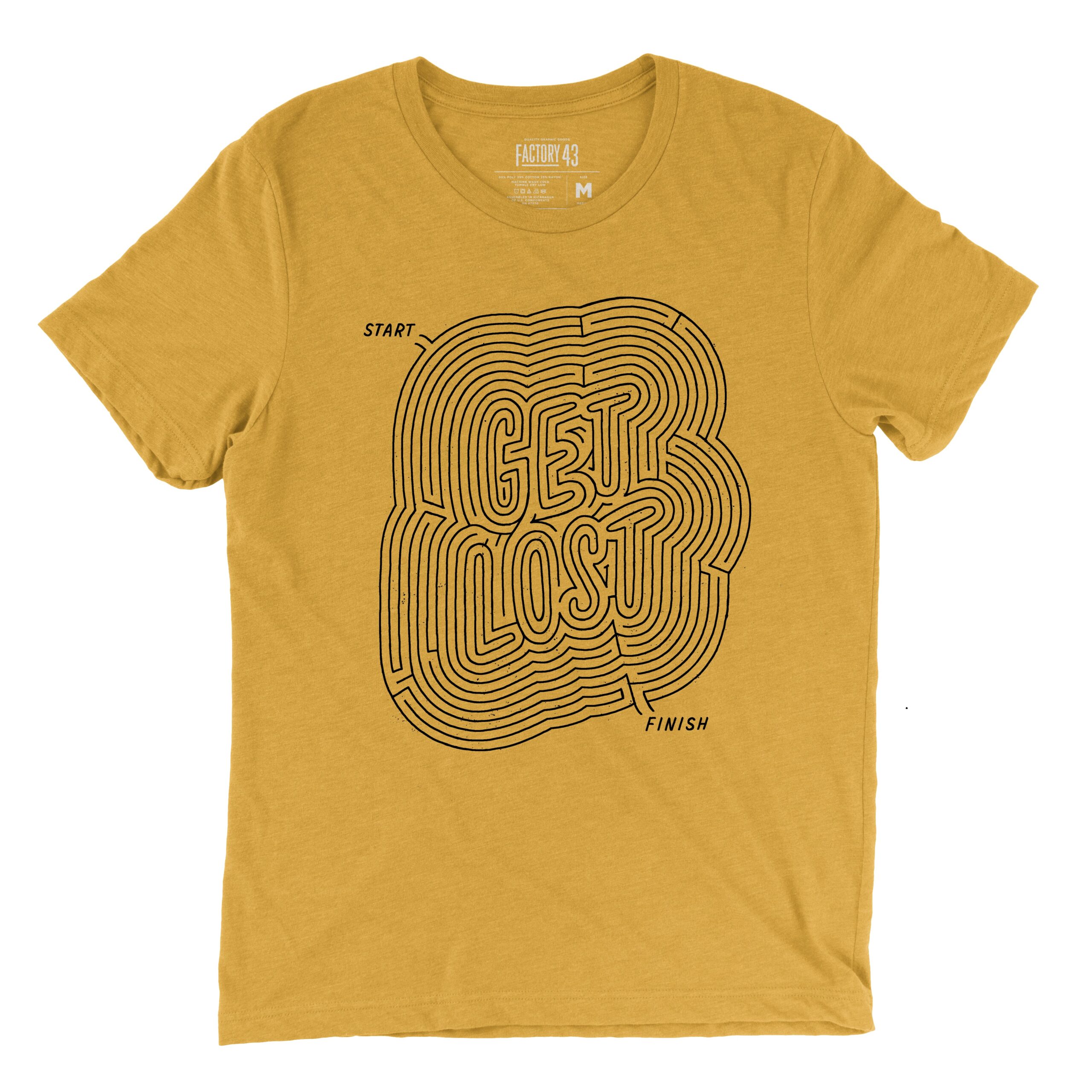 Soft cotton-poly tee in Heather Mustard, Dust, or Dusty Blue. Discharge print 52% combed and ring-spun cotton, 48% polyester blend