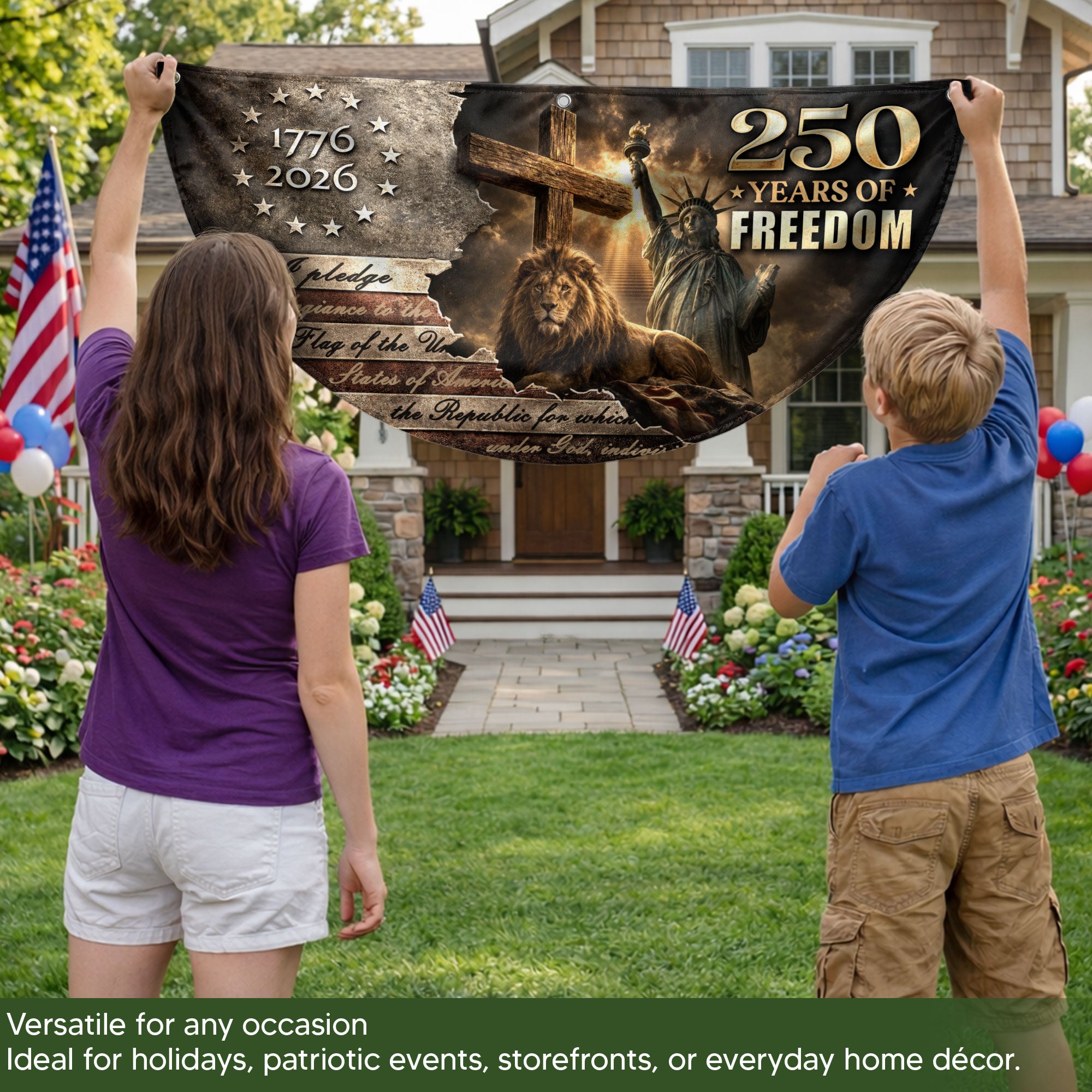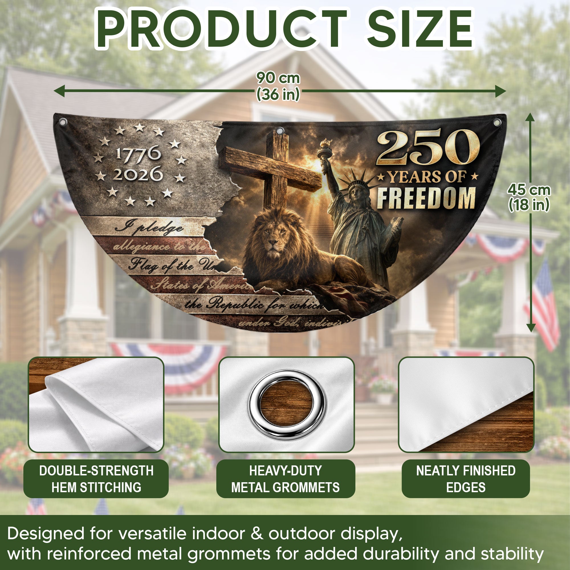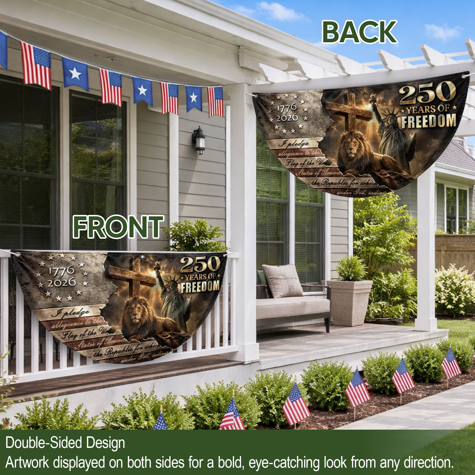 Celebrate America’s 250th anniversary with the God Bless America 250 Years Fence Flag, spanning 1776-2026. This double-sided banner features a striking lion and cross design intertwined with patriotic USA elements, symbolizing courage, faith, and the nation’s enduring strength. Perfect for fences, porches, or gardens, it boldly displays Christian patriotism and national pride. Crafted for durability to withstand outdoor conditions, the high-quality printed flag ensures vibrant colors and clear details on both sides. Ideal for Independence Day, Memorial Day, or everyday display to honor American heritage and spiritual values.