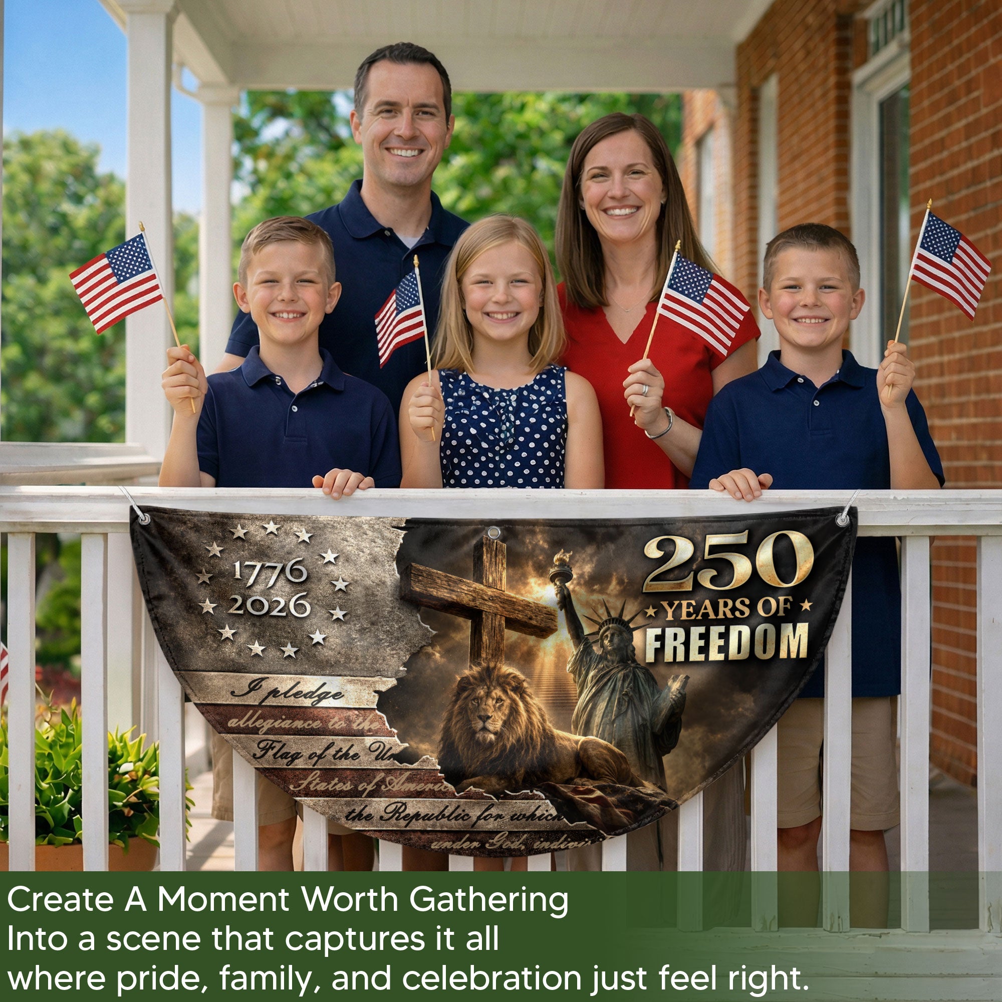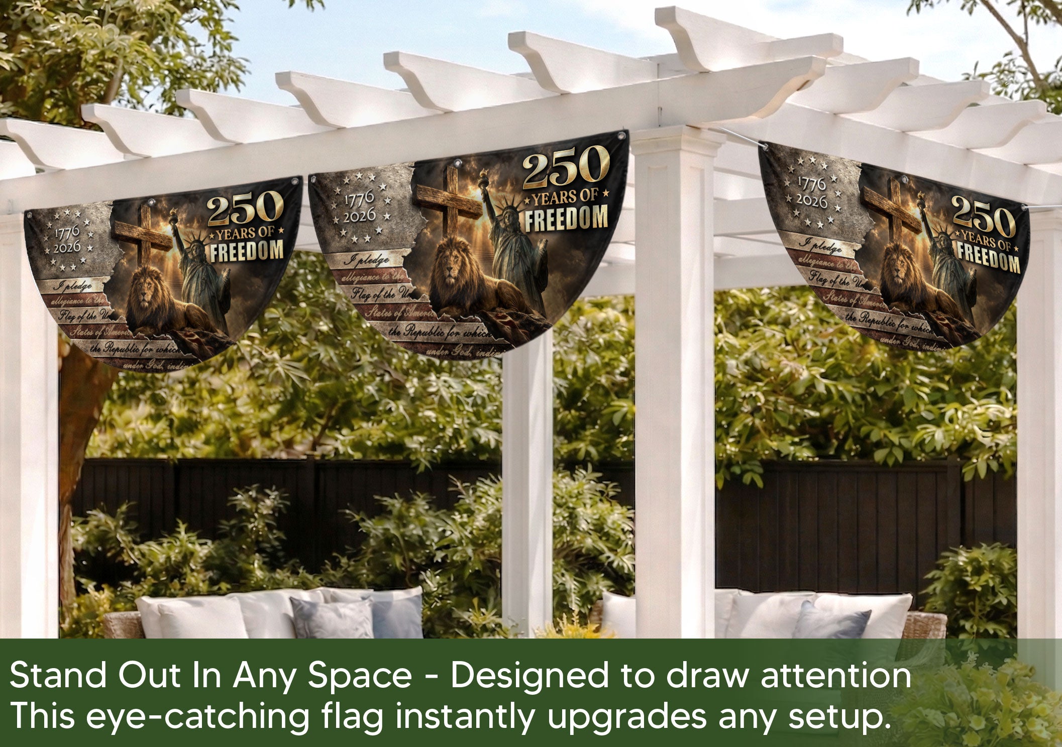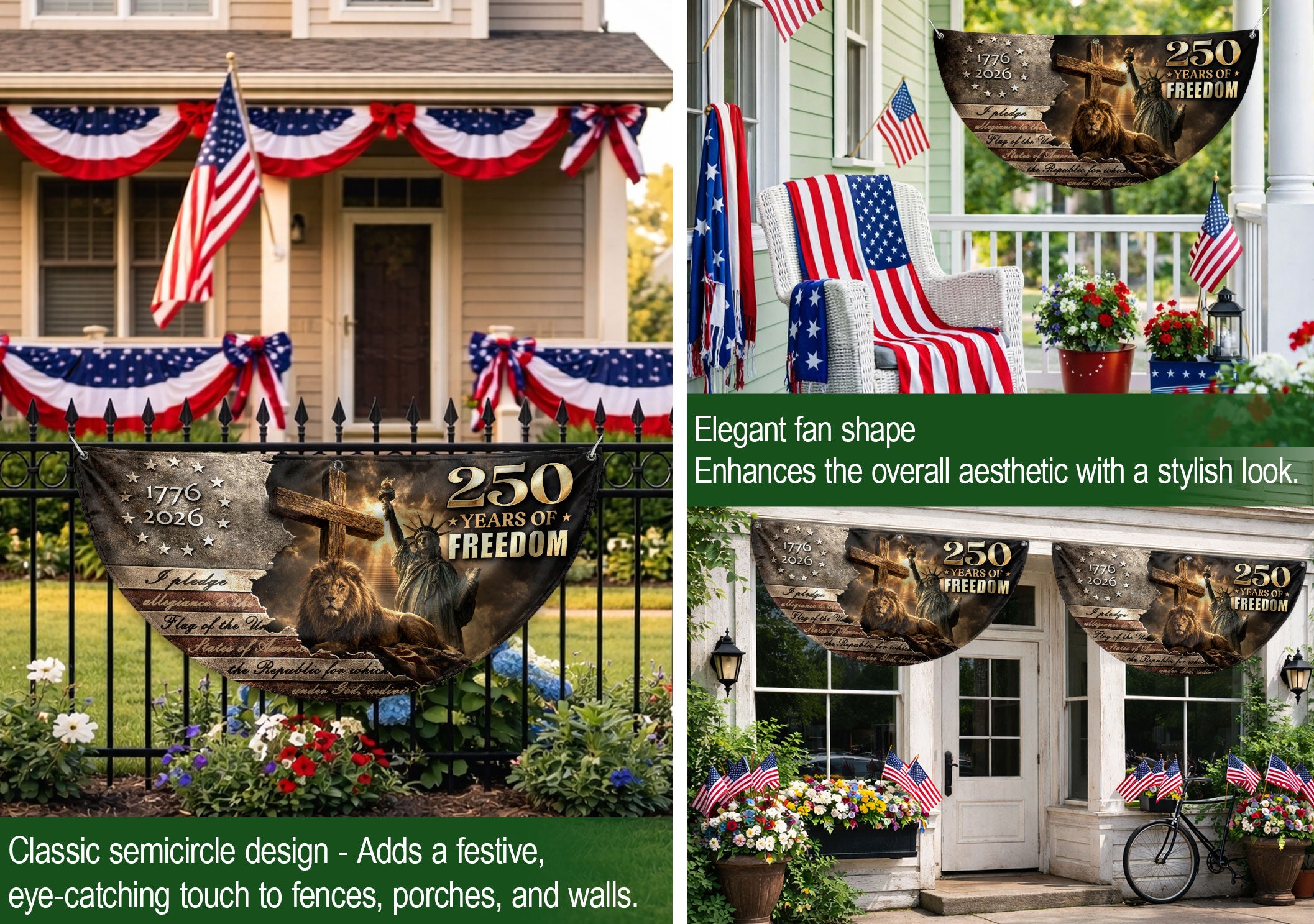 Celebrate America’s 250th anniversary with the God Bless America 250 Years Fence Flag, spanning 1776-2026. This double-sided banner features a striking lion and cross design intertwined with patriotic USA elements, symbolizing courage, faith, and the nation’s enduring strength. Perfect for fences, porches, or gardens, it boldly displays Christian patriotism and national pride. Crafted for durability to withstand outdoor conditions, the high-quality printed flag ensures vibrant colors and clear details on both sides. Ideal for Independence Day, Memorial Day, or everyday display to honor American heritage and spiritual values.
